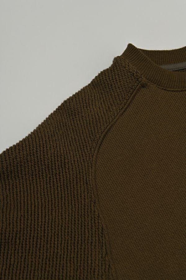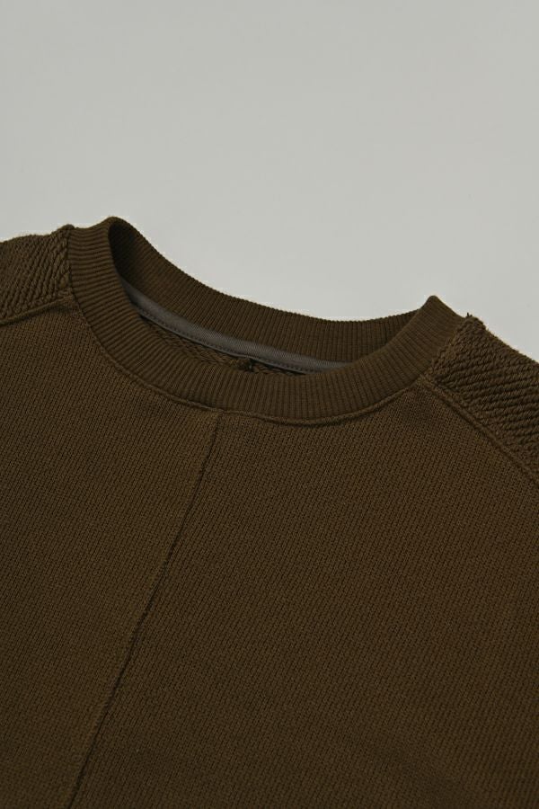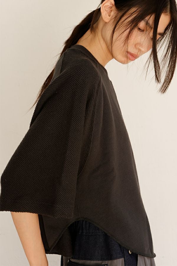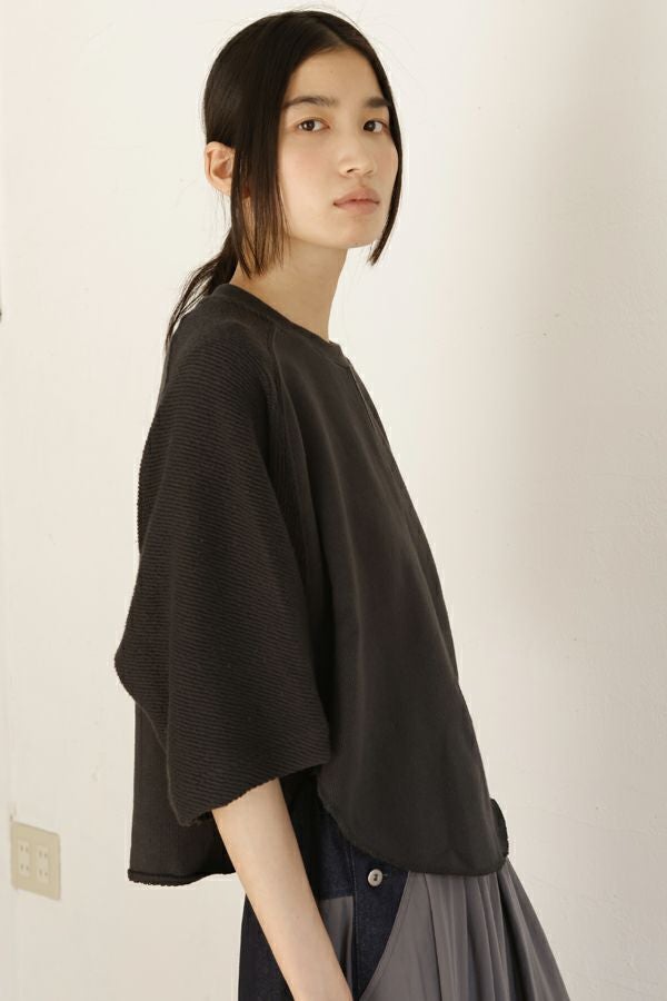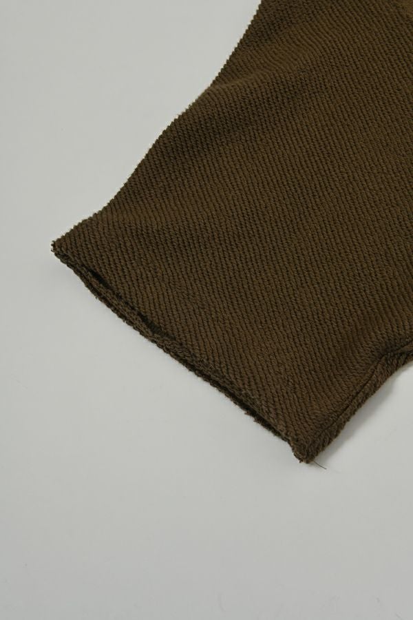 ラフな抜け感が大人の余裕を感じさせるプルオーバー。 毎シーズン人気のトリニティ裏毛を使用。表面は太番手の糸でざっくりとしたラフな表情が特徴的で、見た目よりも軽く、触ると柔らかくふわっとソフトな触り心地。 ユニークで可愛く、裏面と表面とで表情の違うこの生地を活かすために、両面使いのデザインにしています。袖は動きやすくするための「フリーダムスリーブ」という昔のパターンの作り方を採用しています。 腕を快適に動かせる、機能面にも配慮した仕様になっています。