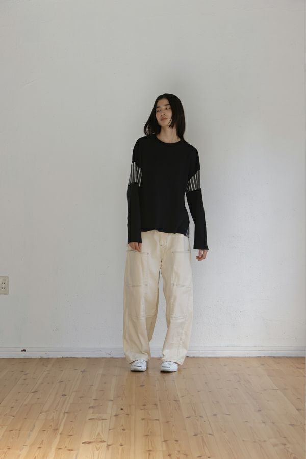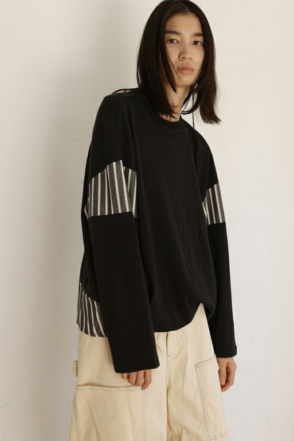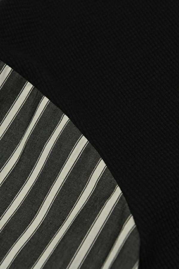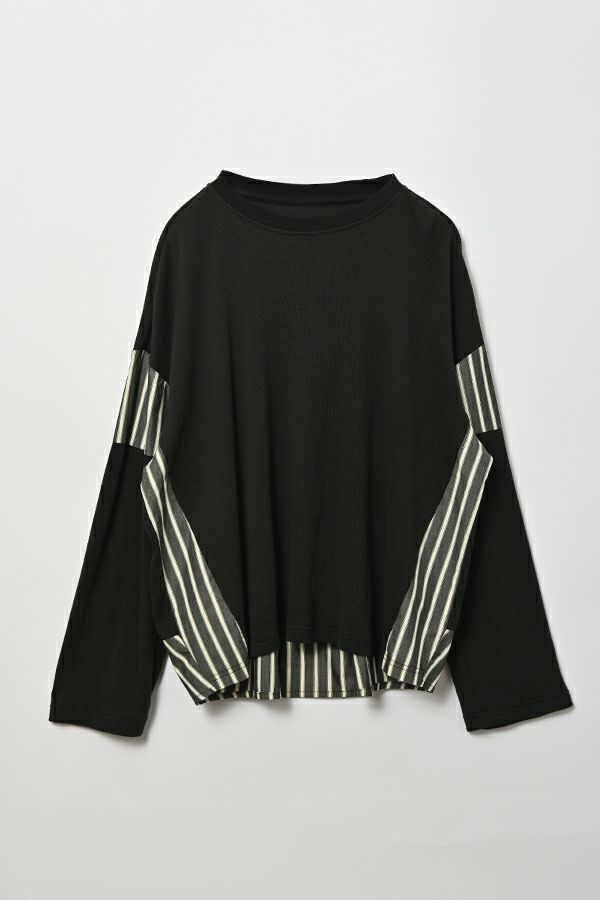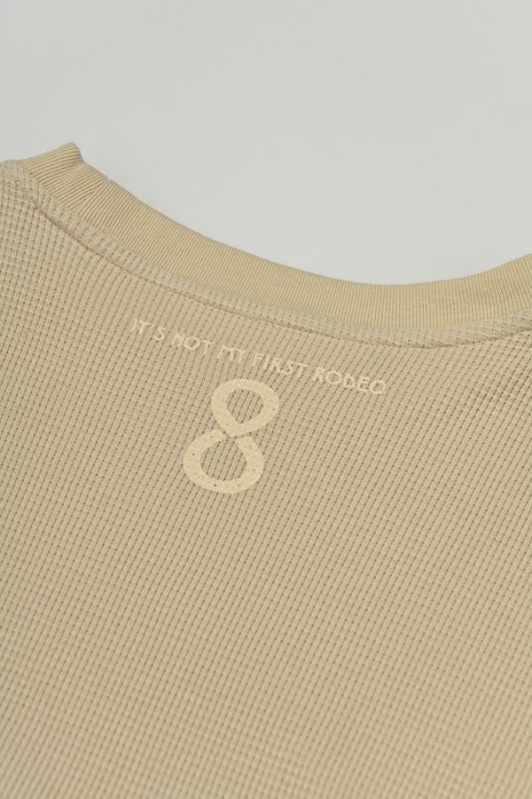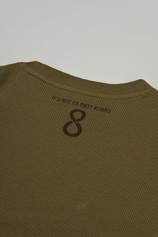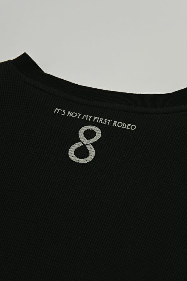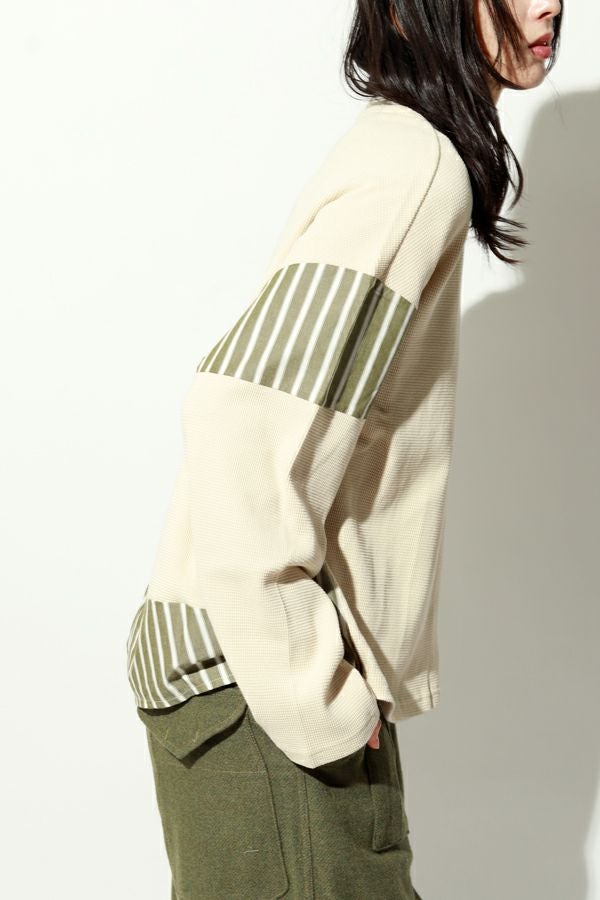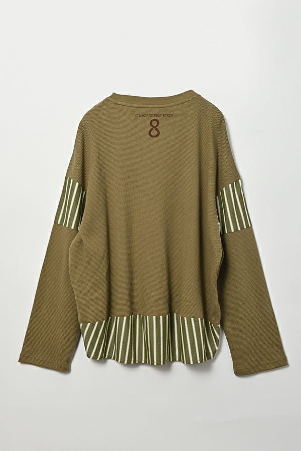 視線集める、大人な異素材MIXプルオーバー。 凹凸感のあるコットンサーマル素材は、吸水性や吸湿性に優れていて汗をかいてもベタつかず、空気が通るので通気性素材もあり、快適に着られます。 メンズっぽい雰囲気のある素材を使用しています。部分的に使用したストライプが視線を集め、華奢見え効果もプラスされた技ありな仕掛けに。 ヒップ部分にカープができるパターン設計で、広がらず、体になじんだシルエットになっています。 ゆったりとした素材は、袖をロールアップして着用してもらうのがお勧めです。 ●バックプリントは、ロデオに関連した8秒の数字と名言が記載されています。 「Its not my first RODEO」・・・前にもあったことだから大丈夫さ、の意。
