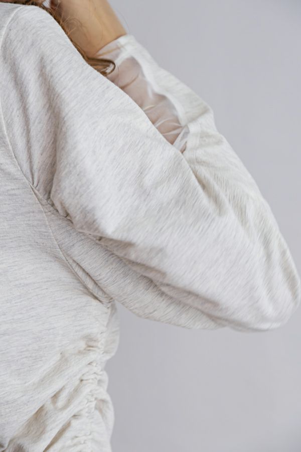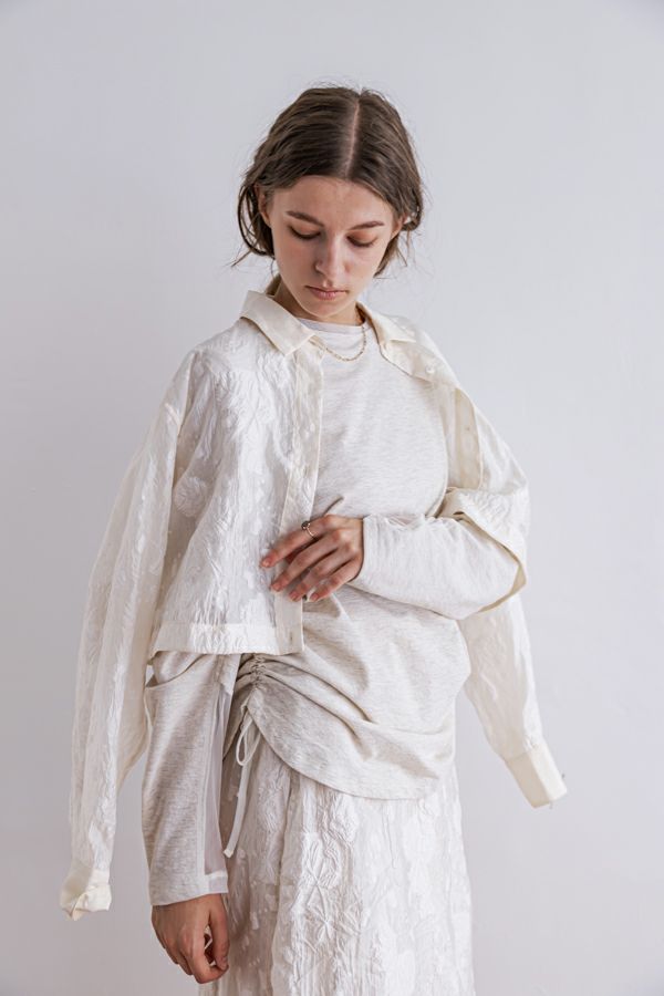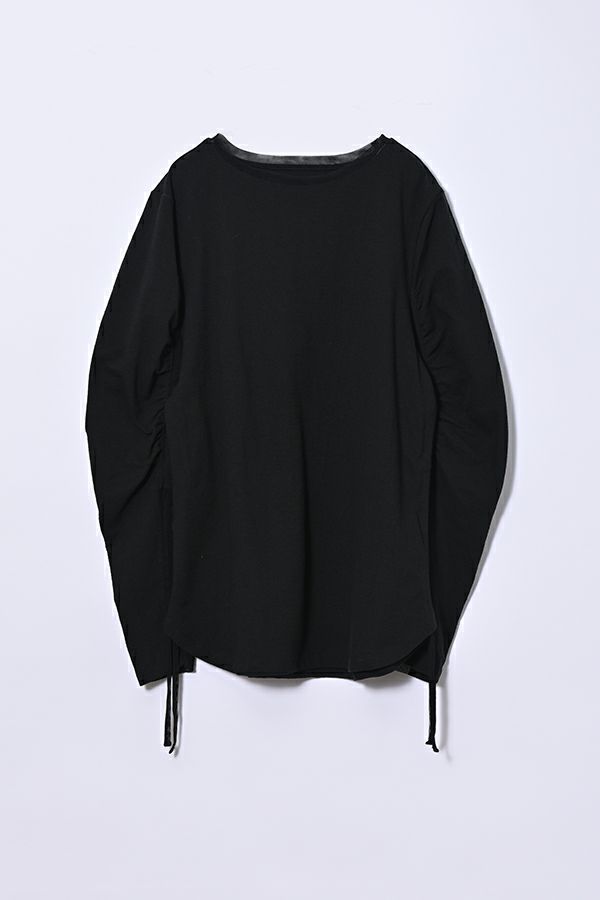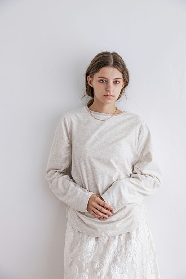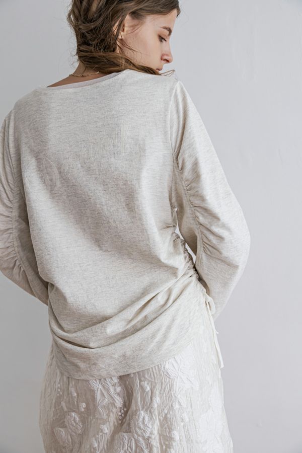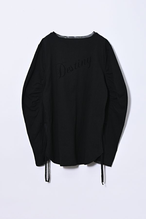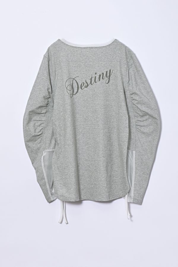 トレンドのパワーショルダーが目を惹くロンTEE。 シャリ感とドライな手触りが特徴的な生地感が新鮮。肩~袖にかけてボリューム感が加わったデザインのパワーショルダーは、存在感抜群。 身頃の両サイドをドローストリングさせ、シャーリングを作ると裾がカーブになり、全体にバランス良く立体感が出ます。 衿と袖下にメッシュ地の切替を入れ、程良いシアー感と華奢見えの要素もプラス。 後ろ姿にも拘りのアクセントを。大人っぽいレタリングで『Destiny』のロゴプリント入り。 存在感のあるデザインでワイドパンツ合わせから、タイトスカートなど幅広い着こなしと好相性です。メンズライクなボトム合わせで、大人のこなれ感あるスタイリングがおススメです。