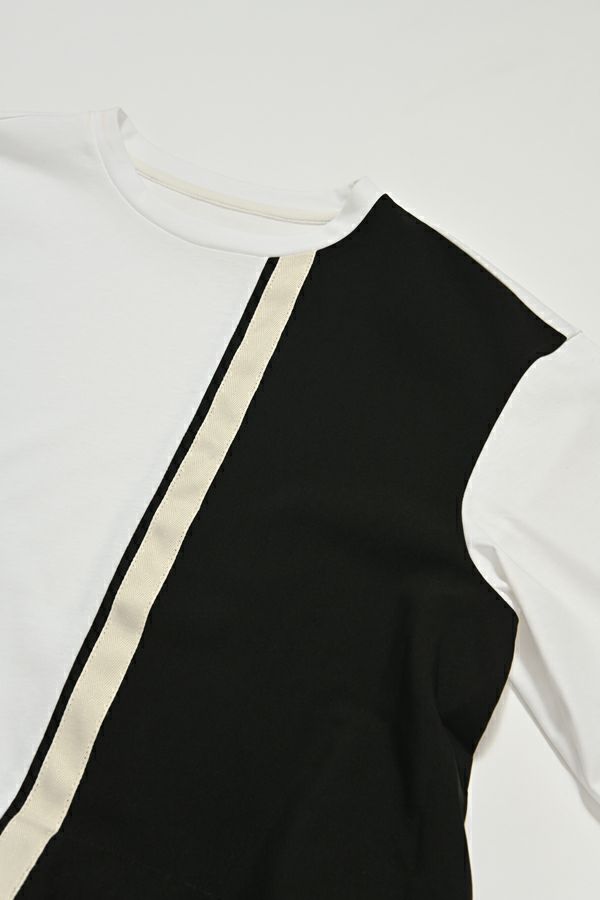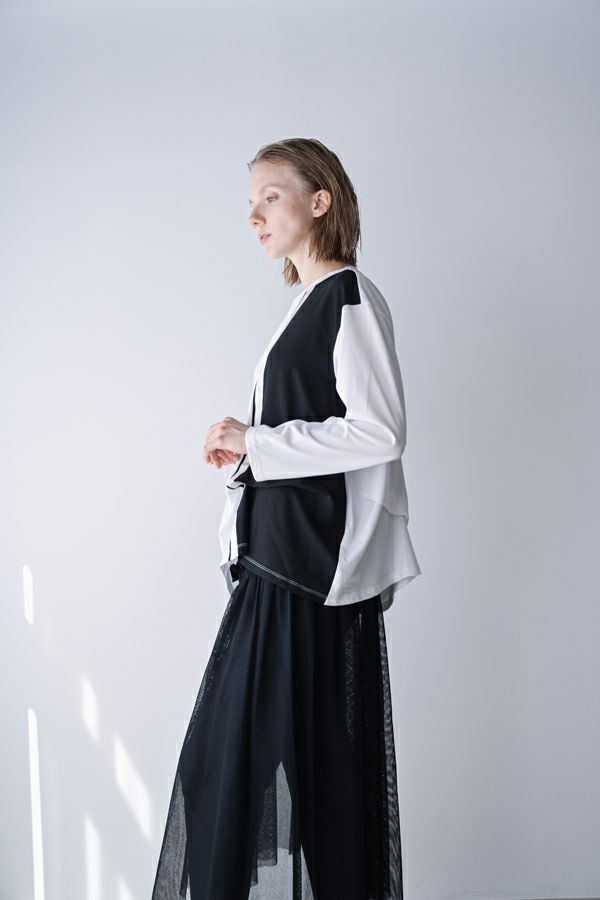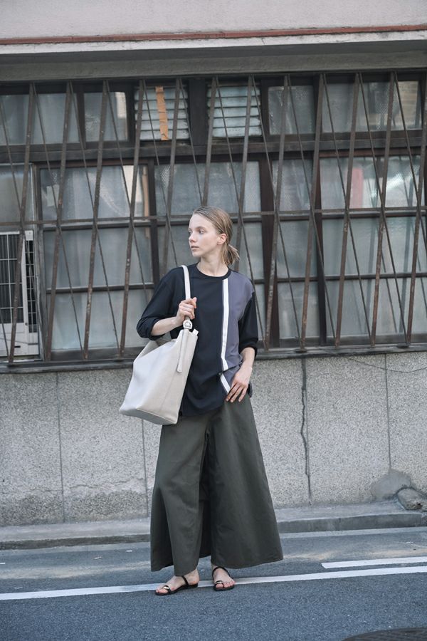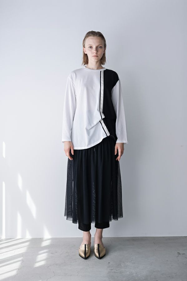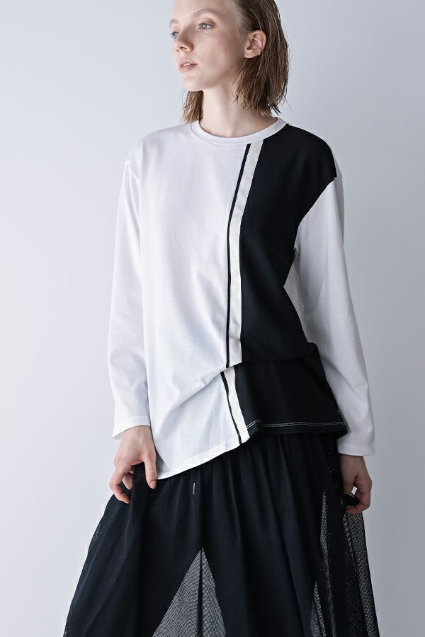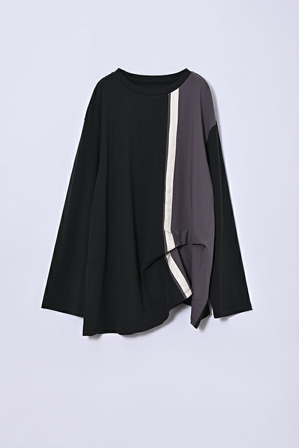 モードな雰囲気漂う、存在感ある大人のロンTEE。 前身頃の配色切替えとテープラインが、細見せに効果的。インパクトのある配色とラインテープがスポーティでありながら、モードを感じるデザインに仕上げています。 ウエストラインのアシンメトリーなタックが裾に動きを付けて、ドレープ感が大人の余裕を醸し出す。 一枚でサマになり、格上げコーデが叶うアイテムです。