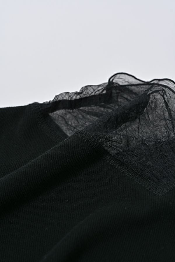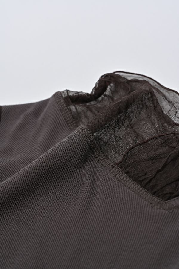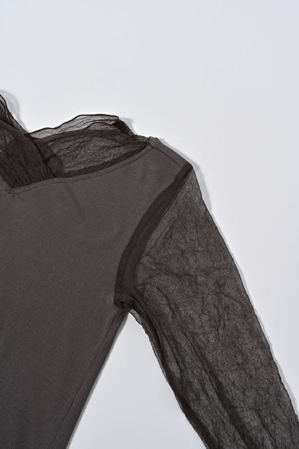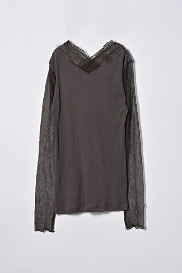 イリブ生地とクラッシュメッシュ切替でのシアー感が今年らしい着こなしに欠かせない日本製 ロンTEE。 素材は特殊なアルビニスタシフォンテレコ素材で、肌触りも良いコットン100%で優しい着心地になっています。今年らしくやや長めのメッシュ袖は、くしゅっと軽くたくし上げて手元のニュアンスを楽しんだり、ブレスレットを合わせるのも素敵です。 着心地の良さとさり気ないシアー感で一枚はもちろん、ニットやジャケットのレイヤードアイテムとしても最適です。 ●日本製 【アルビニスタシフォンテレコ】(イタリア糸) → 細番手の綿をテレコ組織で甘く編み下ろし、肌離れの優れたエアリーなタッチと程良い透け感が新鮮な素材の生地。