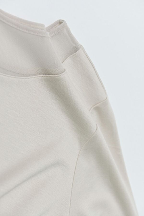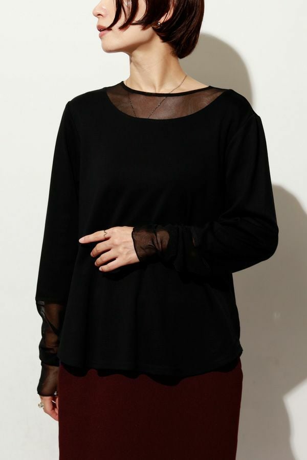 追加が決定!程よい肌見せと透け感が魅力的で、女性らしさ漂うプルオーバー。 光沢感と抗ピリング加工を施したデラヴィスポンチはストレッチ性もあり透けないカットソー素材を使用。裾のカーブがお腹周りをカバーし、程よい分量感とヒップにかぶる丈感で1枚着でもインナーでも着れるのがポイント。 袖の長いチュールをクシュクシュっと たくし上げてトップスの下からレイヤードを楽しんで・・・横長の襟ぐりなのでシャツやニットのインナーに合わせやすくなっています。 ●日本製