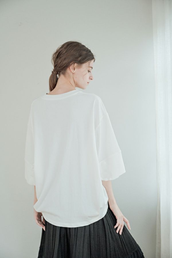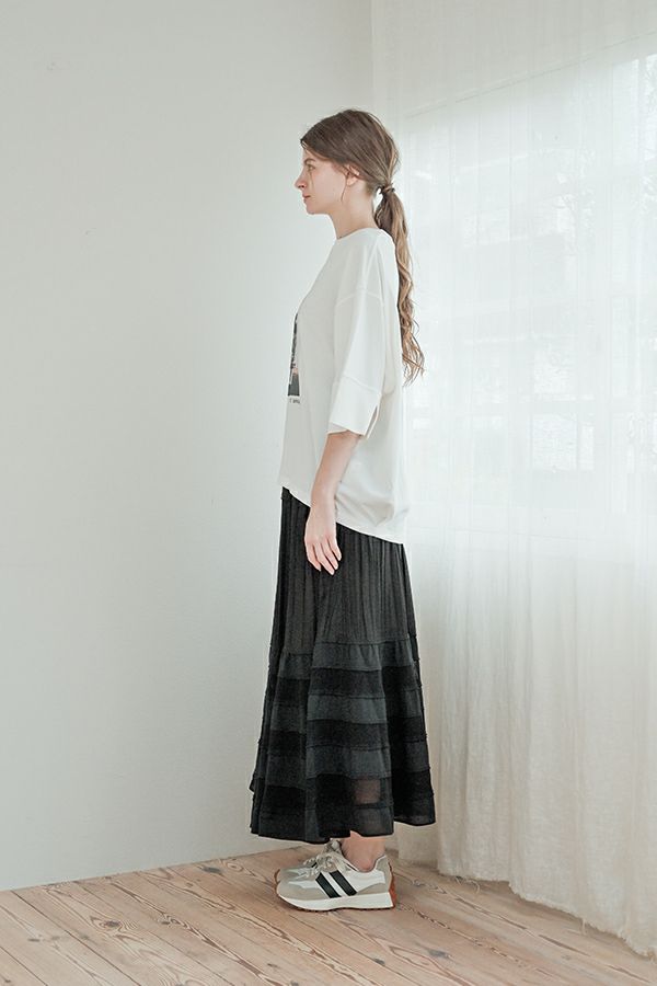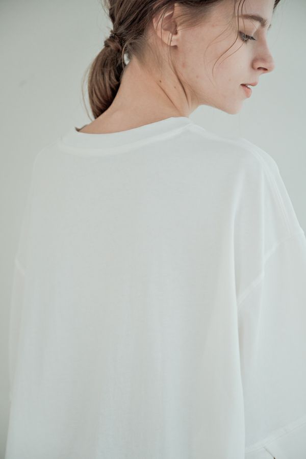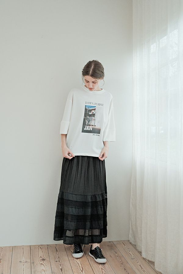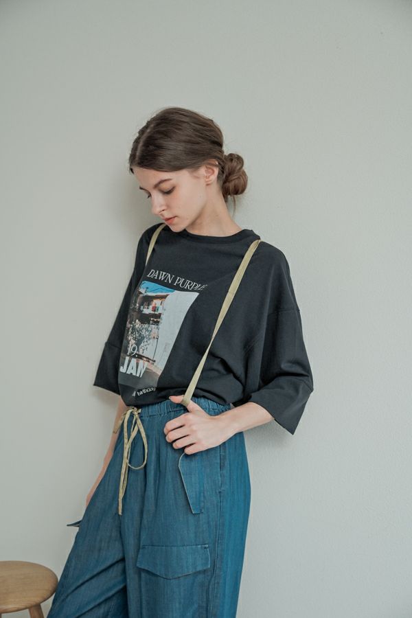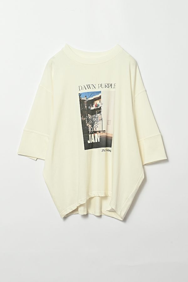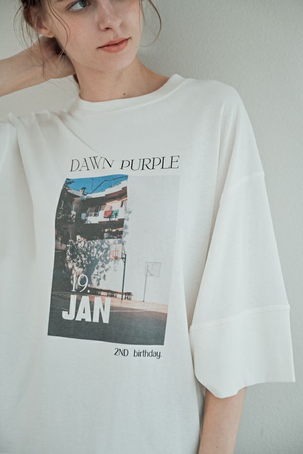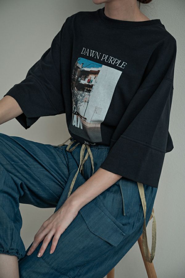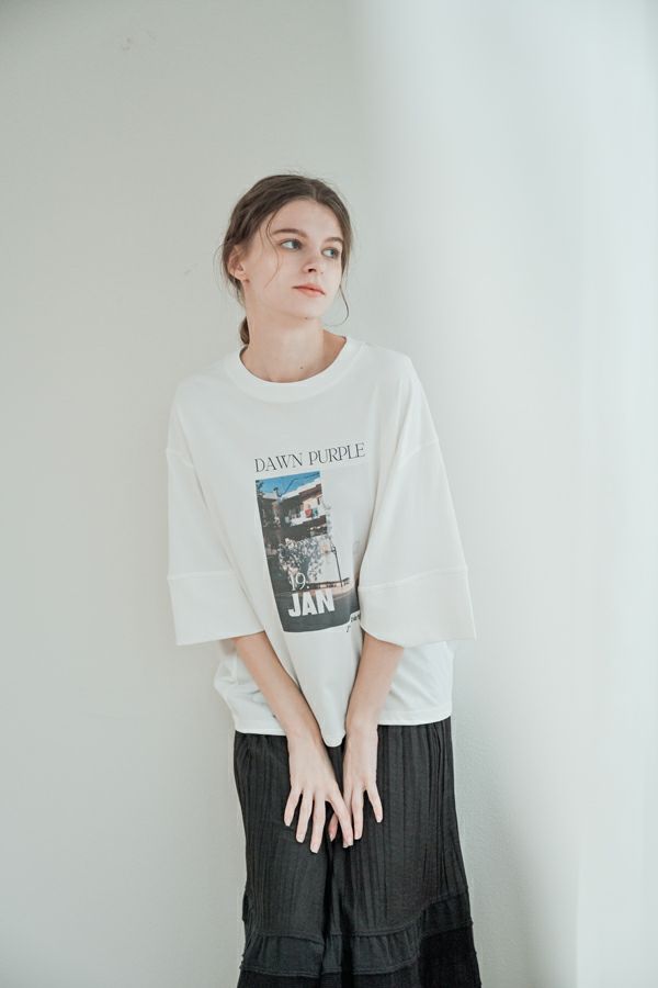 ノスタルジックな写真が目を惹く、大人が着映えるTシャツ。 シャリ感のあるドライタッチな生地でメンズっぽさもありつつ、どこか女性らしさも感じる大人が着やすいフォトプリントTEE。 オーバーサイジングなのでスタイルカバーもしてくれます。袖は肘近くまで長さがあるので二の腕もカバーする仕様に。 カラーパンツやスカート、サロペットと合わせるのもおすすめ。ベーシックなアイテムと合わせてもプリントがポイントになってくれてトレンド感ある着こなしが叶います。