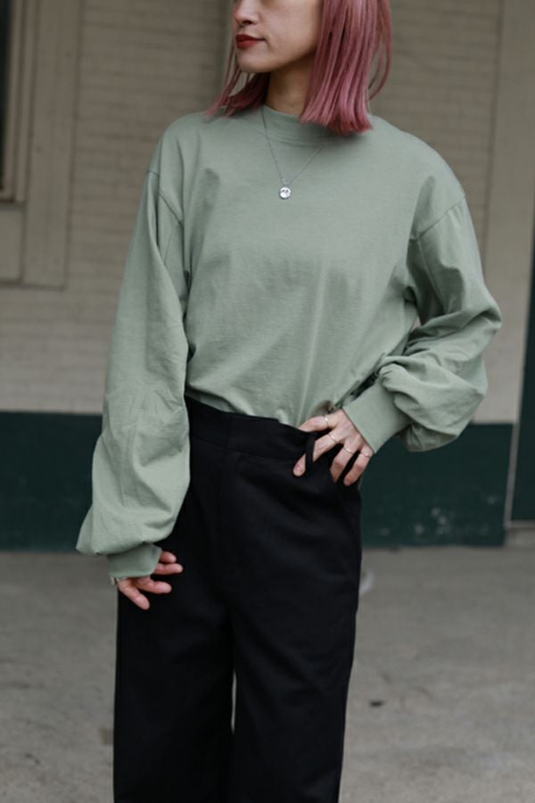 大人気! 1枚でも重ね着しても決まる、ギャザースリーブプルオーバー。 今シーズンは袖のギャザー分量を減らし袖丈を少し短くすることで、より着やすくデザインをブラッシュアップ。 ボリューム袖が際立つよう、身頃はあえてシンプルに。袖のシャーリングは、前寄りに入れることで立体的な印象を与え、肘にも当たらず快適な着心地を確保。 シンプルにデニムと合わせるだけで いつものコーデを格上げ。キャミワンピースやジレなどにレイヤードさせ「魅せるインナー」スタイリングでエッジを効かせるのも魅力的。裾がラウンドになっているのでフロントをウエストインするスタイリングもバランス◎ ●日本製