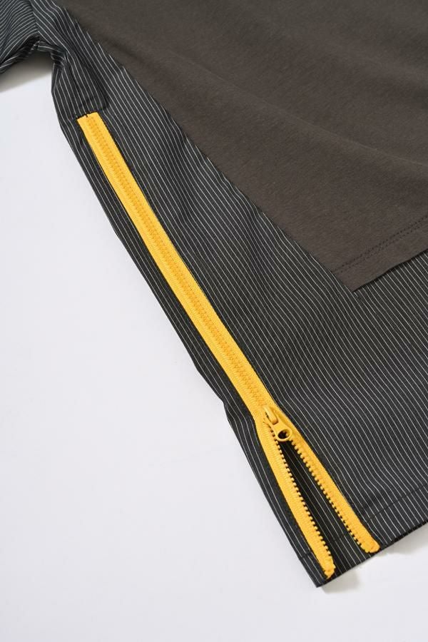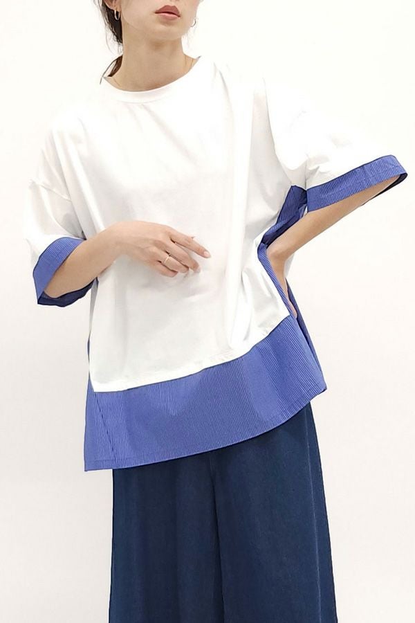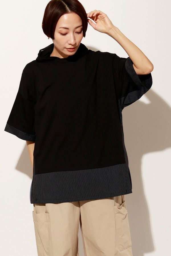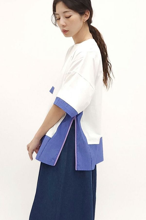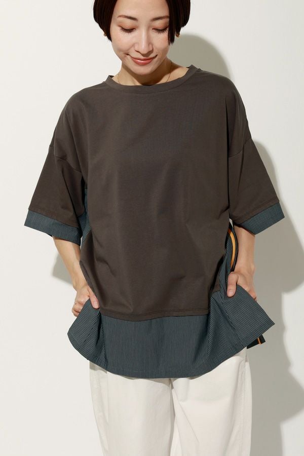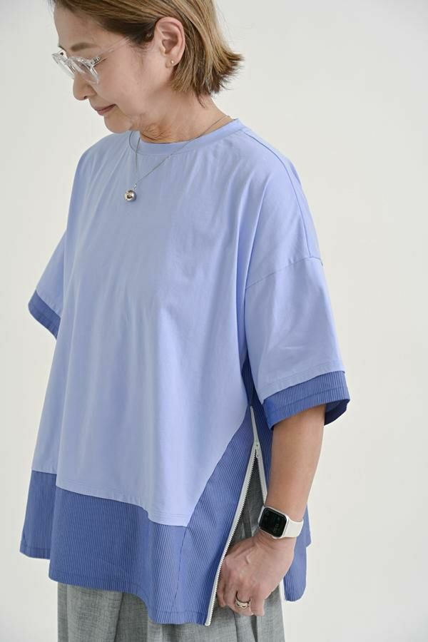 軽やかでありながら、洗練された存在感を放つプルオーバー。肌触りの良さと程よいハリ感を兼ね備えた綿100%カットソー素材に、上品なシャツストライプの布帛を巧みに組み合わせたデザイン。脇の切り替え部分は、細見え効果を引き出し、スタイルアップ効果も期待。さらに、脇のファスナーにカラーを施し、デザインのアクセントに。少し開けることで、自然にゆとりのあるボックス&フレアシルエットが生まれ、清涼感と大人の遊び心を引き立てます。シンプルながらも、どこか遊び心のあるデザインは、あなたのスタイルに一層の魅力をプラス。これ一枚で、カジュアルでありながら洗練された大人の雰囲気を楽しめます。シンプルだけど、ひと味違う。あなたのスタイルに新たなアクセントを。●手洗い可