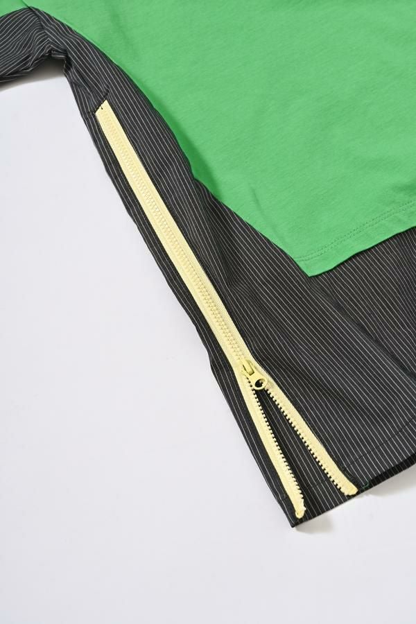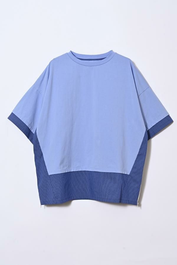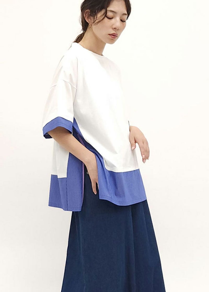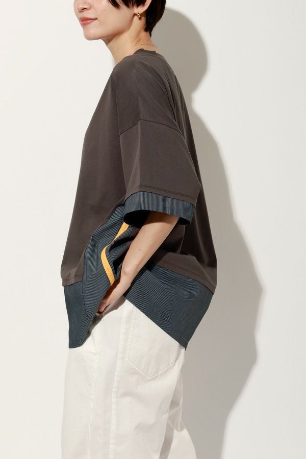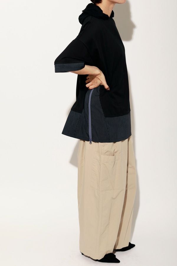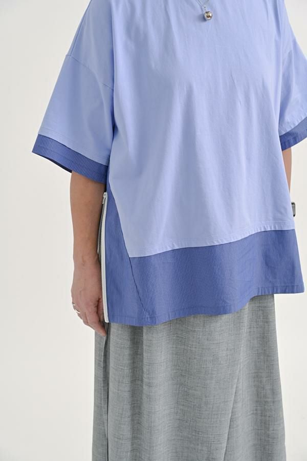 軽やかでありながら、洗練された存在感を放つプルオーバー。肌触りの良さと程よいハリ感を兼ね備えた綿100%カットソー素材に、上品なシャツストライプの布帛を巧みに組み合わせたデザイン。脇の切り替え部分は、細見え効果を引き出し、スタイルアップ効果も期待。さらに、脇のファスナーにカラーを施し、デザインのアクセントに。少し開けることで、自然にゆとりのあるボックス&フレアシルエットが生まれ、清涼感と大人の遊び心を引き立てます。シンプルながらも、どこか遊び心のあるデザインは、あなたのスタイルに一層の魅力をプラス。これ一枚で、カジュアルでありながら洗練された大人の雰囲気を楽しめます。シンプルだけど、ひと味違う。あなたのスタイルに新たなアクセントを。●手洗い可