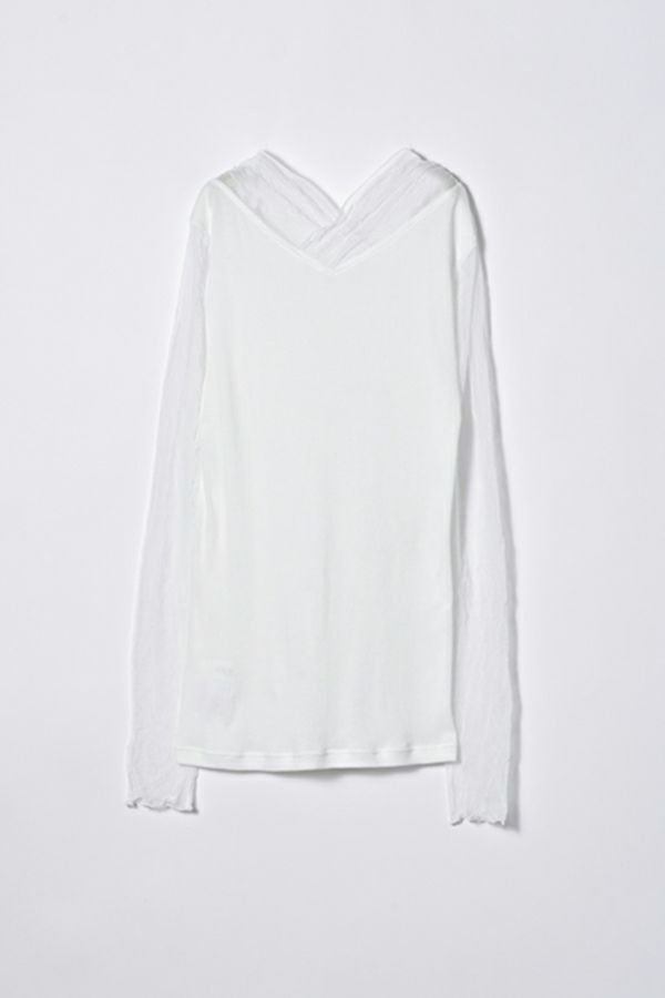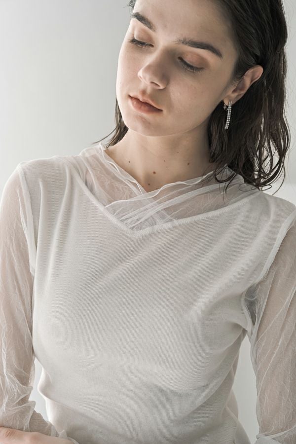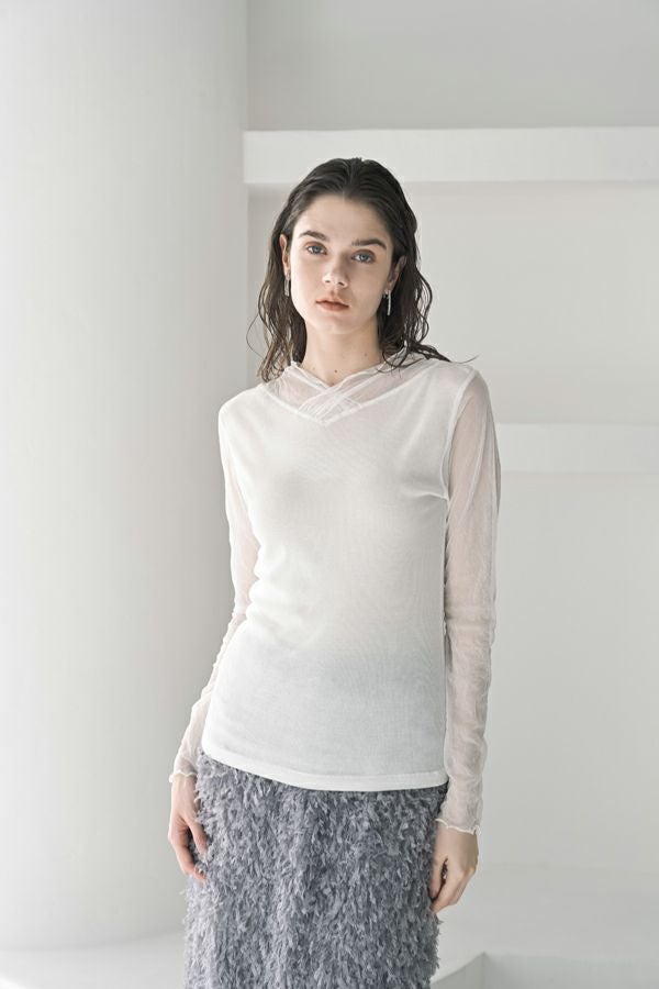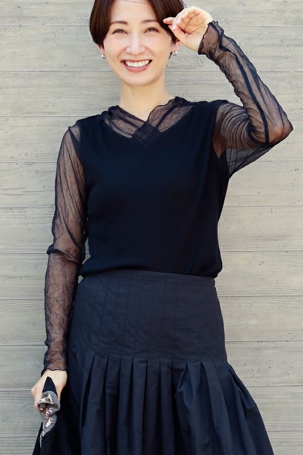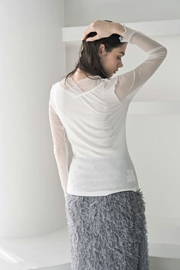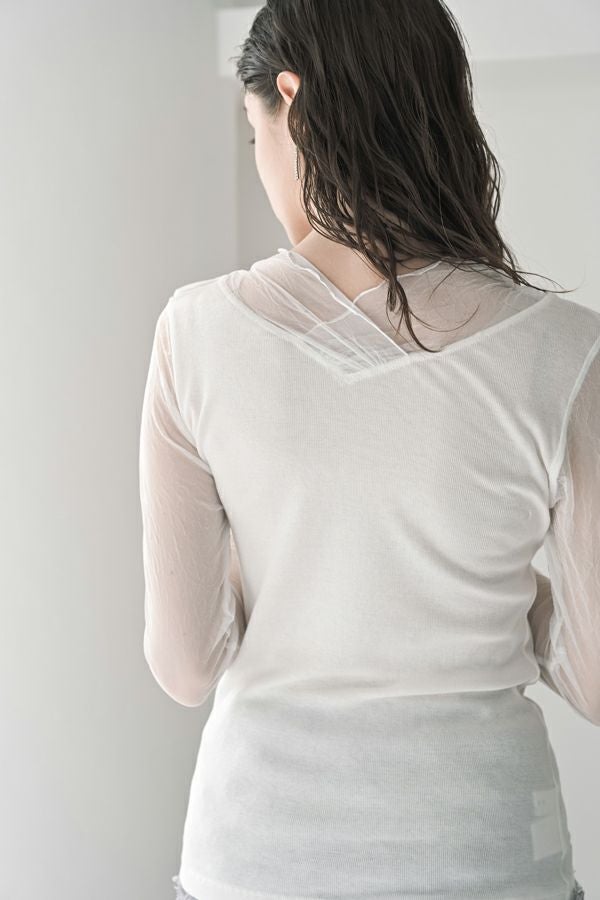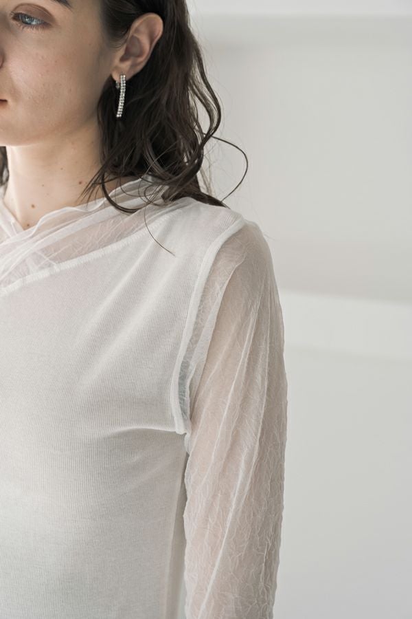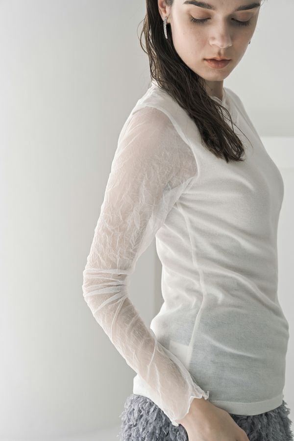 大人のニュアンスは袖に宿る、シアーを纏うロンTEE。 リブ生地とクラッシュメッシュの切り替えで生まれる、さり気ないシアー感。 その透け感が、旬のスタイルを完成させてくれます。 素材には、特殊なアルビニスタシフォンテレコを使用。コットン100%ならではの柔らかなタッチで、肌に優しく寄り添います。 やや長めに仕立てたメッシュ袖は、くしゅっとたくし上げて手元にニュアンスを。 ブレスレットを重ねれば、さりげないアクセントが大人の余裕を演出します 一枚で着ても、ニットやジャケットのインナーとしても映える万能さ。着心地と上品さを兼ね備えた、大人のための必須アイテムです。 ●日本製 【アルビニスタシフォンテレコ】(イタリア糸) → 細番手の綿をテレコ組織で甘く編み下ろし、肌離れの優れたエアリーなタッチと程良い透け感が新鮮な素材の生地。