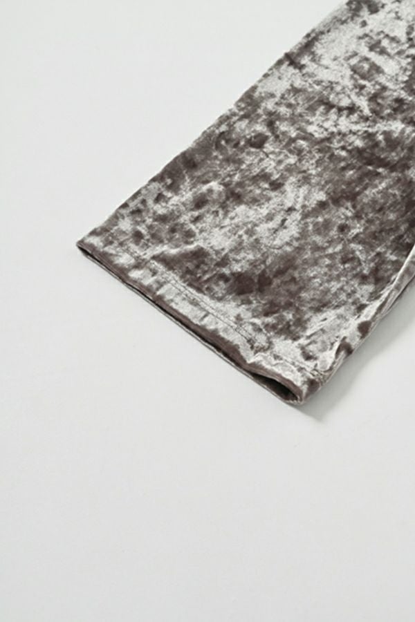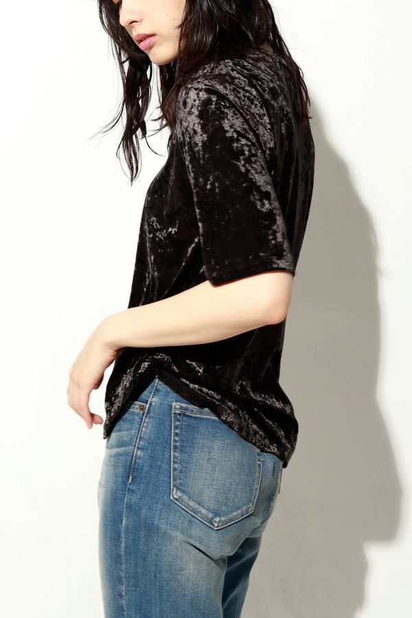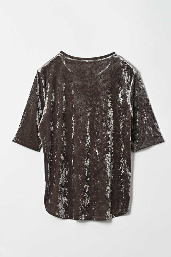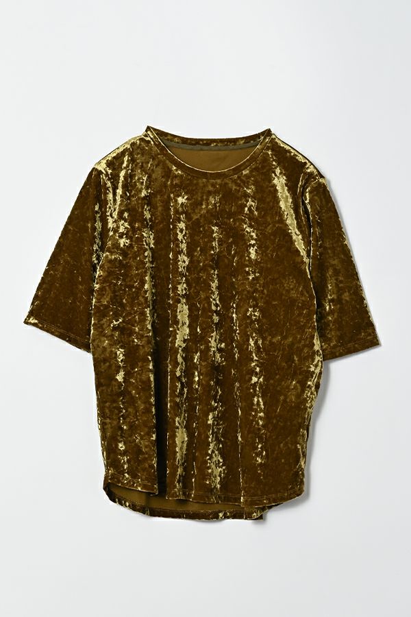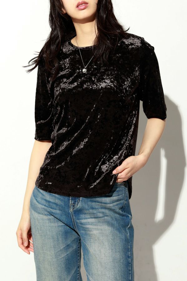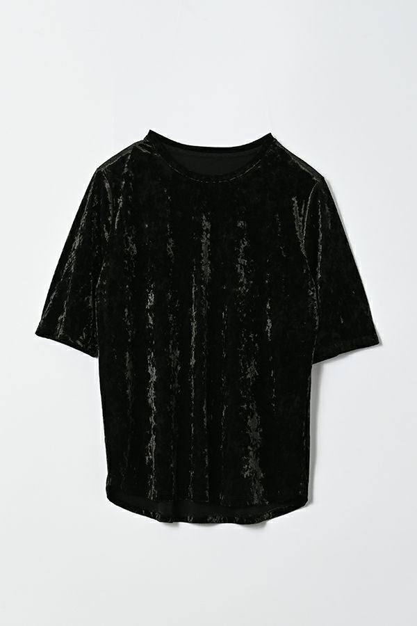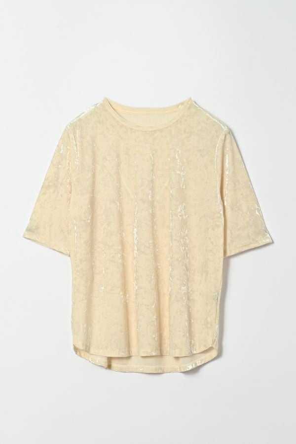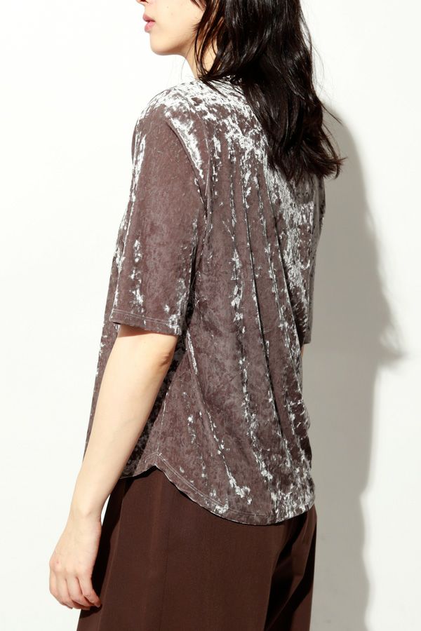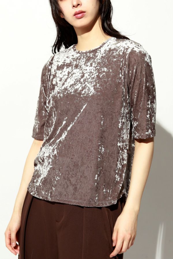 静かな艶を纏う、クラッシュベロア五分袖プルオーバー。 柔らかく、華やかに。秋冬スタイルを品よく惹き立てる質感トップス。 ブライトなポリエステルとナイロンを染め分けることで生まれる上品なシャンブレーの光沢感に、クラッシュ加工を施してこなれた印象に仕上げたトリコットベロア素材を使用。 なめらかで上品な肌触りは、一枚でもレイヤードでも心地よく、季節の変わり目に重宝する万能アイテムです。程よい光沢が自然な華やかさを添え、シンプルなフォルムに表情を生み出します。 ハイウエストボトムにインしてシルエットにメリハリを出したり、ジャケットやカーディガンのインナーとして素材のコントラストを楽しんだりと、着こなしの幅も広がります。ベーシックだけど退屈じゃない。大人の日常にちょうどいい、さりげない主役トップスです。 ●日本製