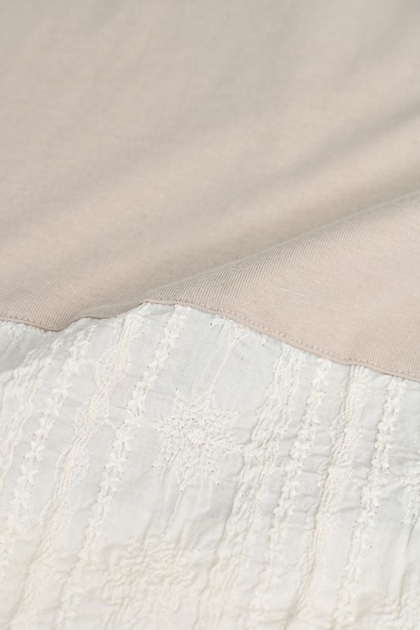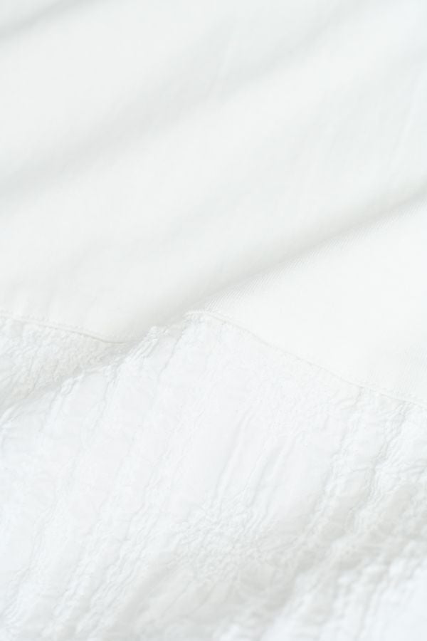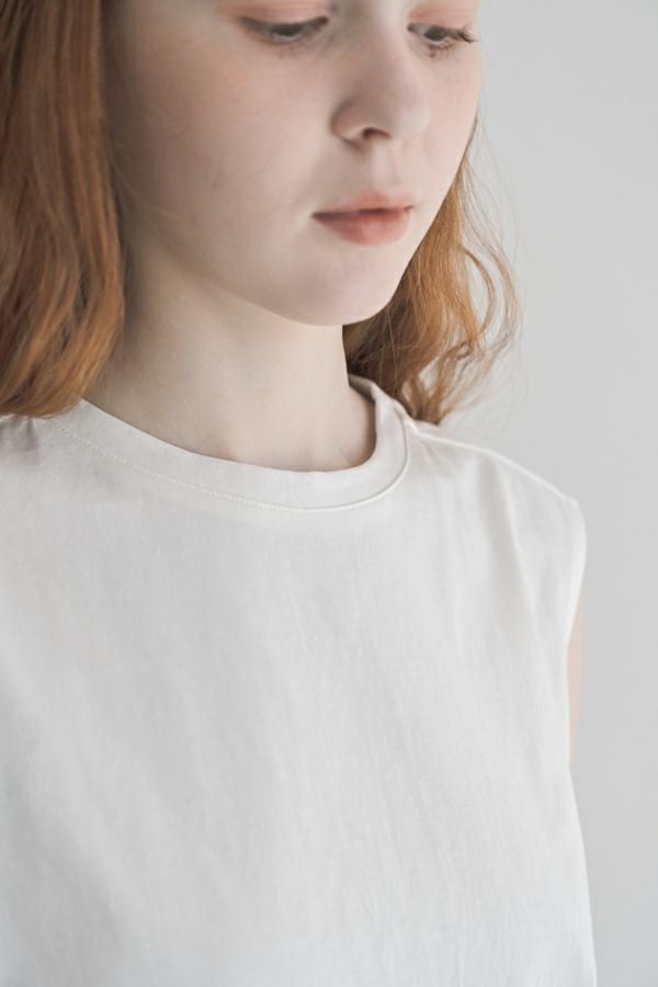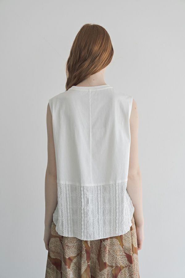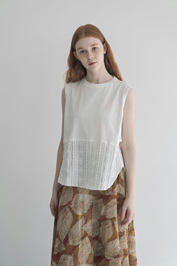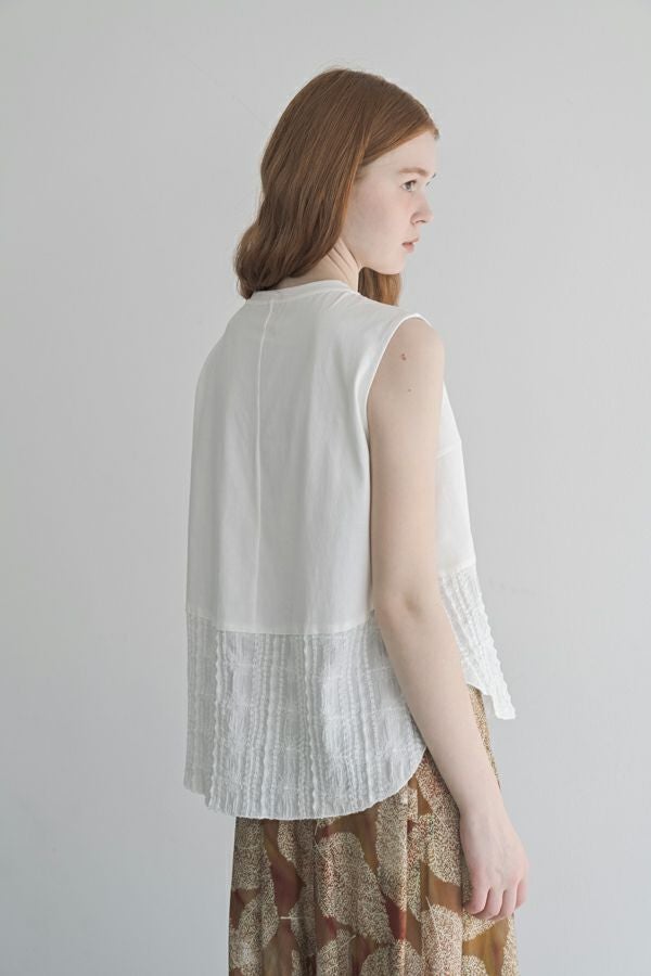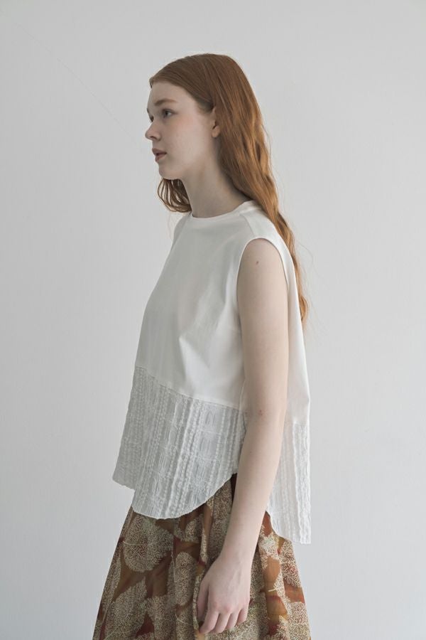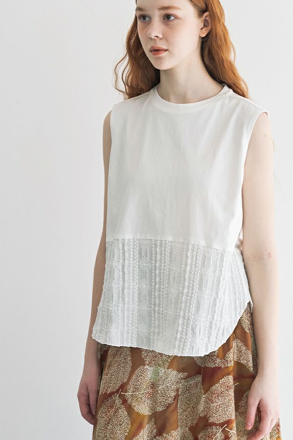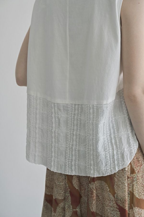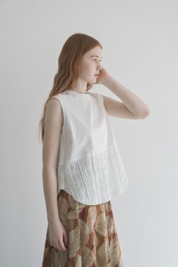 シーズンレスで活躍、シャーリングレース×コクーンシルエットのタンクトップ。 綿のシャーリングレースと身頃の切り替えが絶妙なバランスを生むデザイン。 前後差のある裾がヒップからお腹周りを優しくカバーし、気になる腕周りは肩先まで被る広めの肩幅で、腕の付け根がすっきりと見えるように配慮しています。 包み込むようなコクーンシルエットは、ボトムのウエスト周りにドレープ感を出し、胸周りにはダーツを入れてすっきりとしたサイズ感を実現。 春から初秋にかけて、シーズンを問わず活躍すること間違いなしの一枚です。