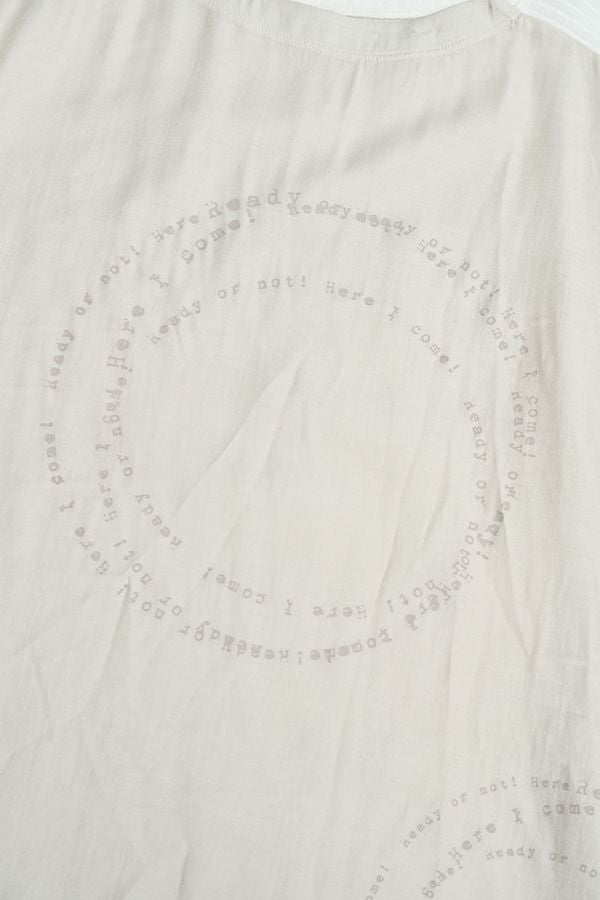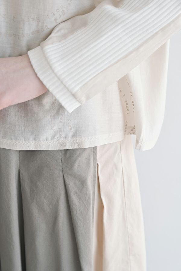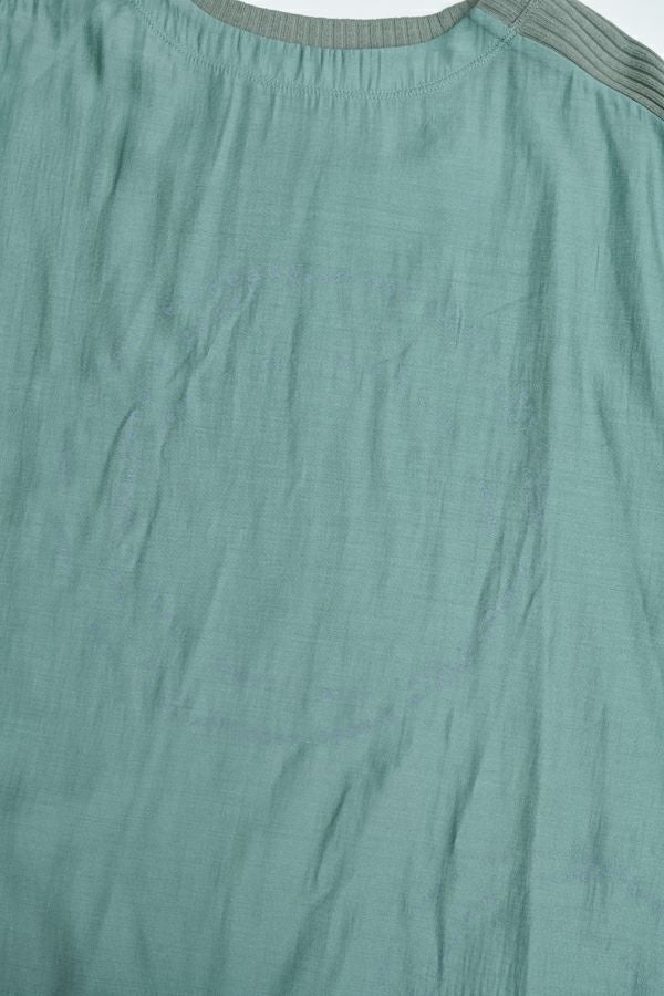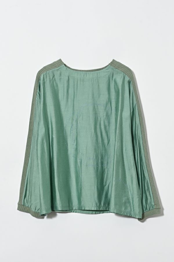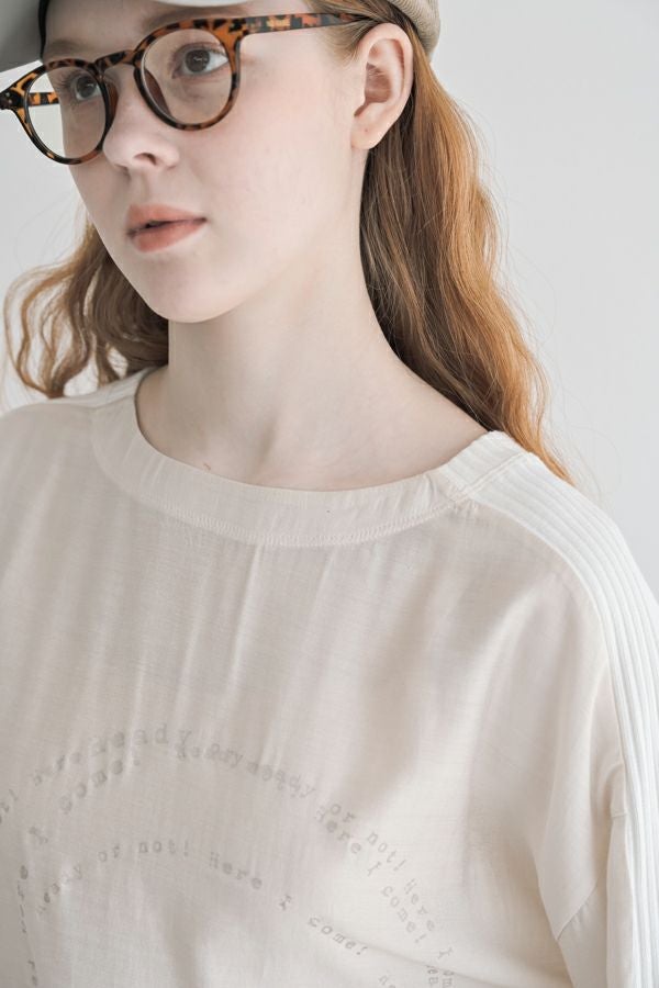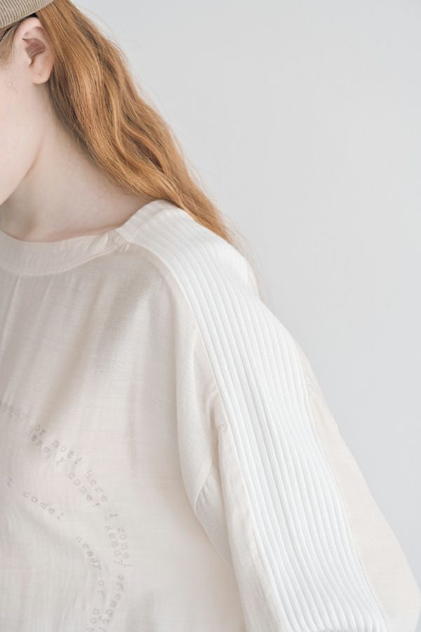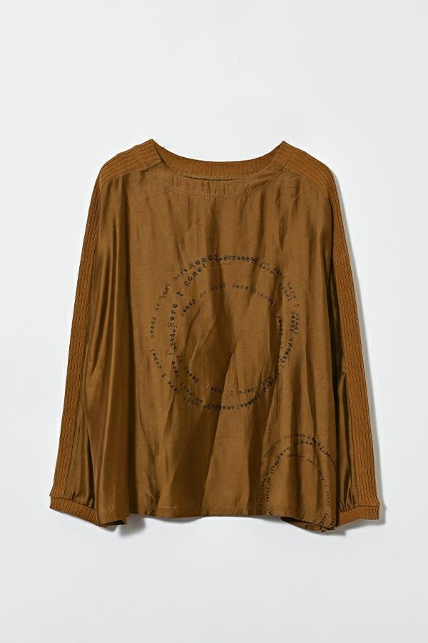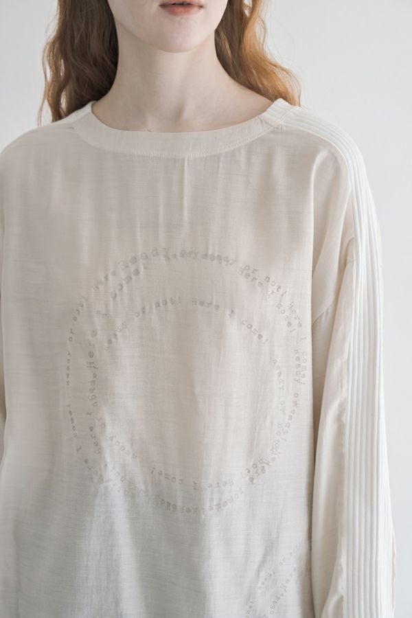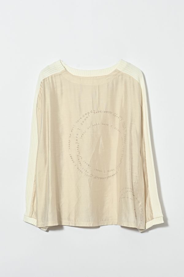 シアー感と光沢が魅力、ポリエステルサテンのプルオーバー。 リブ素材を袖山にあしらうことで、スッキリとしたシルエットを作り出し、柔らかい落ち感でカジュアルになり過ぎず、大人っぽく着こなせるアイテムです。 小さなタイプロゴのサークル柄が印象的で、シンプルながらも個性的なデザインが特徴。 着丈が短めなので、ボリュームのあるボトムと合わせてもバランス良く、スタイリングを楽しめます。