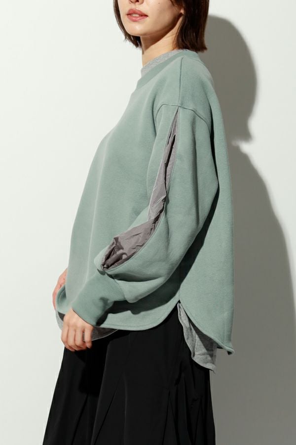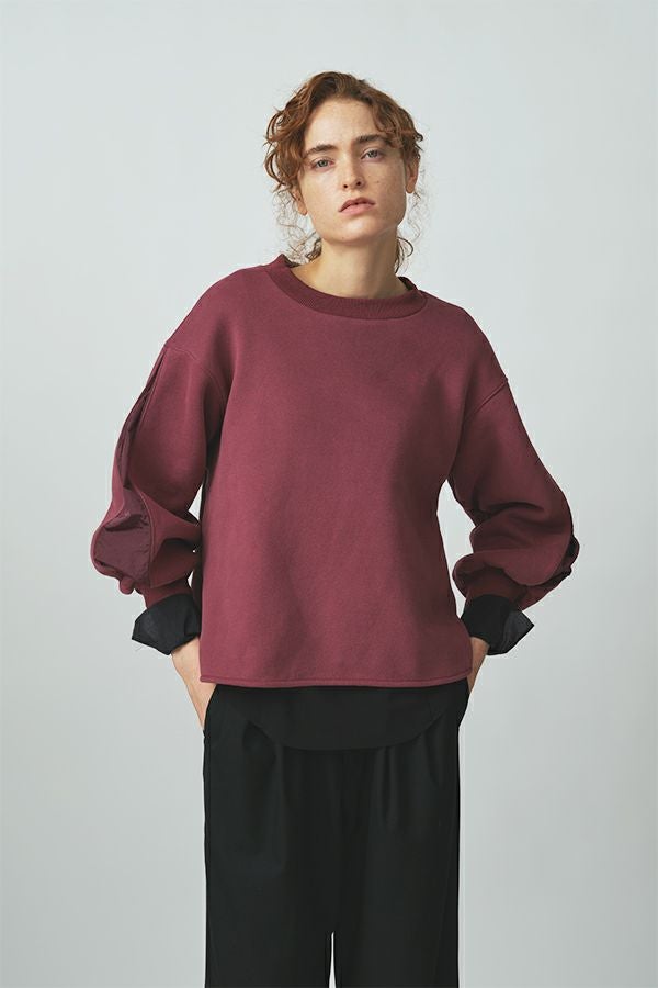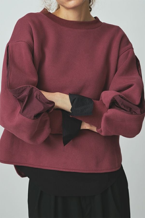都会の空気を纏った、アーバンアスレチックなプルオーバー。 パフ感のある袖にナイロンのタックを施したことで生まれる立体的なシルエットが、アクティブなムードを引き寄せます。ふっくらとした裏起毛素材は肌あたりも柔らかく、綿/ポリエステルの混紡によって速乾性にも優れ、冬場のケアもスムーズに。 フェミニンになりがちなパフスリーブも、タフな質感のナイロンを加えることで、甘さを抑えたシャープな印象に仕上げています。 深めのサイドスリットが動きに軽さを与え、レイヤードスタイルにも最適。インナーを効かせて着こなしに奥行きを加えれば、クールでこなれた表情に。ウールのワイドパンツやレザー調スカートとの相性も抜群。足元はスニーカーで軽快に、ブーツでエッジを効かせて。