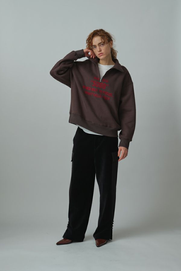 オフの感性、抜け感を操る大人スウェット。 柔らかな裏起毛とハーフジップのバランスが絶妙な、都会派スウェット。綿/ポリエステルの混紡素材は、綿100%に比べて速乾性があり、冬場のケアもスマートに。ふっくらとした肉感がありながら、軽やかで扱いやすいのも嬉しいポイントです。 胸元には、温もりのあるフロッキープリントで個性をひとさじ。 【SEARCH "5088" WHICH WAY TO FOCUS… WHAT CALLS YOU?】 というメッセージには、自分を中心に、広く世界を見渡した先で心が惹かれるものを探す…という意味が込められています。直感や衝動を大切にする、大人の感性に響く一着です。 カジュアルな印象のハーフジップも、ウールのワイドパンツやセンタープレス入りのきれいめボトムと合わせることで、洗練されたミックススタイルに昇華。ボトムにボリュームを持たせれば、力の抜けたこなれ感が自然と生まれます。フロッキーの色味に合わせた足元で、スタイリングに一貫性と奥行きを。 オンでは見せない表情を引き出してくれる、マインドフルなオフのための一枚。