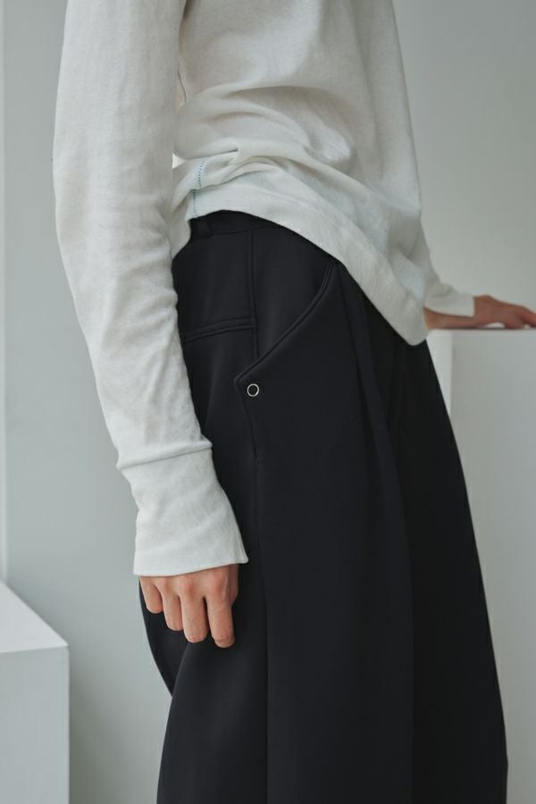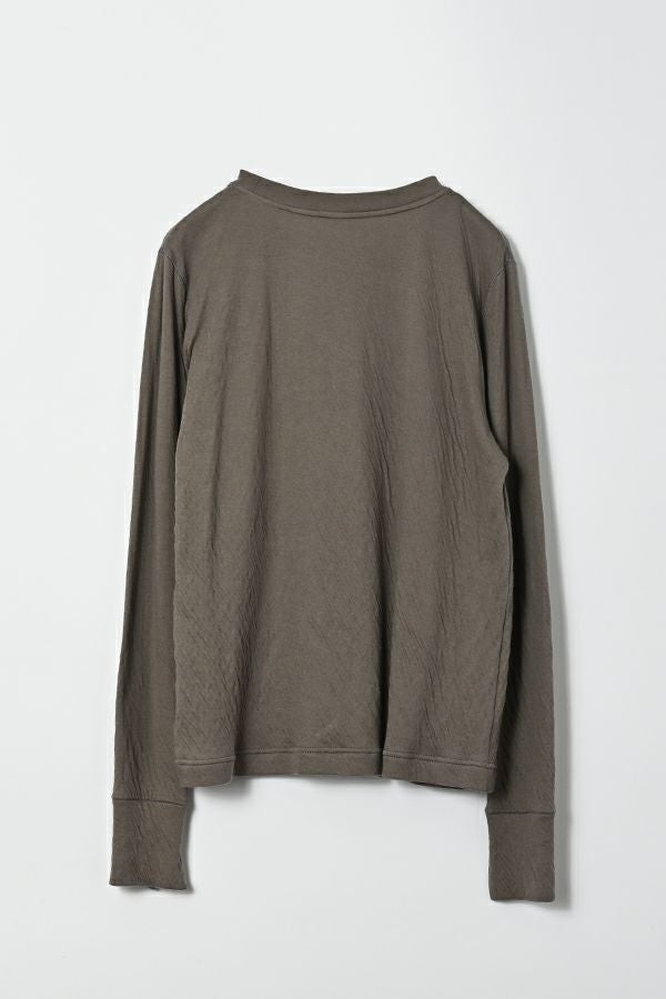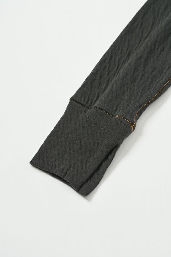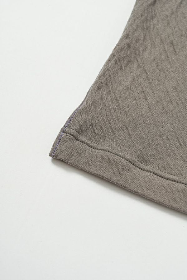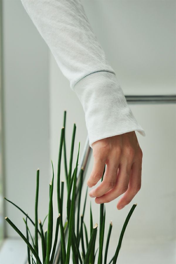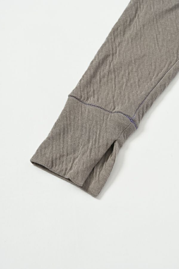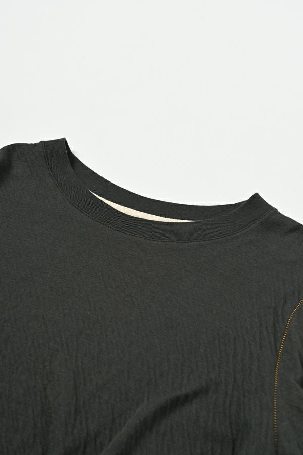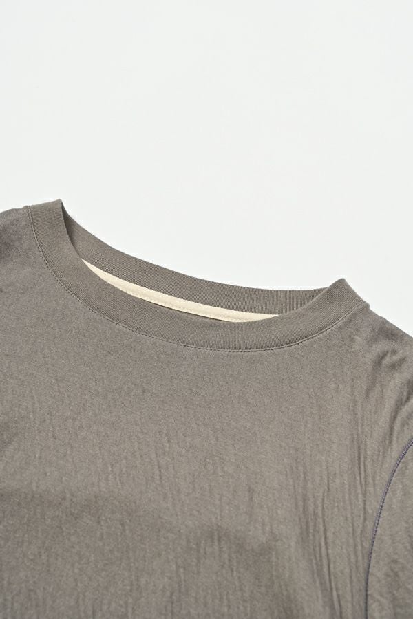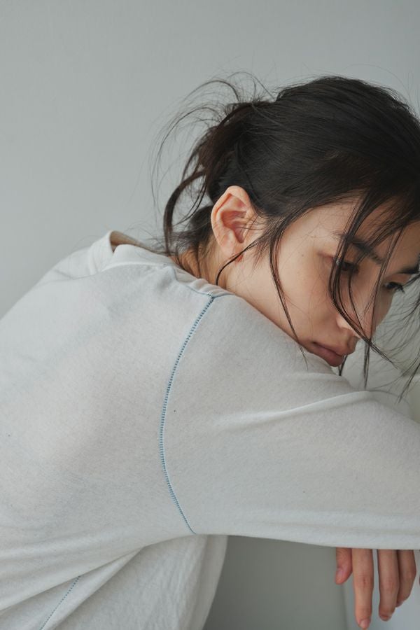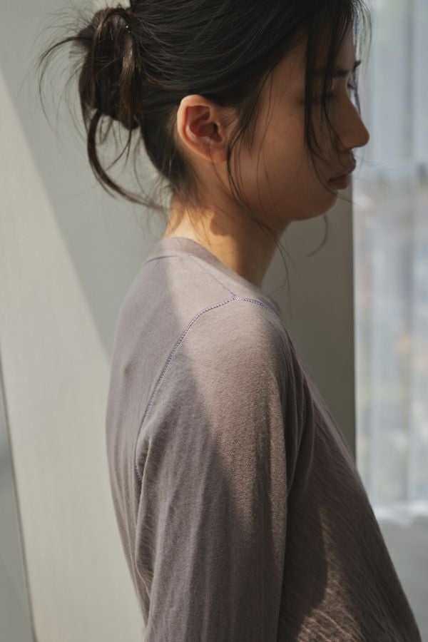 ラフに、かっこよく。心地よさを纏えるロンTEE。 肌にまとわりつかない ゆったりとしたサイジングに、ミニマルなデザイン。独特なハシゴステッチや配色ステッチが、シンプルな中に程よい主張を添え、1枚着でもレイヤードでも存在感を発揮します。 袖口には長めのカフスを配し、内側に入れたスリットがさりげなく動きを演出。メンズライクな雰囲気を漂わせながらも、女性らしいエッセンスを忍ばせた1枚。 素材は、空気を含んだ綿100%のダブルフェイス。2枚仕立ての程よい厚みと伸縮性が、身体をふわりと包み込み、気取らず過ごしたい日にも、自然と手が伸びる心地よさを叶えます。 ●日本製