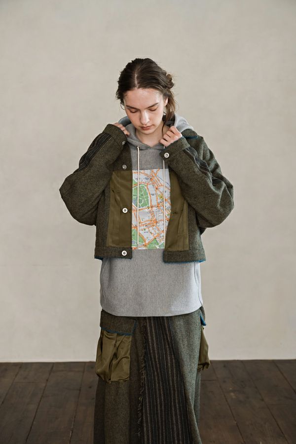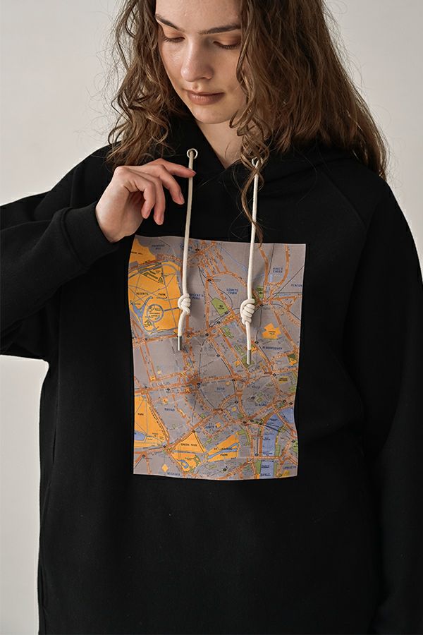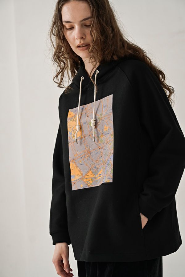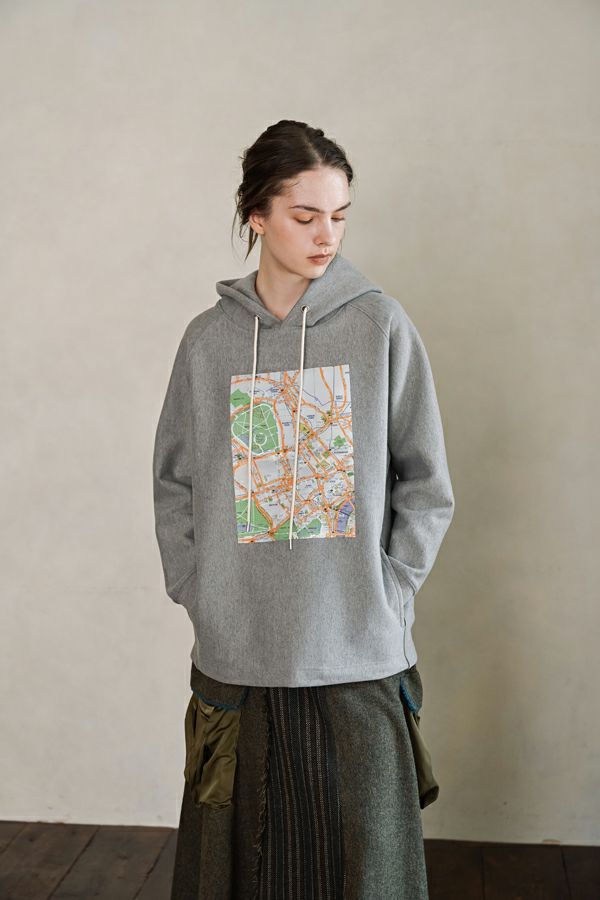 静かな存在感が視線を誘う、大人のためのパーカー。 表面にほどよい表情を持つ綿/ポリエステル素材が、しっかりとしたハリを保ちながらも心地よい着心地を実現。ヒップを美しくカバーするチュニック丈のオーバーシルエットが、大人のカジュアルダウンに品のある抜け感を添えます。 ロンドン郊外の地図をモチーフにしたプリントは、バーズアイ=鳥の視点から見た風景をイメージした独特のデザインで、静かな物語性を醸し出します。 視線を誘う一枚で、日常にさりげないモード感をもたらします。