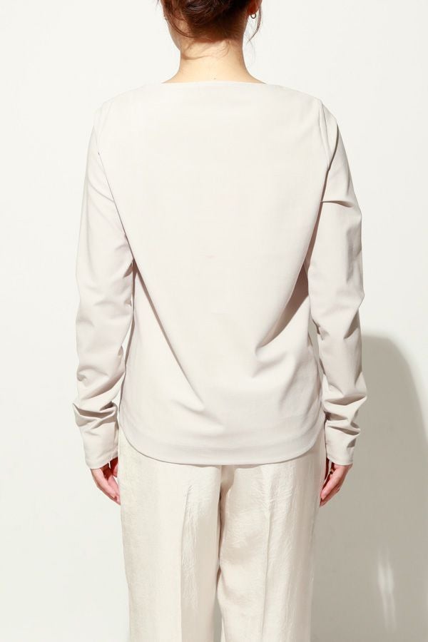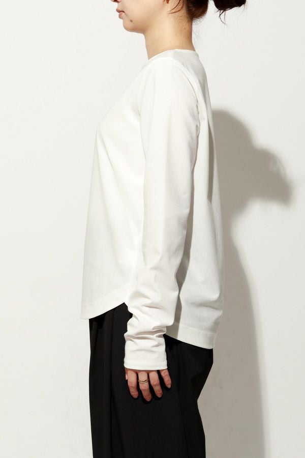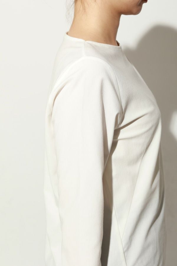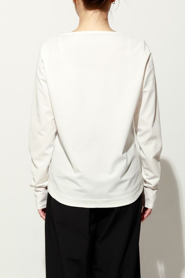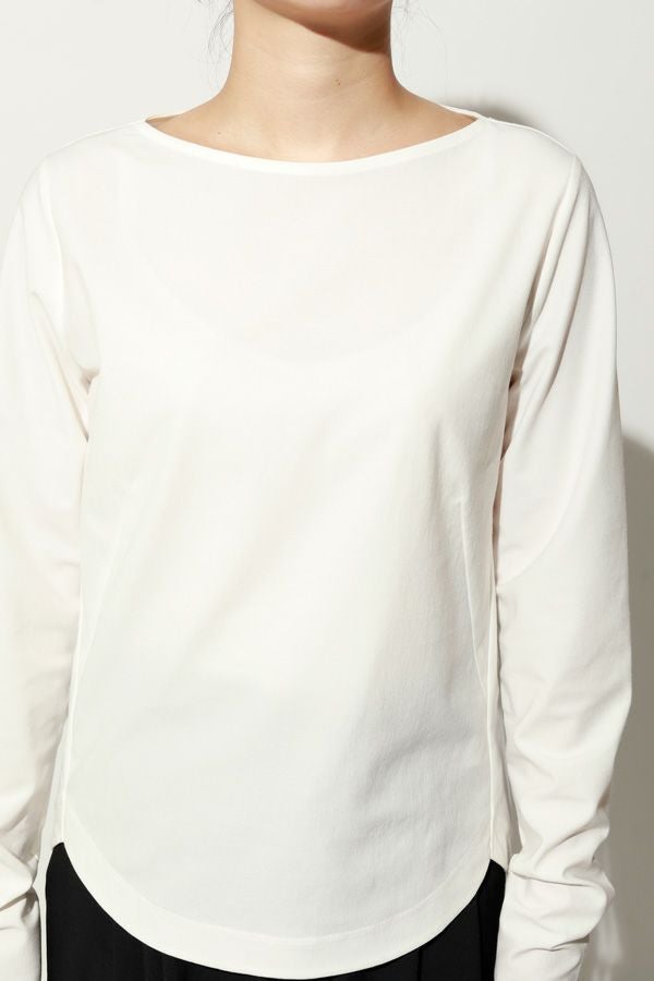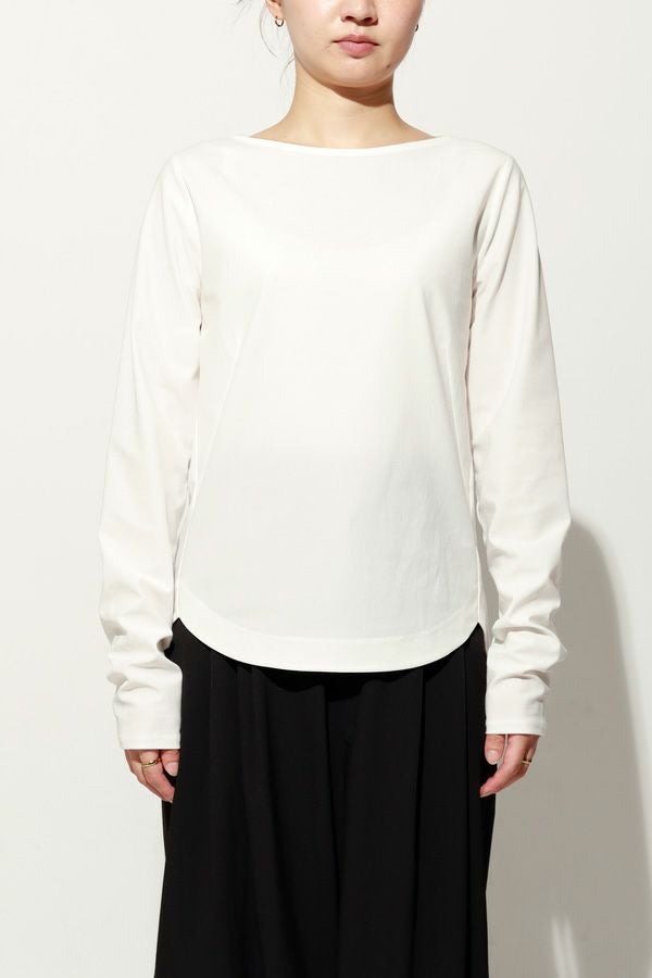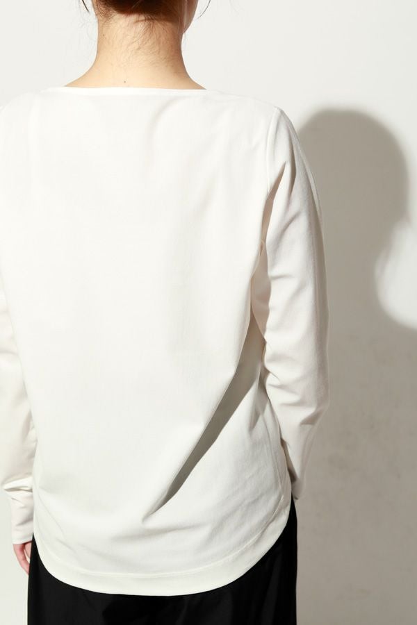 革新素材で叶える、凛と美しい大人の万能プルオーバー。 布帛のような上質な表情と、ストレスフリーなストレッチ性を融合した革新的新素材「&WARP™️」を採用。 軽やかな着心地ながら、仕立て映えする生地が、シーンを選ばず洗練された佇まいを演出します。首元を美しく惹き立てるネックラインや、パンツインしやすい裾カーブ。細部まで計算し尽くした設計で、ジャケットのインナーとしても単体としても洗練を放つ一枚です。 シワになりにくくマシンウォッシュも可能で、日常に寄り添いながらスタイルアップを叶える万能カットソーです。 ●日本製 ●2サイズ展開