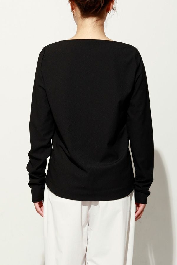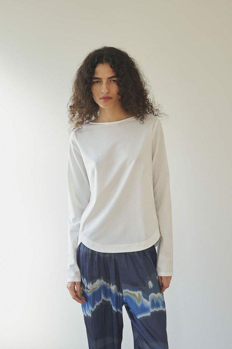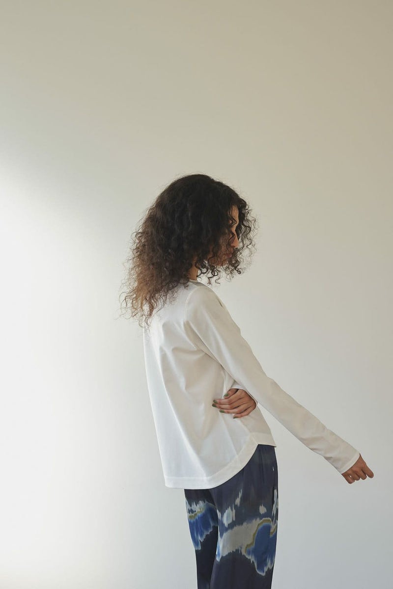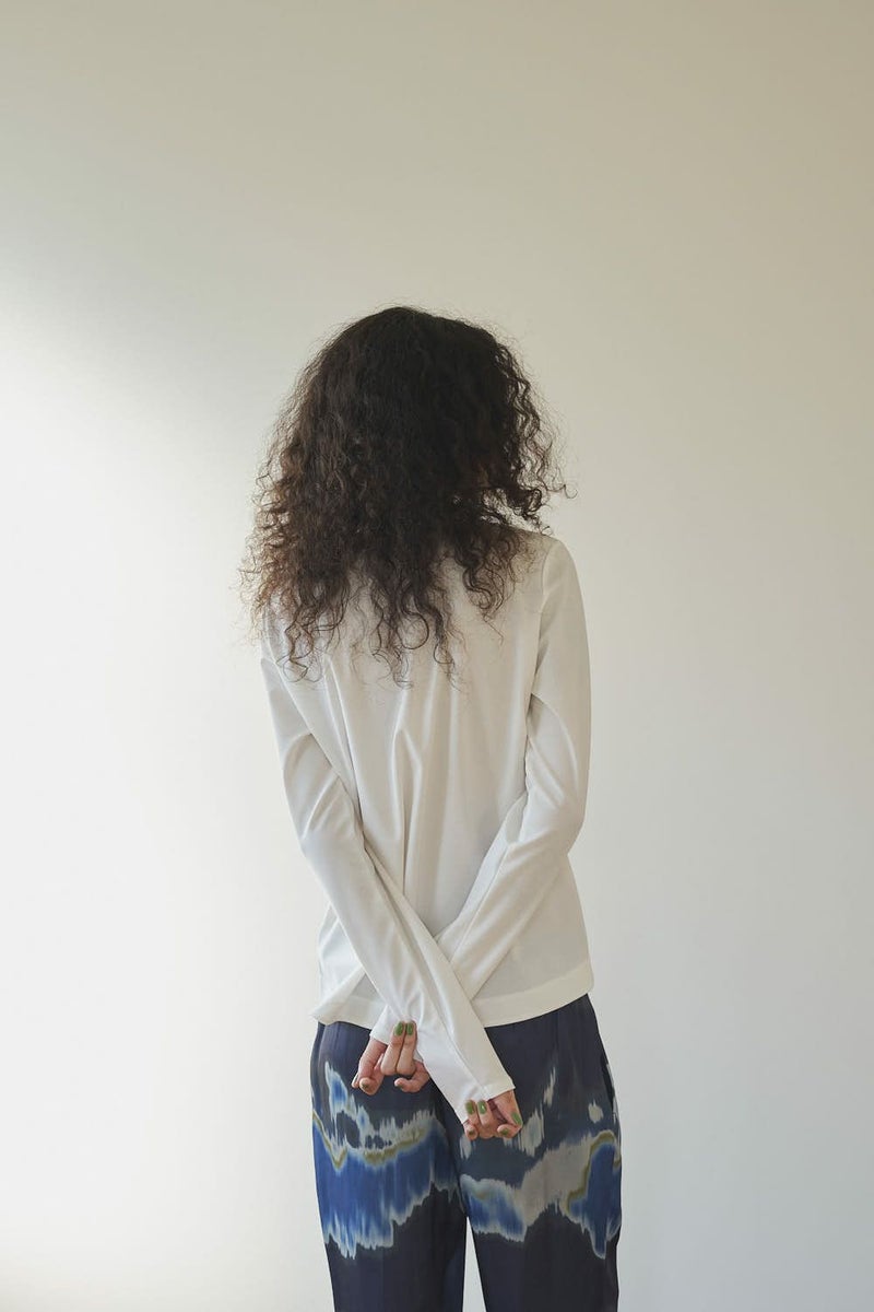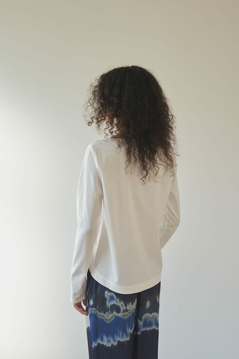 革新素材で叶える、凛と美しい大人の万能プルオーバー。 布帛のような上質な表情と、ストレスフリーなストレッチ性を融合した革新的新素材「&WARP™️」を採用。 軽やかな着心地ながら、仕立て映えする生地が、シーンを選ばず洗練された佇まいを演出します。首元を美しく惹き立てるネックラインや、パンツインしやすい裾カーブ。細部まで計算し尽くした設計で、ジャケットのインナーとしても単体としても洗練を放つ一枚です。 シワになりにくくマシンウォッシュも可能で、日常に寄り添いながらスタイルアップを叶える万能カットソーです。 ●日本製 ●2サイズ展開