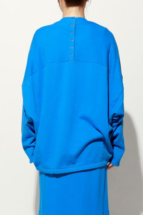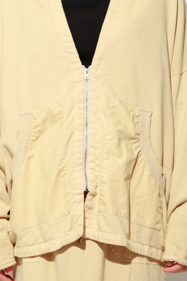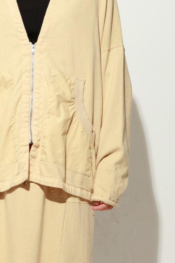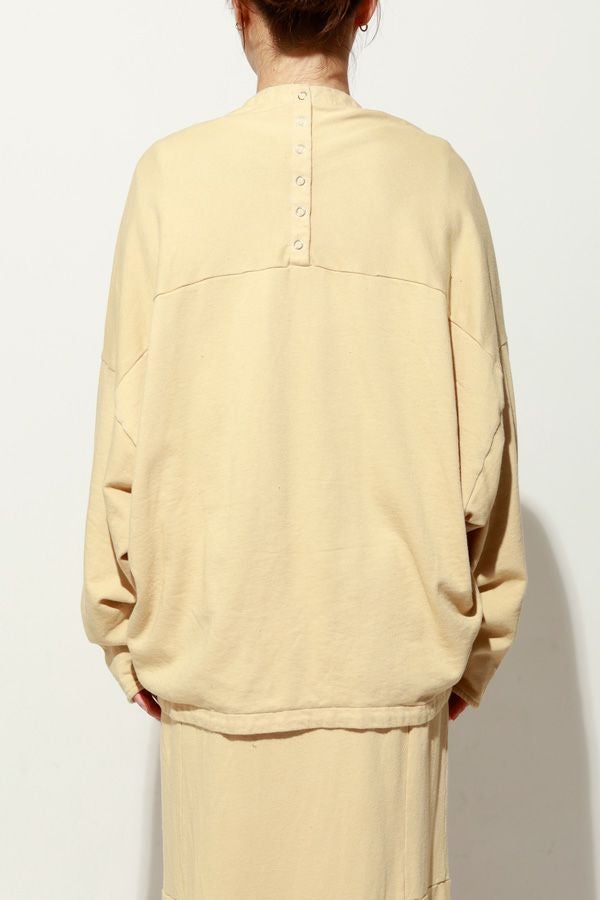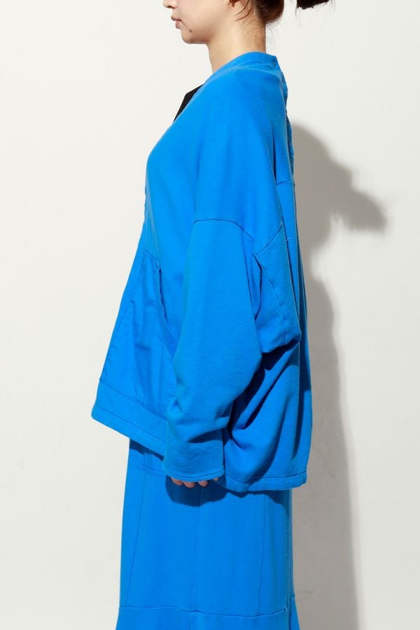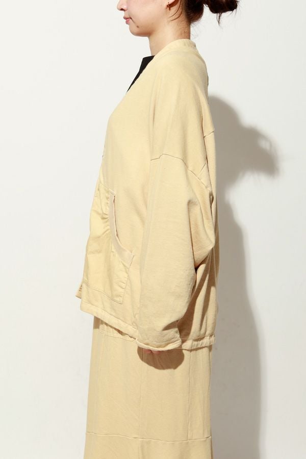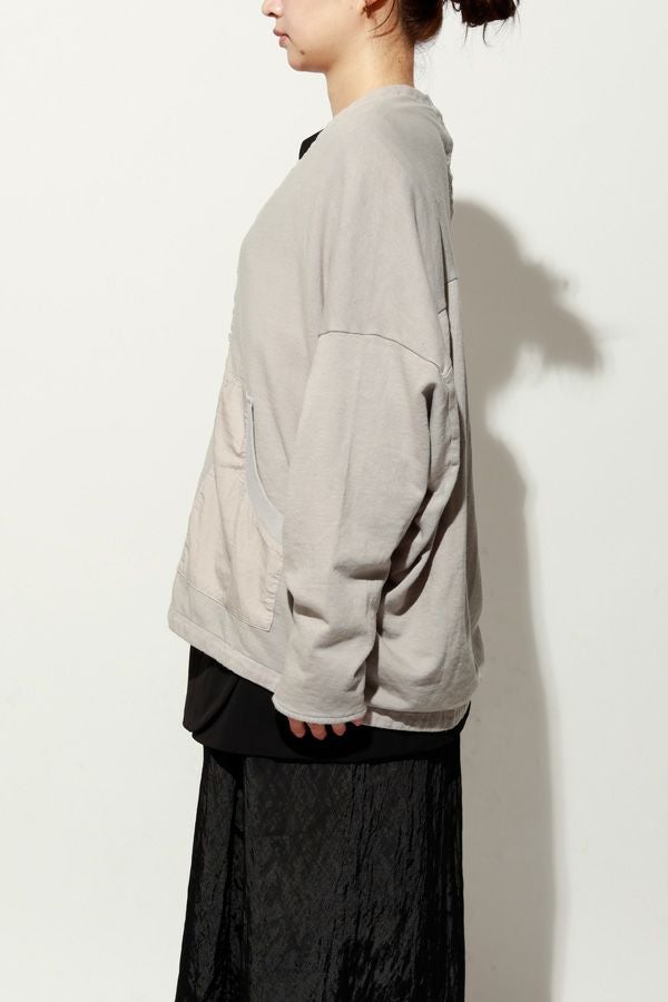 製品染めによる奥行きのあるカラーと風合いが魅力のアイテム。裏毛素材ならではの柔らかさと心地よい肌触りで、軽やかな着心地を実現します。後ろ衿のデザインがさりげないアクセントとなり、別布を用いた切り替えで立体感と動きのあるシルエットを演出。