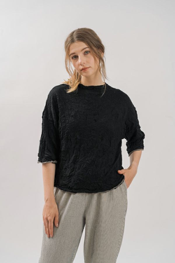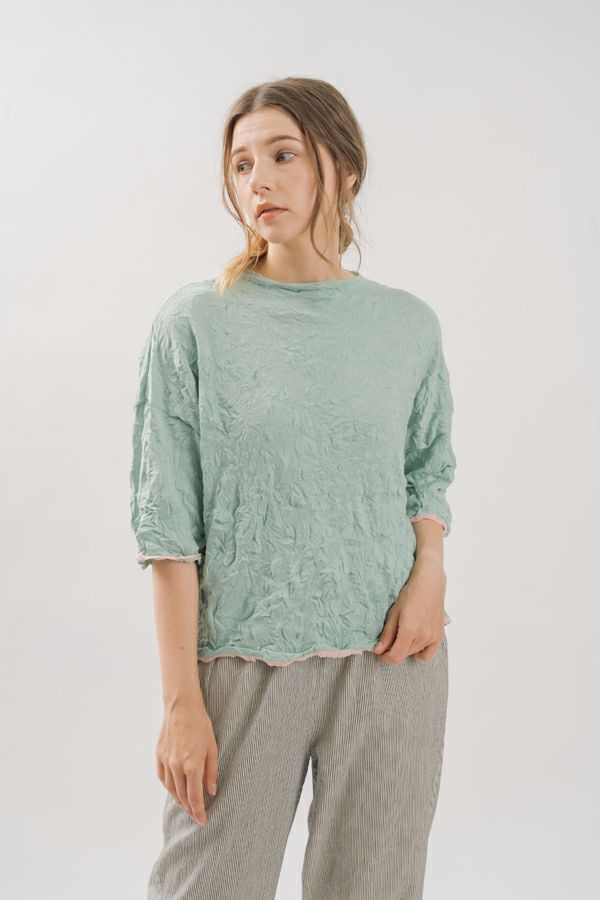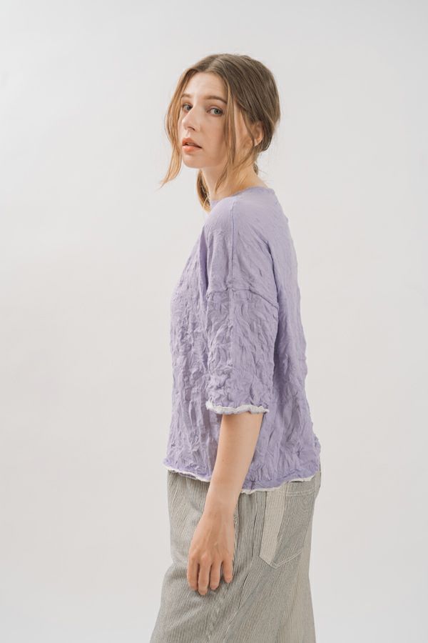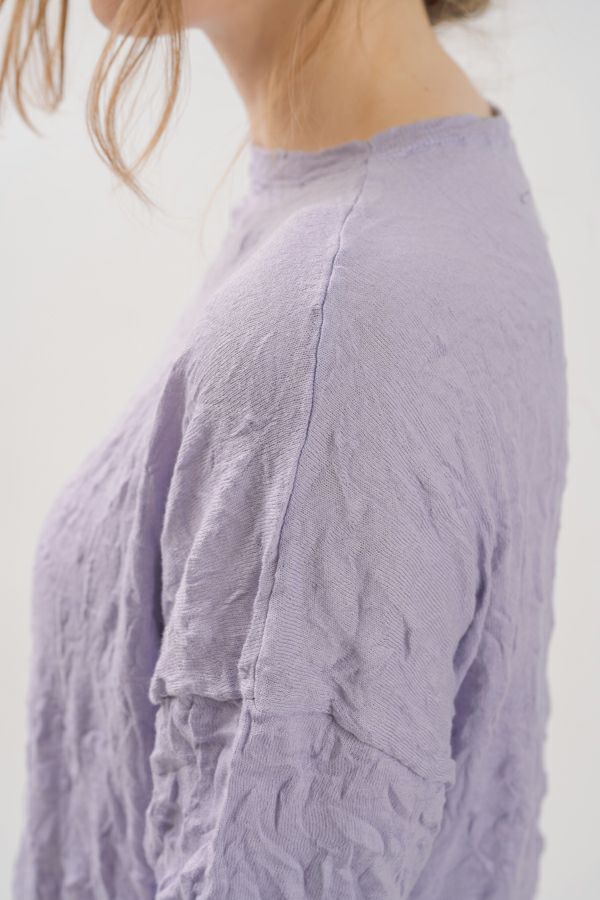 伸びも良く何度も着たい優しい肌触りのシワ加工プルオーバー 肌触りの良い綿ポリエステルの素材で、真夏以外年中着用可能な素材です。チクチクするの素材はイヤ!とおっしゃるお客様には、喜んで頂ける定番ロングランヒットの一着です。お色違いで買い揃えても後悔しません。 今回、お客様のご意見を頂いてお作りした新型ゆったりサイズのボートネック半袖が登場!肌にくっつき過ぎないサイズ感と半袖にすることで暑い時期でも着用していただけるようになりました。元々シワが入っている為、洗いざらしで着れるのも嬉しい。 職人の絶妙な加減で作られているシワ加工製品は一枚一枚のシワの出方が違う希少価値の高い製品です。ランダムに入るシワによって体型が出にくい外観にもなっています。綿とポリエステルの混紡素材で、伸びも良く何度も着たい優しい肌触りです。シワ加工に必ず必要なポリエステルは、ポリステルの特徴である熱に強く一度熱で変形させると元に戻らない性質を利用。ポリステルの混率が高いほどシワ加工のセット性も高くなります。今回ポリエステルの特性を生かして肌に優しい天然繊維の綿素材との混紡素材で市場では少ないシワ加工のセーターを作りました。