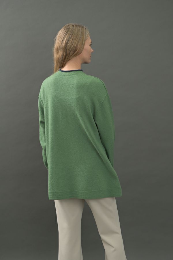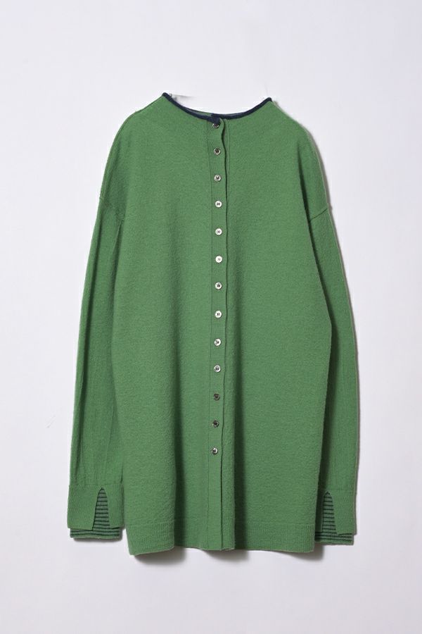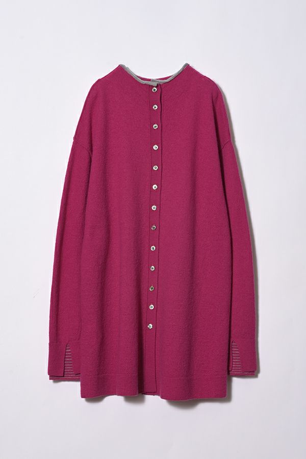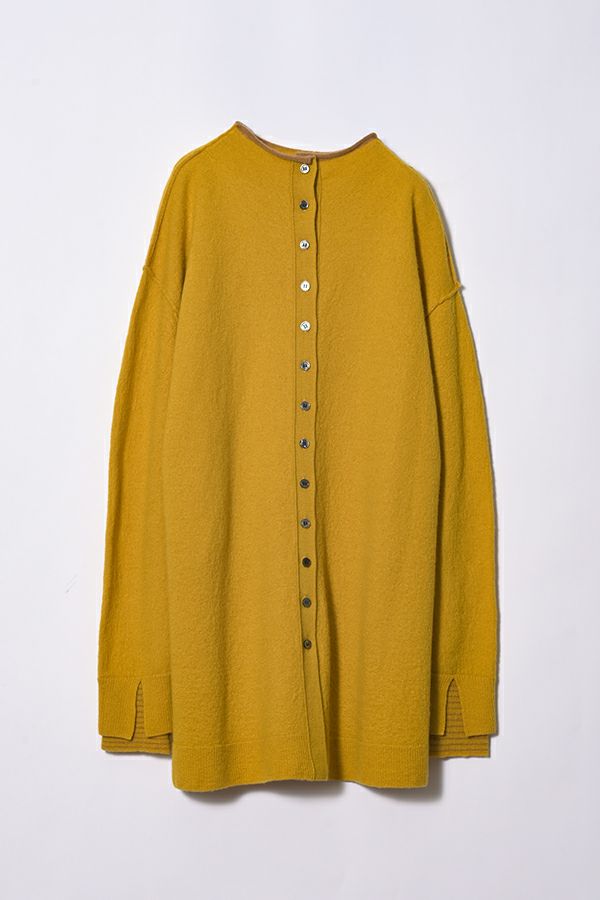 カーディガン、プルオーバーの2WAY着用が出来て万能ニット。 一見シンプルに見えるニットですが裾にかけてほど良くAラインに広がるシルエットに、チュニック丈を採用して体型カバーに優秀なアイテムです。 前後を逆にして、前身頃をシンプルデザインでボトムと合わせやすくしつつ、後身頃の釦を裾から何箇所か開けてスリットのように着用すると、こなれ感も演出してくれ 技ありのスタイリッシュコーデも! 毛100%圧縮加工の保温性・伸縮性・軽さも備わった万能な逸品です。 スキニーパンツを合わせていただくと、程よく上品に広がる裾周りが脚をすっきり見せでバランス良くスタイリングを楽しめます。