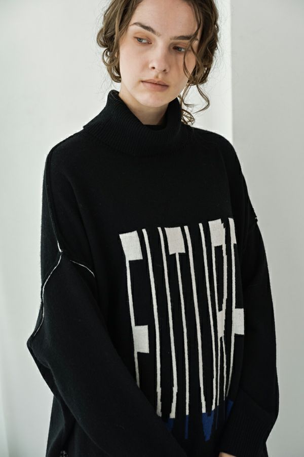 抜け感に、遊び心を。エフォートレスに着映えるロゴニットプルオーバー。 身体のラインを拾わない力の抜けたシルエットが醸し出す大人の余裕に大胆なロゴ使いが目を惹く着映えアイテム。 程よくゆとりのオフタートルはバックスリットを入れて後ろ姿も抜け感をもたせています。肩とアームホールは縫い代を出した配色ステッチが遊びを演出。 スッキリシルエットのボトム合わせでYラインシルエットコーデも良いですし、落ち感ある素材のボトムと合わせてこなれ感漂うスタイリングもお楽しみいただけます。