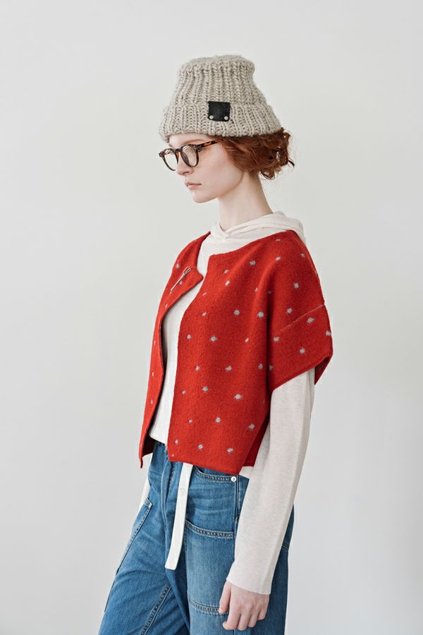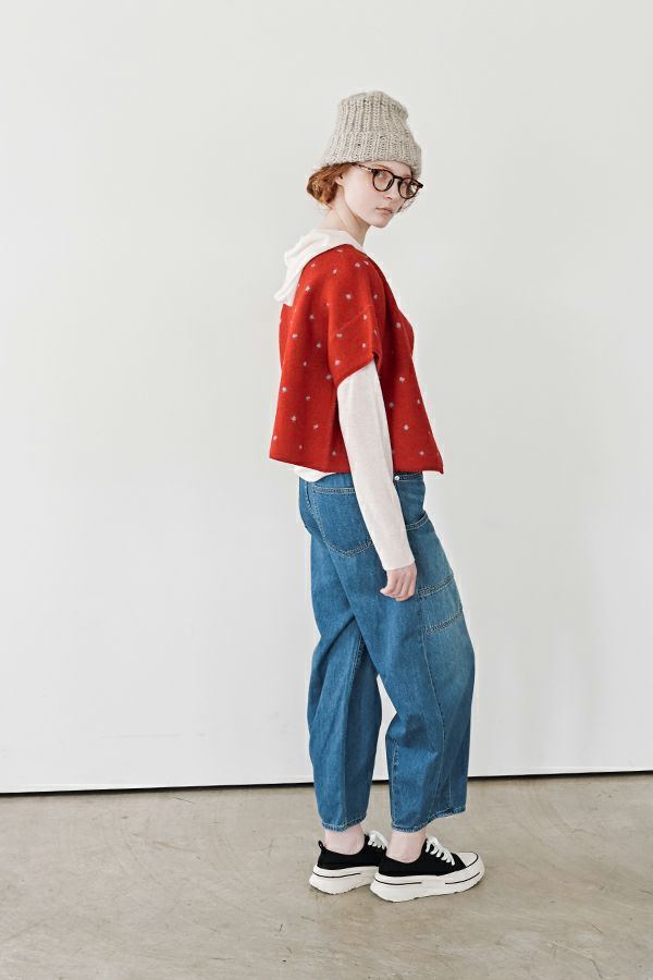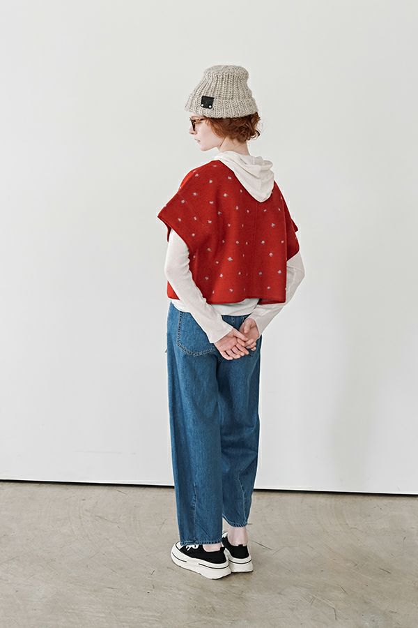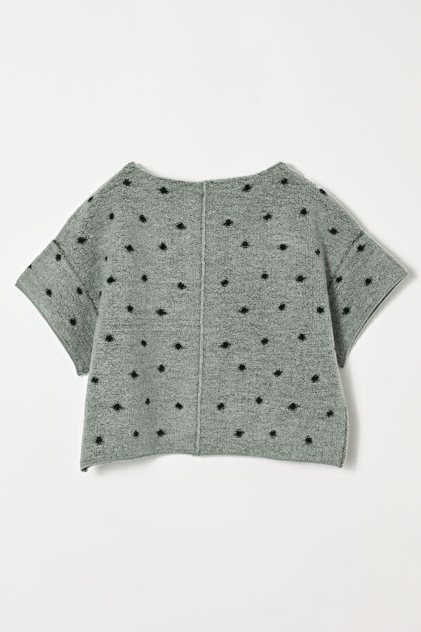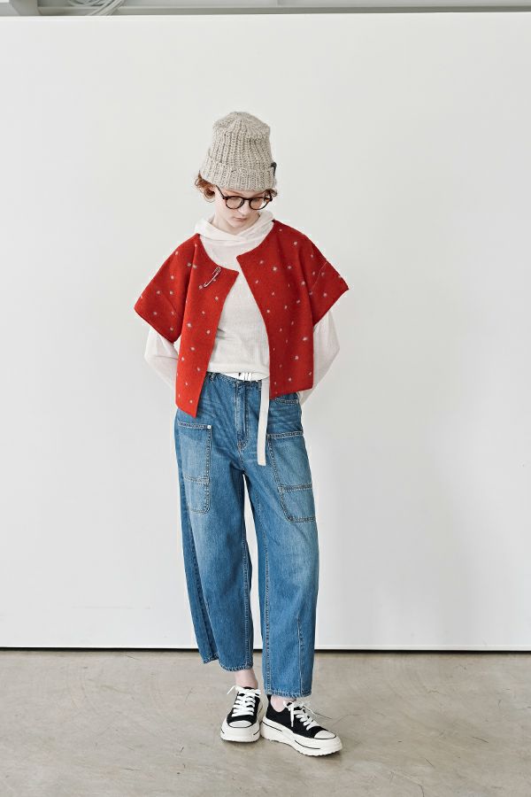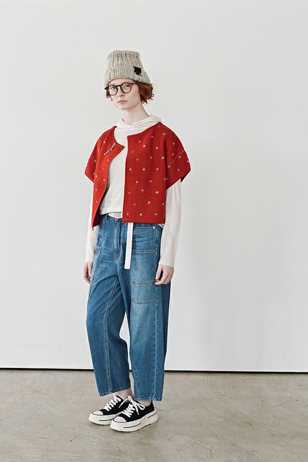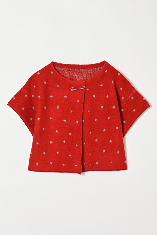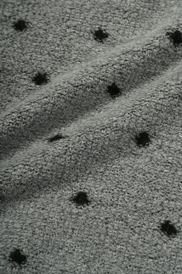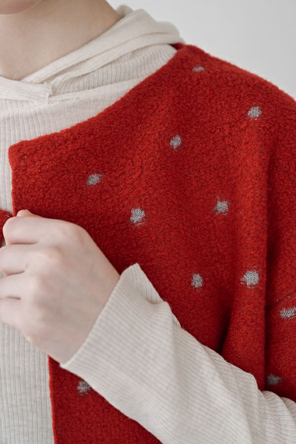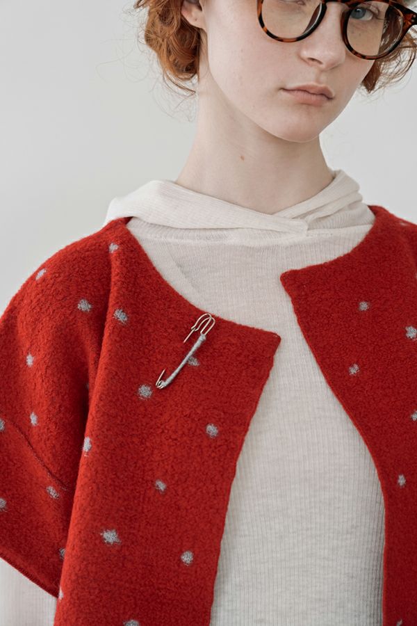 上質なぬくもりで包み込む、大人のパイルベスト。 肌寒さを感じる季節の羽織りとしてはもちろん、ベストとしてのレイヤード、そしてキュートに装いのアクセントとしても活躍する、マルチに着まわせる一枚。 毛100%の糸を贅沢に使用したパイル編み仕立ては、まるで極上の絨毯のような見た目と心地よい肌触りを兼ね備え、体を包み込むような暖かさを叶えます。 いびつなドット柄が程よい抜け感を演出し、付属のキルトピンで留め方を変えれば印象チェンジも自在に楽しめます。 ノーカラーデザインは顔まわりをすっきりと見せ、シアー素材やカットソーとのレイヤードも軽やかに決まります。コンパクトな丈感はボリュームのあるボトムスと好相性。ワンピースとのレイヤードもレディーライクコーデでお楽しみいただけます。