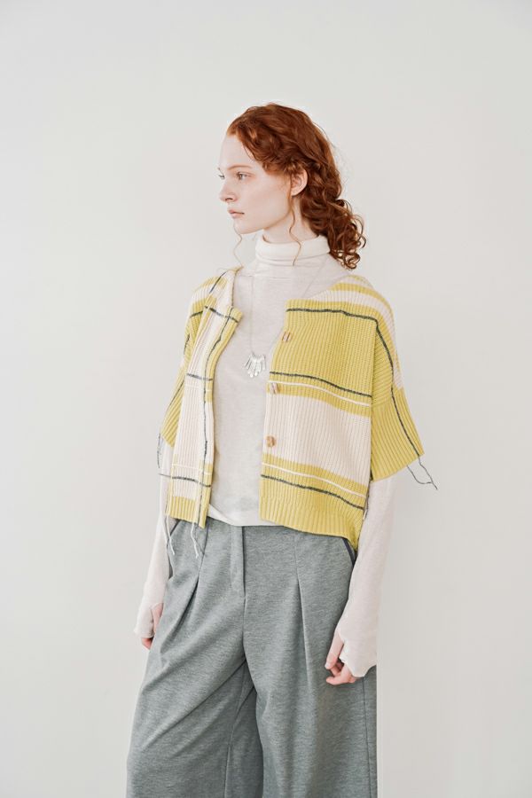 遊び心をひとさじ。大人の装いに映える、タッタソールニットベスト。 目を惹く配色のタッタソールチェックに、ニュアンスカラーの立体的なステッチが程よいアクセント。袖口と裾にはオーバーステッチを施し、さりげないクラフト感が表情を引き立てます。繊細なフリンジが動きに合わせて軽やかに揺れ、大人の遊び心を感じるデザインに。 コンパクトな丈感はウエストポジションを高く見せ、スタイルアップ効果も。ゆったりとした身幅が抜け感を生み、羽織るだけでリラクシーなボレロスタイルに。前を閉じてシャツの裾をのぞかせるレイヤードもおすすめです。 シンプルなスタイリングに添えるだけで、こなれた華やかさを演出する一着です。