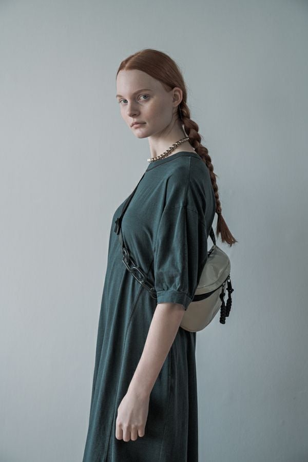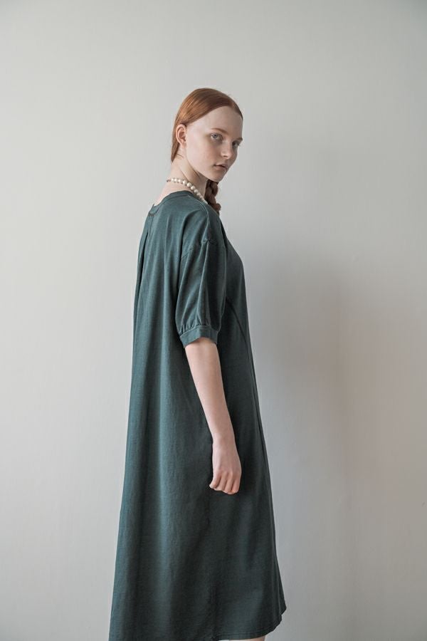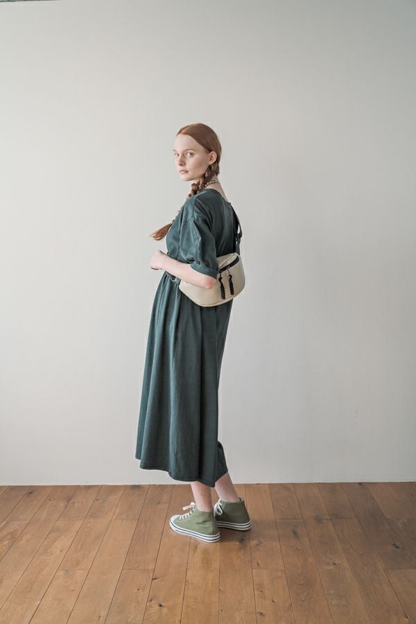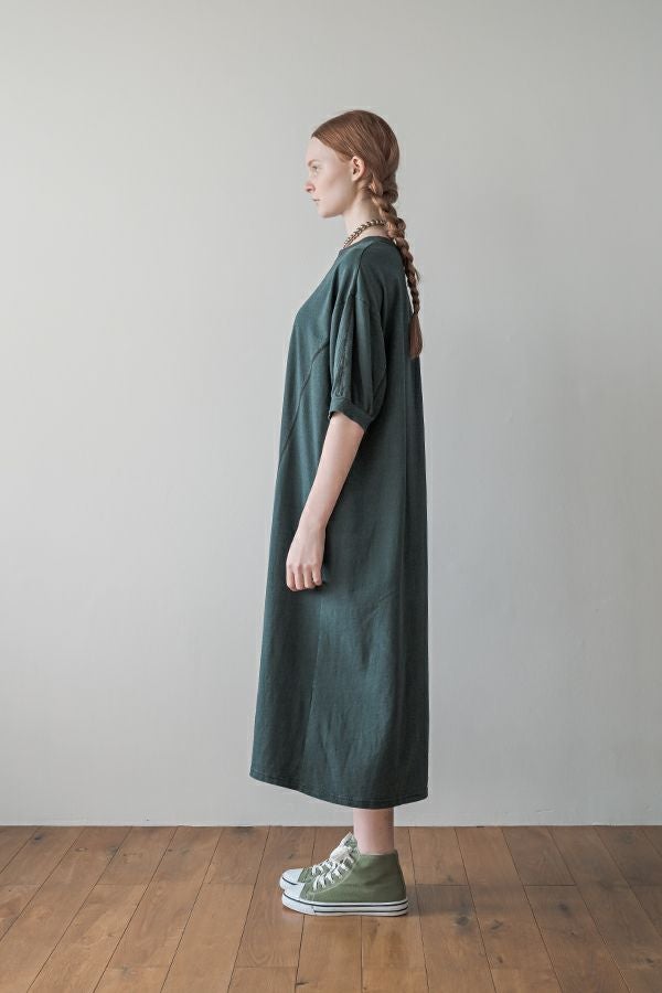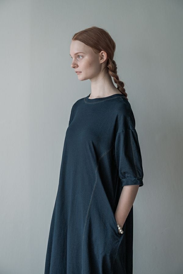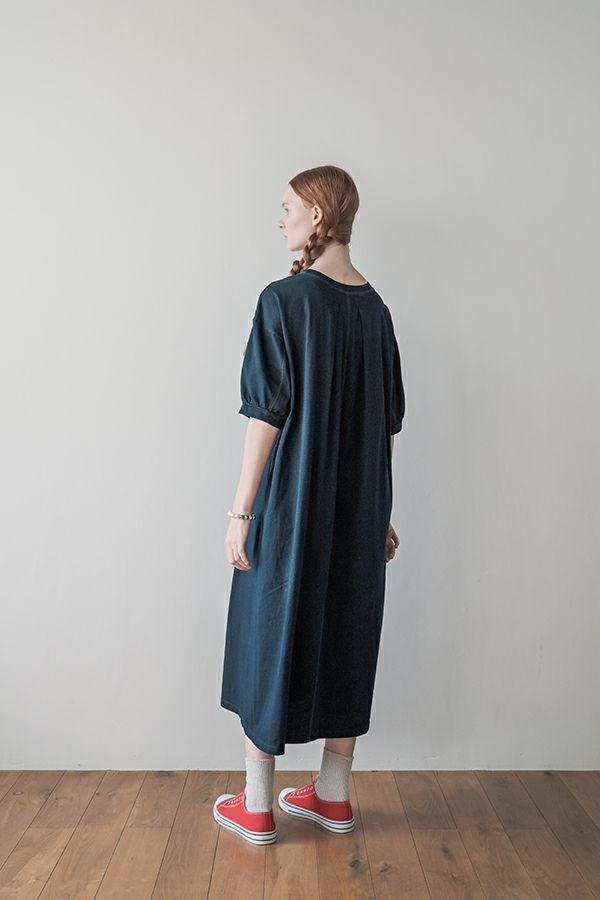 夏の即戦力。ストンと着てサマになる、デザインワンピース。 縦に入った配色飾りステッチと丸く膨らませた袖がキュート。デニムカットソー生地のセミAラインシルエットは、楽ちんなのにお洒落な1枚。安心の袖丈も嬉しいポイント。背中に入った斜めタックは、気になる背中の丸みをカバーしてくれます。 製品洗いで柔らかく仕上げ、カットソーならではのストレッチ性で着心地も良く、1枚着はもちろん、コーディネート次第でロングシーズン着用可能です。 サンダルでもスニーカーでもソックスを履いても似合うワンピースは即戦力、間違いなし。 ●色落ちしますので、他の物と一緒に洗わないで下さい。ご愛用とともに、独特の色落ちの変化をお楽しみください。