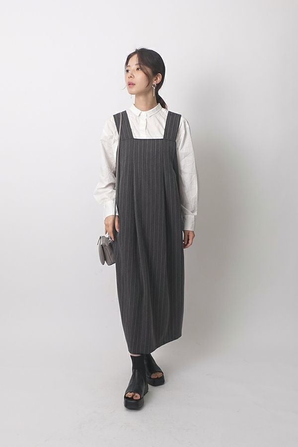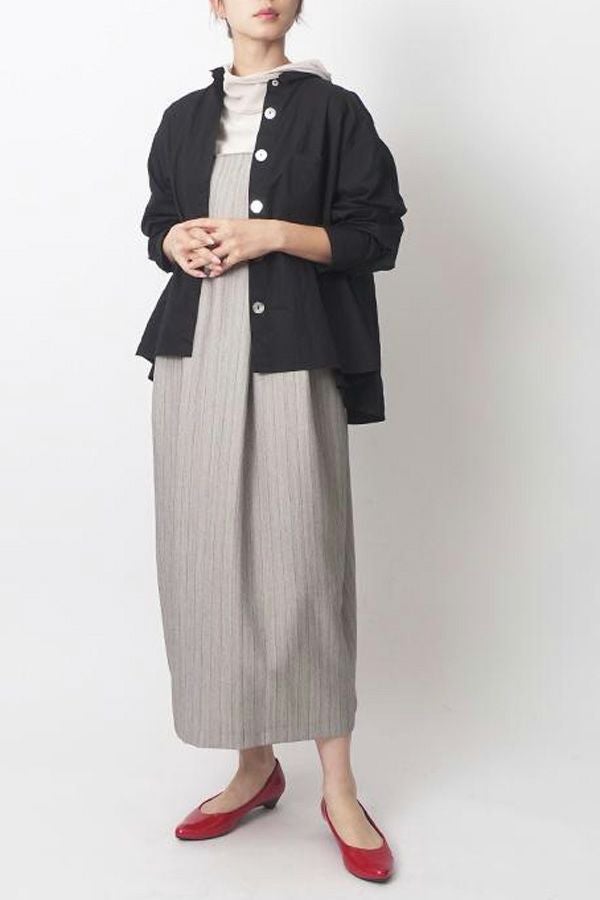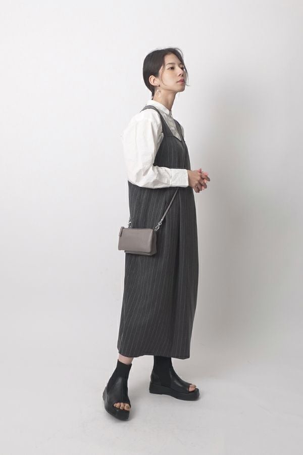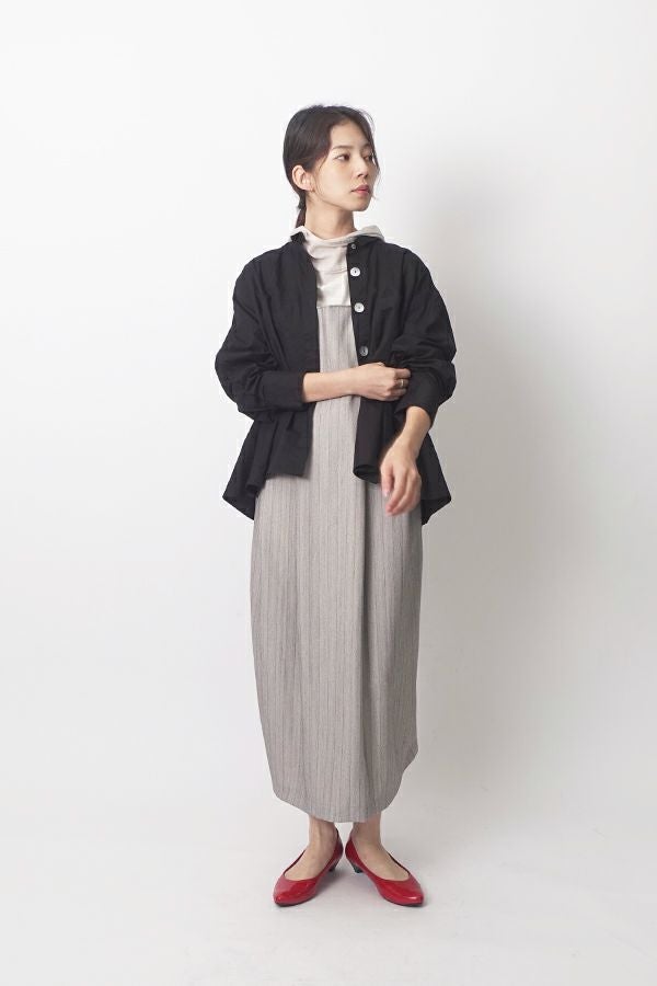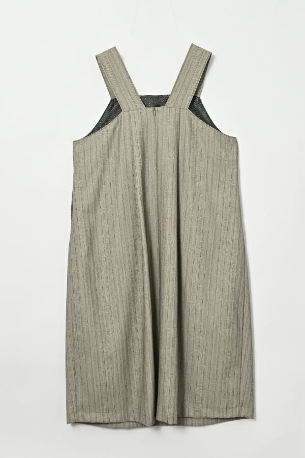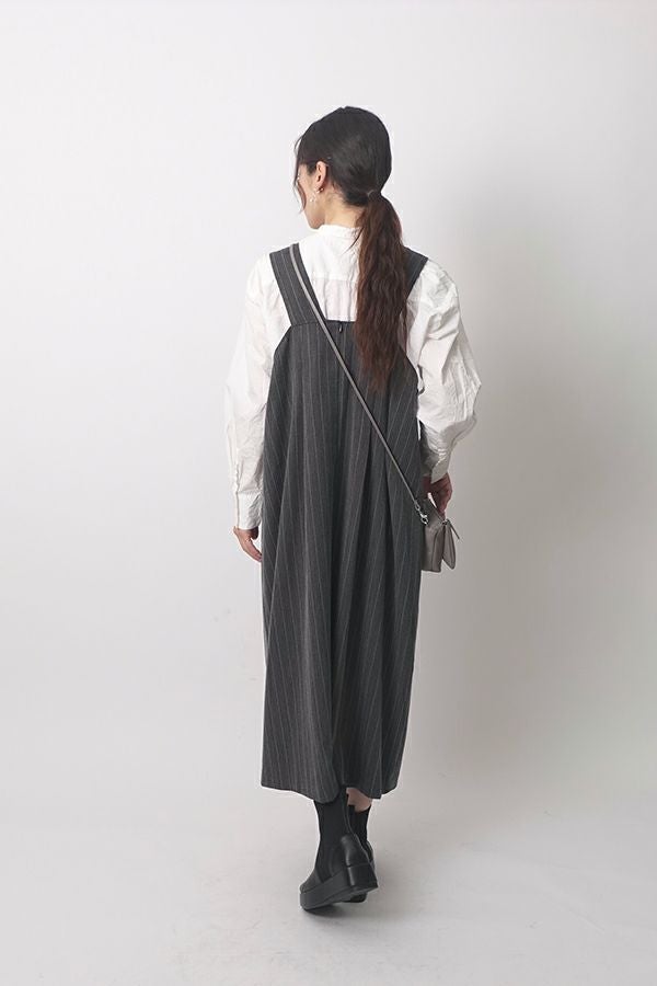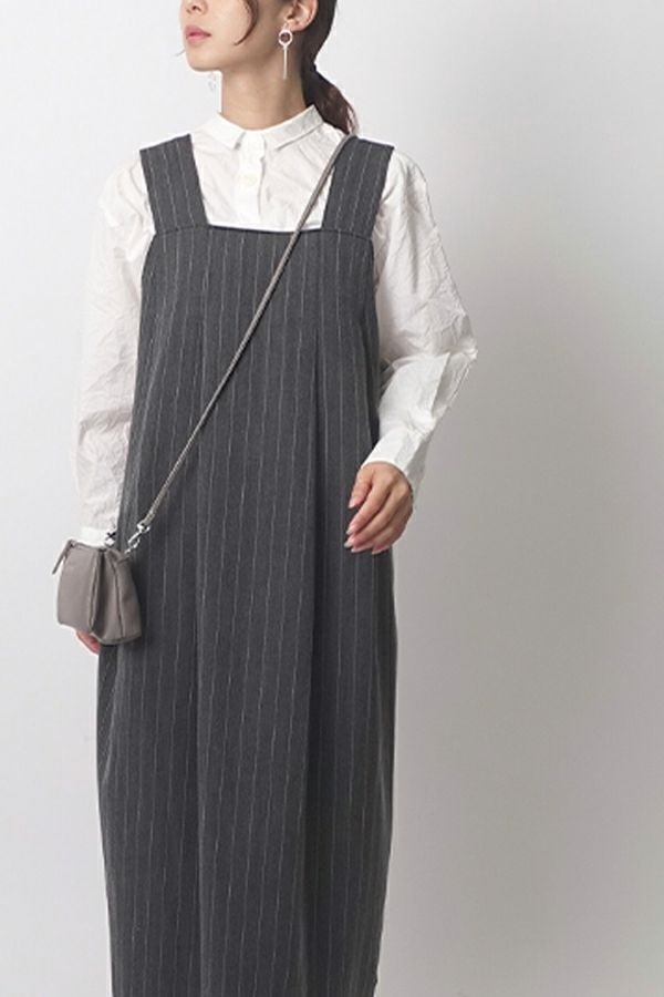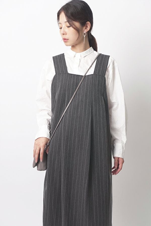 立体感で魅せる、大人の余裕ジャンスカ。 ソフトで落ち感のある合繊素材に、控えめなヘリンボン+ストライプ柄を織り込み、上品な抜け感と洗練された大人の雰囲気を演出。シワになりにくく、デイリーに頼れる一枚です。 前後に深く入れたタックが立体感を生み、胸元から裾へ自然に流れるゆるやかなコクーンシルエットが、身体のラインを拾わず美しくカバー。広めのアームホールや太めの斜めに付いた肩ひもが安定感を高め、インナーを選ばない着回し力も魅力です。 まだ残暑が残る時期にはTシャツを合わせて、初秋のスタイリングに。シーズンを越えて、長く活躍する大人のためのジャンスカです。