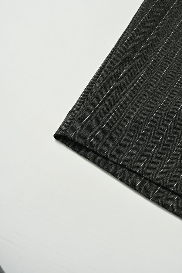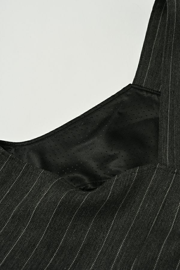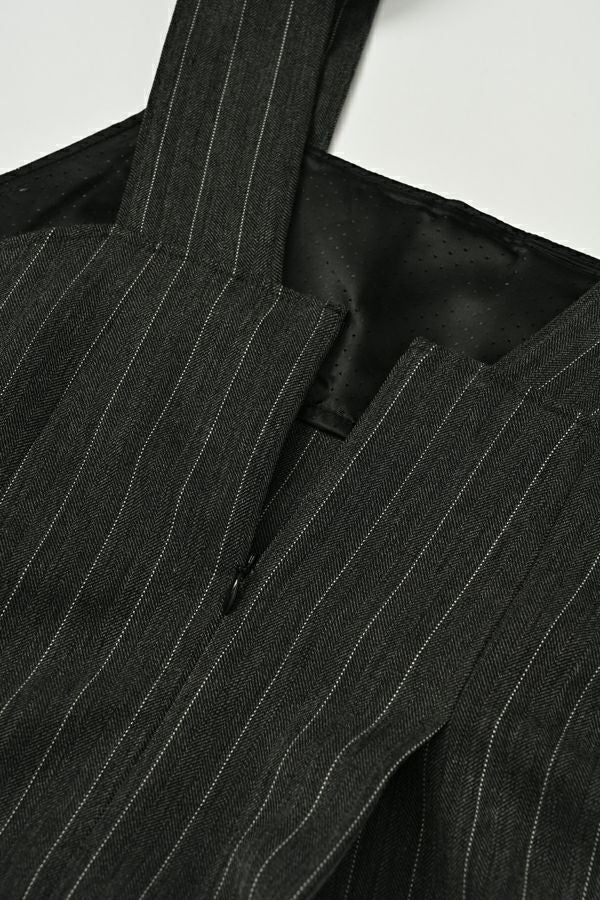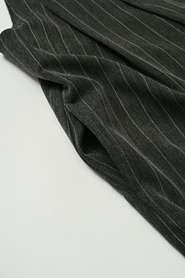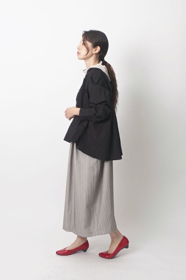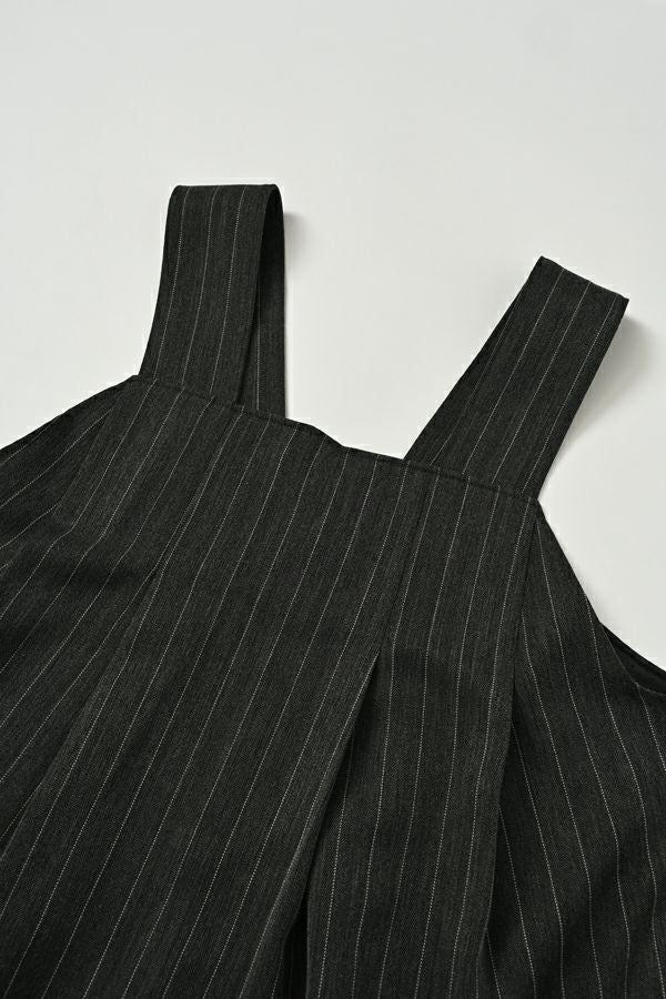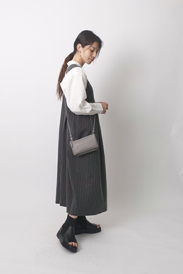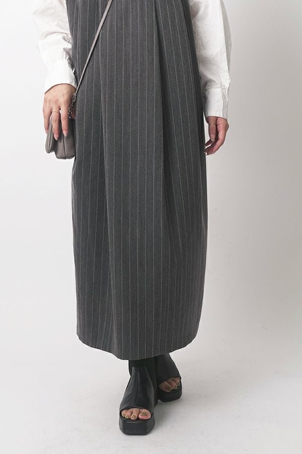 立体感で魅せる、大人の余裕ジャンスカ。 ソフトで落ち感のある合繊素材に、控えめなヘリンボン+ストライプ柄を織り込み、上品な抜け感と洗練された大人の雰囲気を演出。シワになりにくく、デイリーに頼れる一枚です。 前後に深く入れたタックが立体感を生み、胸元から裾へ自然に流れるゆるやかなコクーンシルエットが、身体のラインを拾わず美しくカバー。広めのアームホールや太めの斜めに付いた肩ひもが安定感を高め、インナーを選ばない着回し力も魅力です。 まだ残暑が残る時期にはTシャツを合わせて、初秋のスタイリングに。シーズンを越えて、長く活躍する大人のためのジャンスカです。