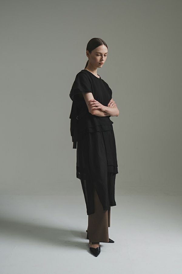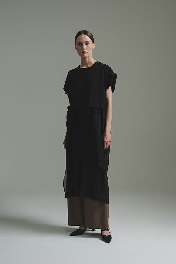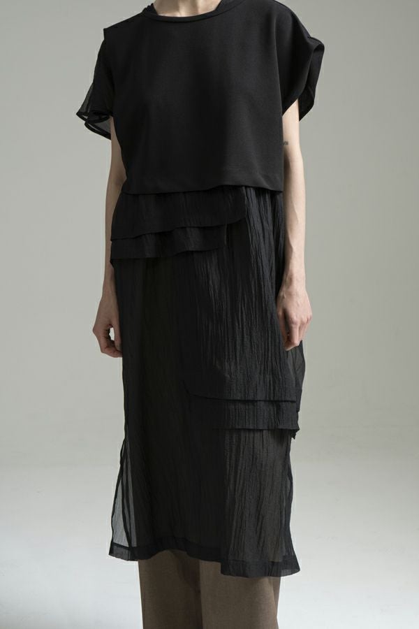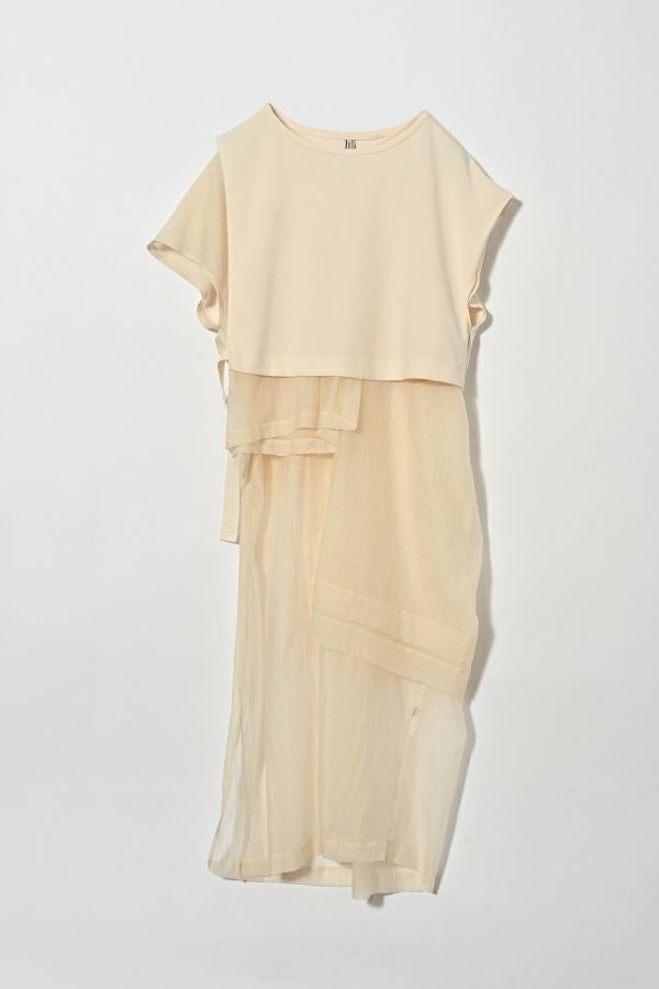 異素材MIXで魅せる、レイヤードデザイン ワンピース。 きれいめな裏毛トップスに、エアリーなシアー素材のインナーワンピースを組み合わせた、着映え力抜群のアイテムです。異素材のコントラストが惹き立ち、軽やかな透け感がスタイリングに旬なムードをプラスします。 トップス部分は、柔らかく肌触りの良い裏毛素材を使用し、リラックス感のある着心地に。インナーワンピースには動くたびに揺れるシアー素材を採用し、抜け感とフェミニンさを演出。 どちらも単品使いが可能で、気温やシーンに合わせた着回しが楽しめるのも魅力。 【夏の涼しげコーデ】 お気に入りのデニムの上にワンピースをレイヤードして、いつもとはひと味違うスタイリングに。 【秋のモードコーデ】 ブーツやロングコートを合わせれば、シーズンムードを高める秋らしい装いに。 さらにトップスの下にシャツやロンTEEを重ねて、より立体的なレイヤードスタイルが完成します。