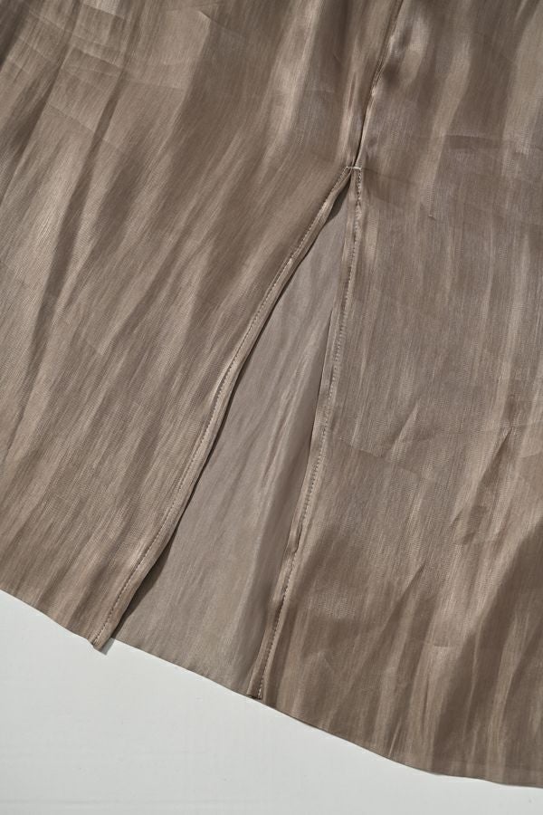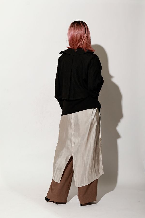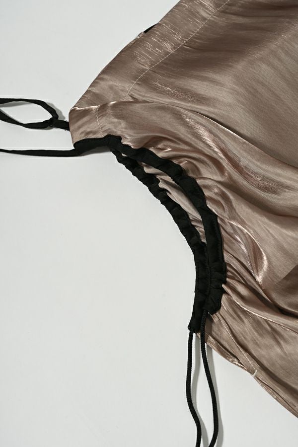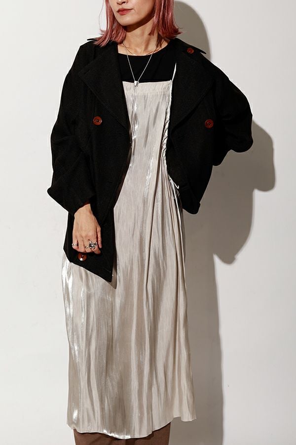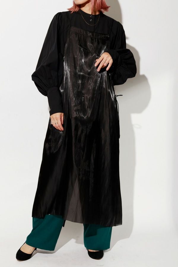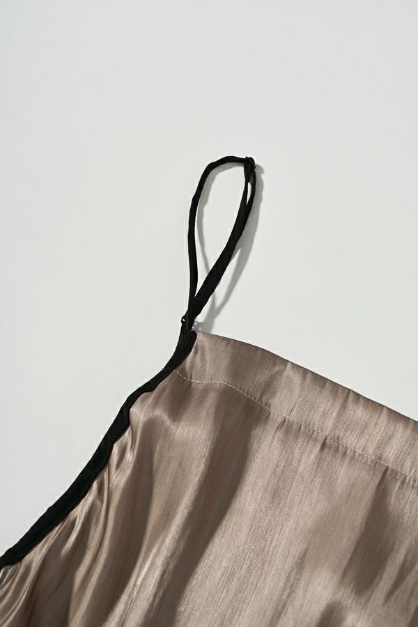 着丈アレンジで自由自在、シーズンレスに活躍するキャミワンピース。 タテ糸に光沢糸を使った甘織りのサテンを使用し、角度や光の加減でさりげなく表情を変える上品な光沢が魅力。さらに、別地に使用したヴィンテージサテンのパイピングがアクセントとなり、高見えする仕上がりに。 コンパクトにまとまりシワにもなりにくいため、旅行などの持ち運びにも最適。肩紐だけでなく、アームホール部分の紐でも着丈やシルエットの微調整ができるため、シーンや季節に合わせたスタイリングが自在です。 ロンTEEやデニムに重ねてモード感をプラスするのはもちろん、柄物やレースなど存在感のあるインナーと合わせれば、印象的な着こなしも叶います。カジュアルにも華やかにも振れる、着回し力抜群のアイテムです。