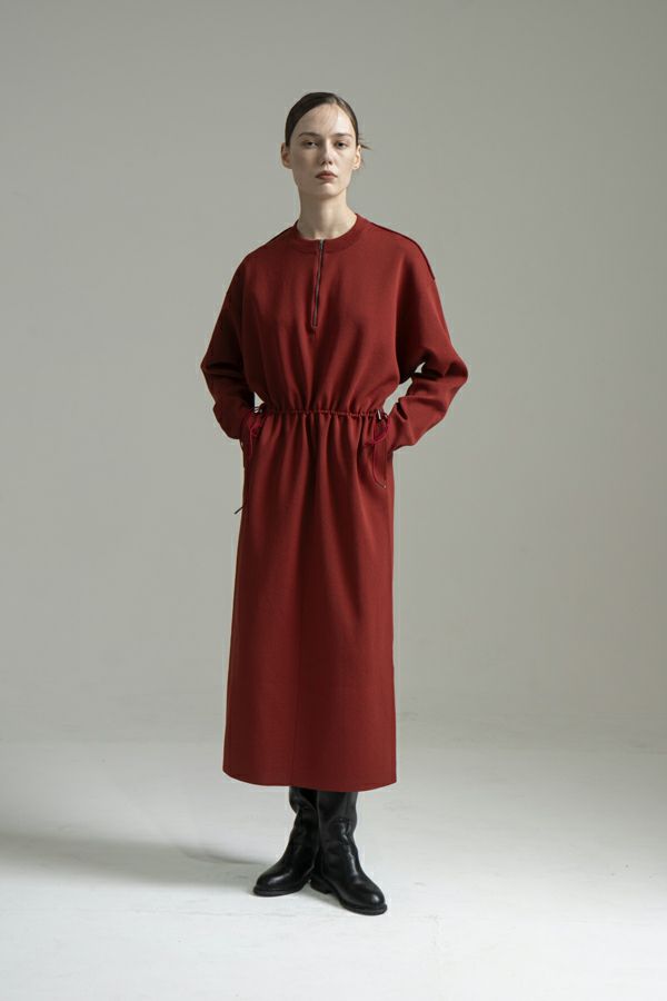 デイリーからオケージョンまで、着るだけでサマになる洗練ワンピース。 1枚でさらっと決まる、万能アイテム。ウエストのスピンドルでシルエットに変化をつけられ、その日の気分やスタイリングに合わせて自由自在に調整可能。計算されたリラックスシルエットは体のラインを拾わず、すっきりとした印象に。しわになりにくい素材で、持ち運びや旅行にも最適です。 上品なマットな光沢のあるニット糸を採用し、シーズンを問わず長く着られるのも嬉しいポイント。日常使いはもちろん、オフィスやお出かけ、ちょっとしたフォーマルシーンまで、あらゆるシーンで頼れる着回し力抜群のアイテムです。 【秋のモダンレイヤード】 ショート丈ジャケットを羽織れば、エッジの効いたスタイリングに。足元はロングブーツやスクエアトゥのブーティでモード感をプラス。 【冬のエフォートレス&洗練コーデ】 オーバーサイズのロングコート(チェスターやノーカラー)をさらりと羽織って、ミニマルで洗練されたスタイルに。 ●手洗い可