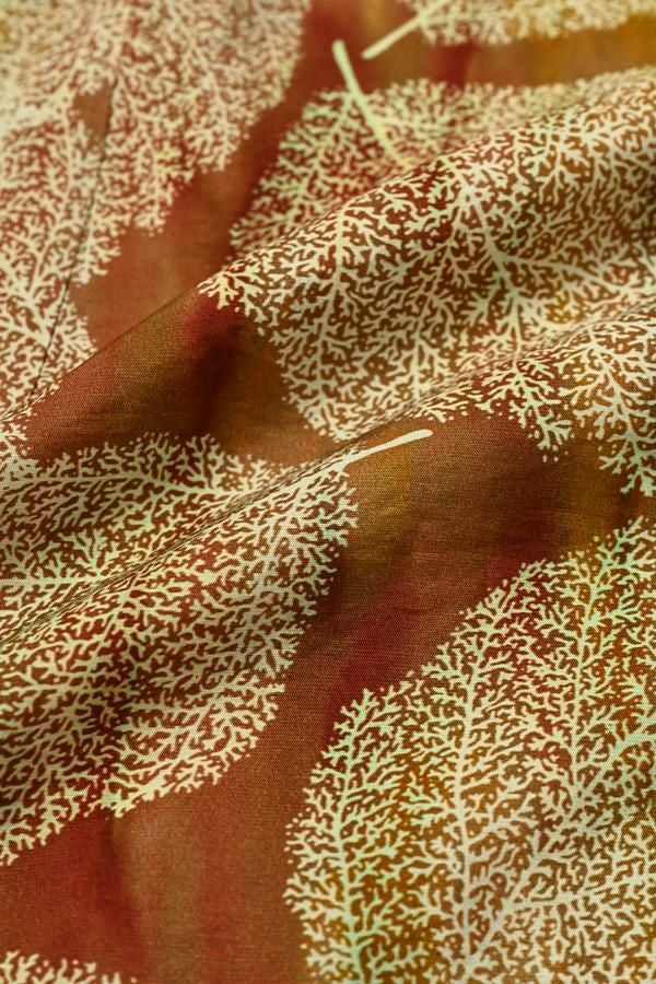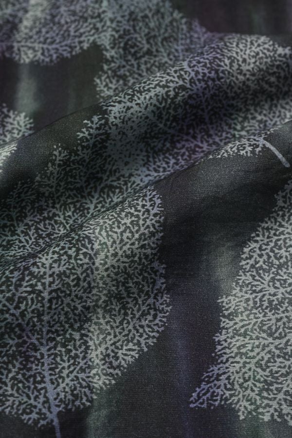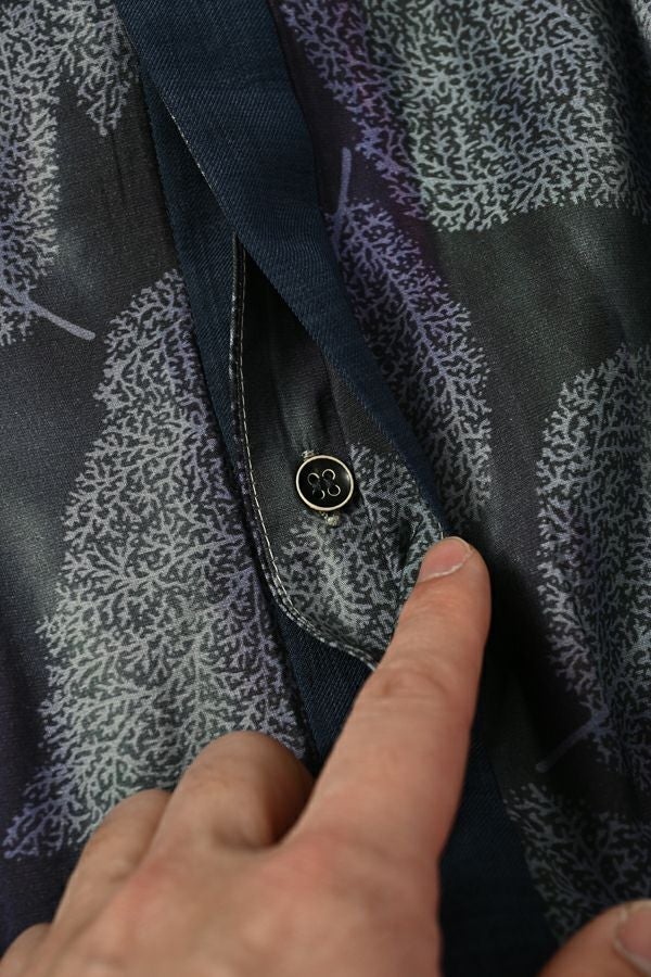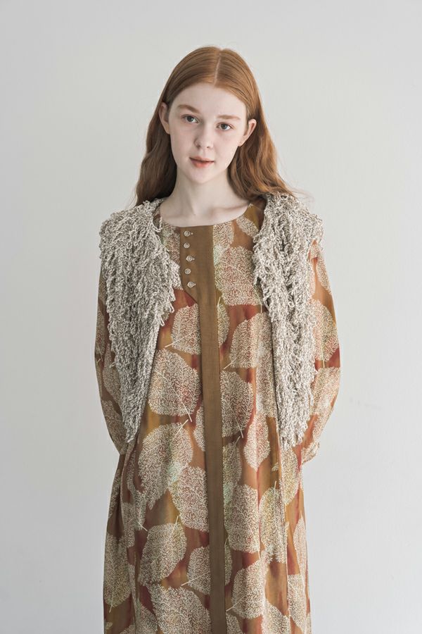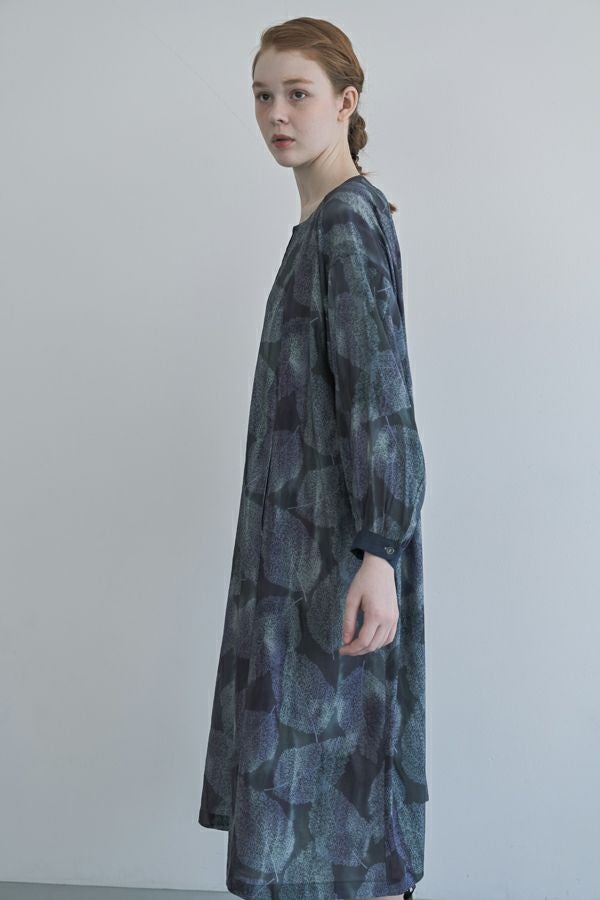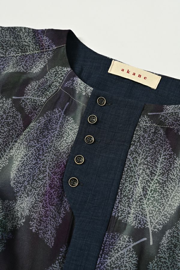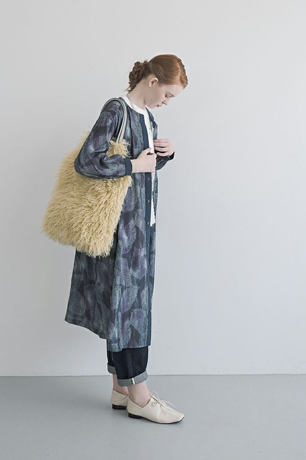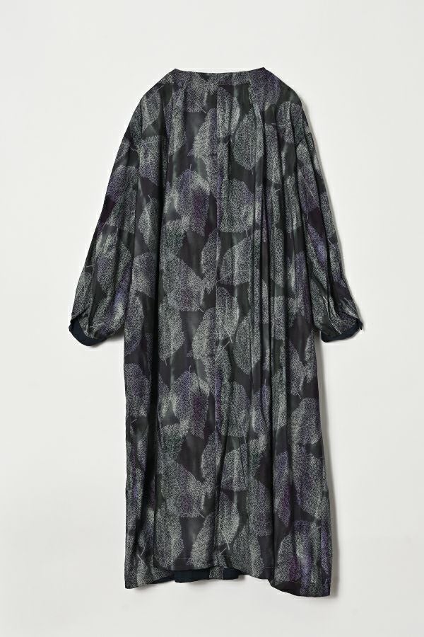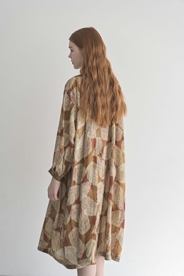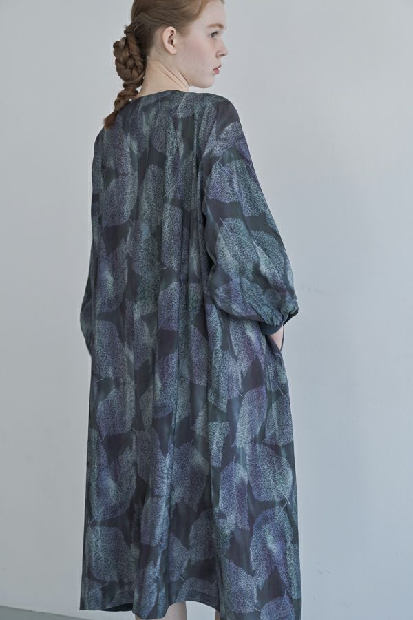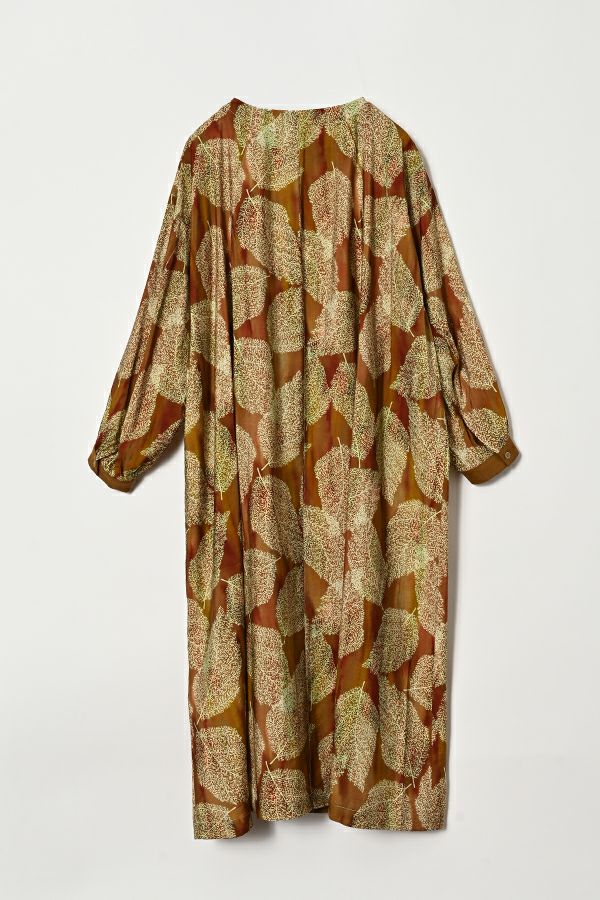 幻想的なオーロラ×舞い散う木の葉、ドラマティックな前開きワンピース。 今秋のakaneオリジナルプリントは、幻想的なオーロラを背景に木の葉が舞い散るロマンティックなデザイン。 繊細で女性らしい落ち感のあるヴィンテージライクな合繊素材を使用し、羽織りとしても活躍する2WAY仕様になっています。パッと華やぐ存在感に加え、優しく膨らんだ袖と8枚の縦切り替えが施された身頃が、ドラマティックながらもすっきりとしたシルエットを実現。 小さく並んだ5つのボタンがアクセントになり、下は裾まで比翼仕立てなので、閉じれば1枚着のように見えます。さらに、自宅でのイージーケアが可能なのも嬉しいポイント◎ 小物次第でちょっとしたお出かけ着にも、スニーカーと合わせたカジュアルダウンスタイルにもぴったりな万能ワンピースです。