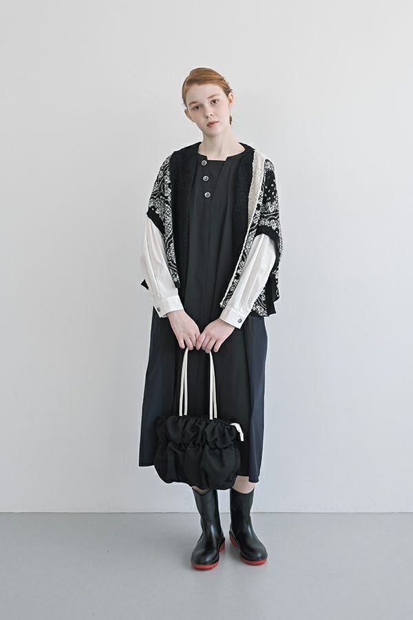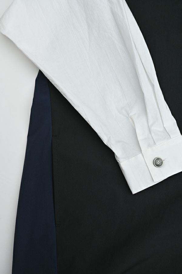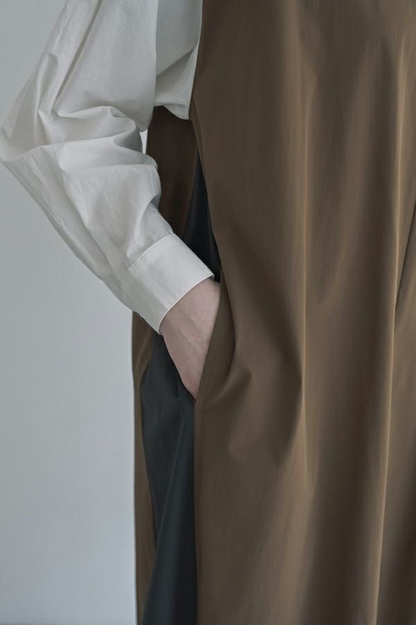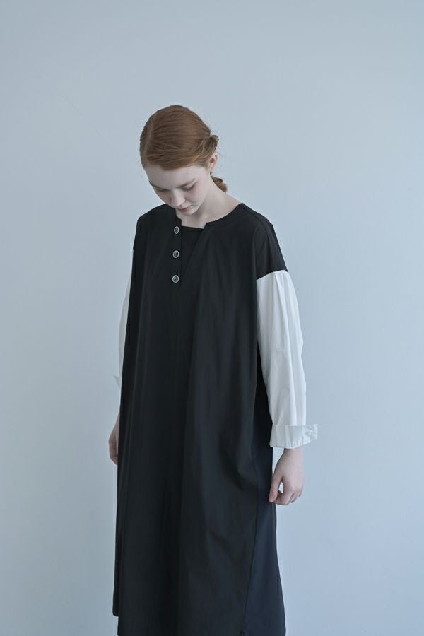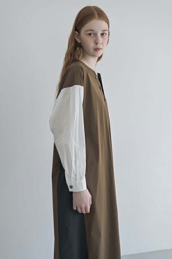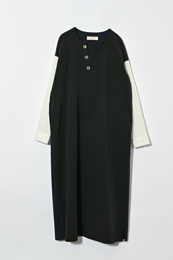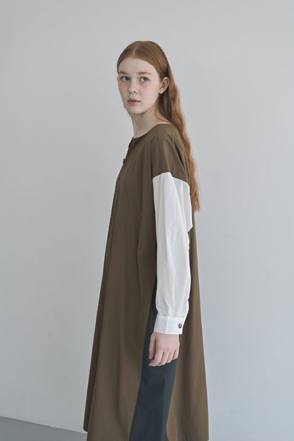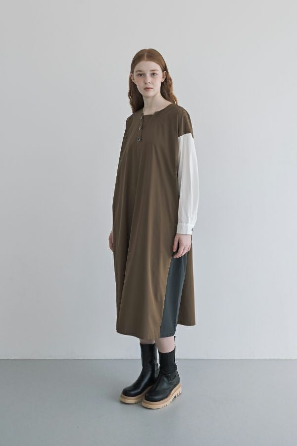 ストンと着るだけで決まる、ボックスシルエットのVネック風ワンピース。 軽くて柔らかく、ストレッチ性のあるナイロン素材を使用。軽やかなのに立体的なシルエットが叶う一枚です。 マチの入ったボタンアクセントが胸元をすっきり見せ、女性らしい印象を演出。白いシャツ袖が上品で高級感をプラスしつつ、脇の配色切り替えやフロントのボタンデザインが程よくカジュアルな雰囲気を加え、バランスの取れた仕上がりに。 素材には適度なハリ感があり、シワになりにくいのも嬉しいポイント。着こなしのアレンジも自由自在。カジュアルに楽しむなら、スニーカーやサイドゴアブーツと合わせて◎アクセサリーをプラスすれば、オケージョンシーンにも対応可能。 1枚でさまざまな表情を楽しめる、万能ワンピースです。