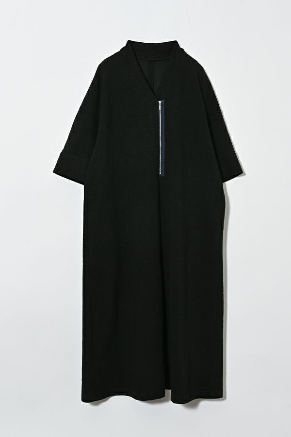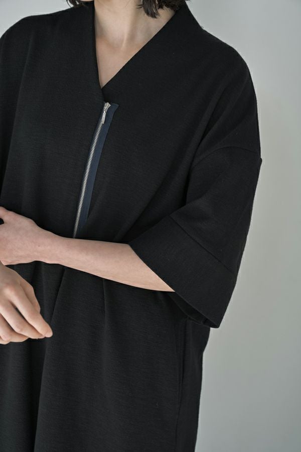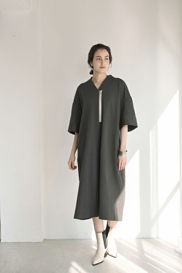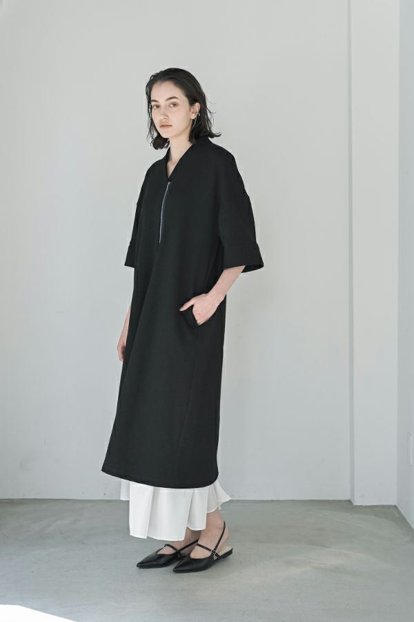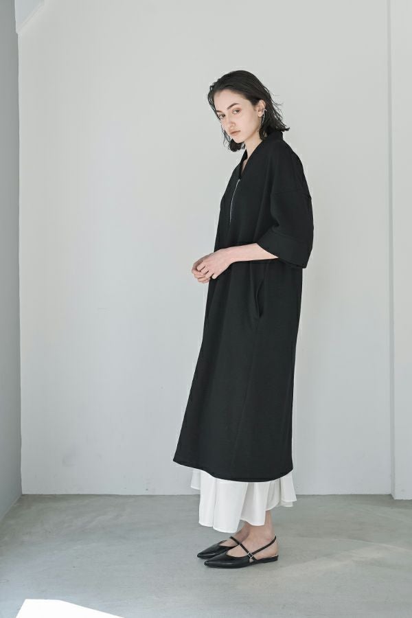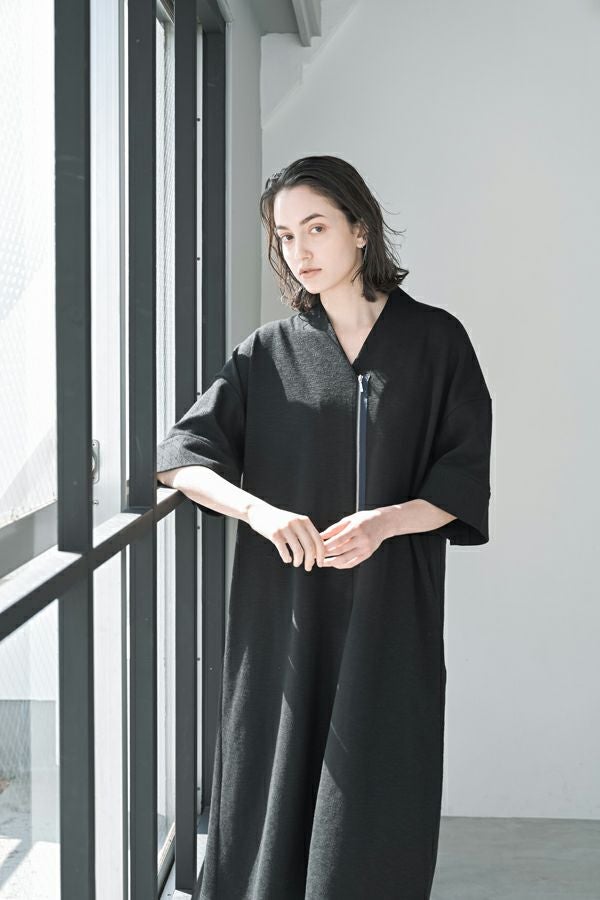 構築的シルエットで魅せる、マニッシュエレガンスなワンピース。 表面感のある綿ポリエステル糸を使用し、ハリと落ち感のバランスが美しい素材感が魅力。体のラインを拾いすぎず、凛としたシルエットを描くことで、着る人の存在感を惹き立てます。 デコルテが美しく映えるよう計算されたネックラインに、配色ファスナーをあしらい、開き具合で印象の変化も楽しめる仕様に。1枚で装いが完成する、モードな中に女性らしさが光るワンピース。 大人のための“マニッシュエレガンス”を、ぜひ体感してください。 ●手洗い可