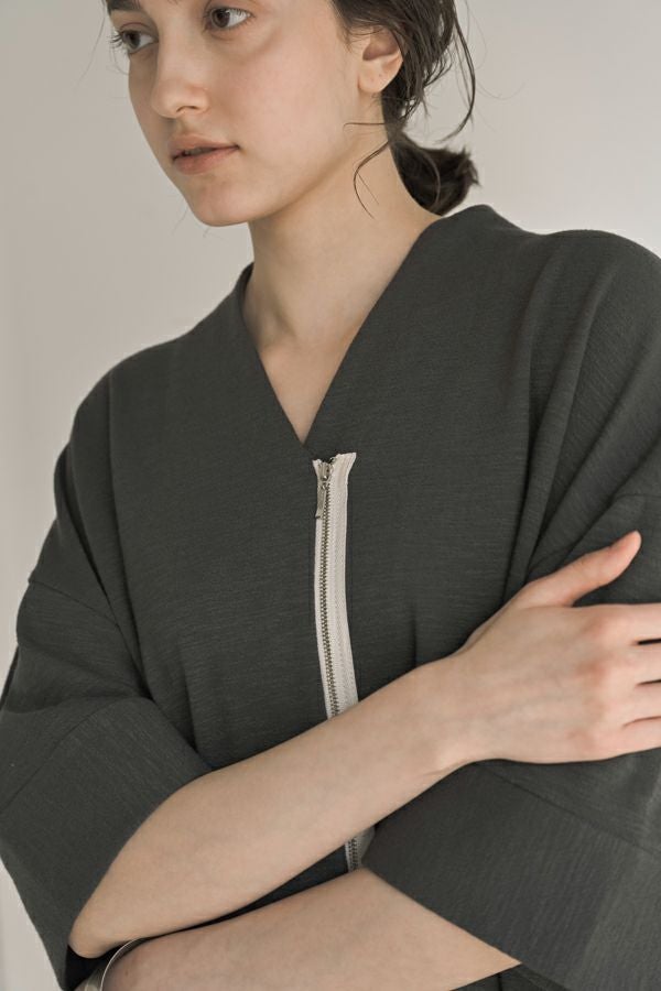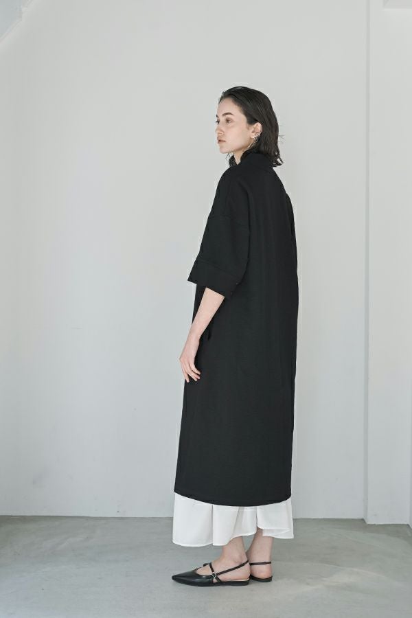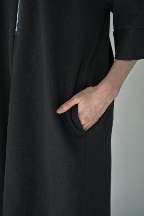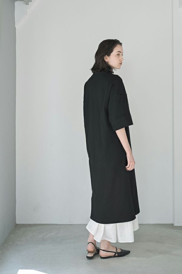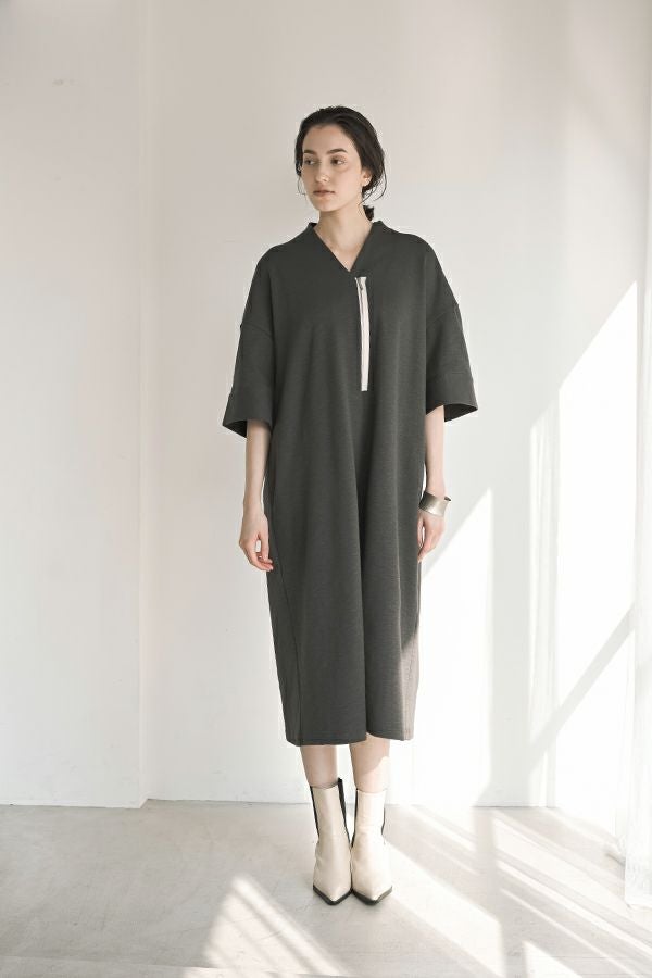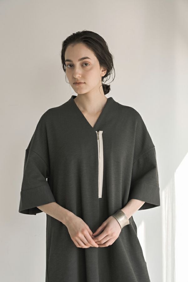 構築的シルエットで魅せる、マニッシュエレガンスなワンピース。 表面感のある綿ポリエステル糸を使用し、ハリと落ち感のバランスが美しい素材感が魅力。体のラインを拾いすぎず、凛としたシルエットを描くことで、着る人の存在感を惹き立てます。 デコルテが美しく映えるよう計算されたネックラインに、配色ファスナーをあしらい、開き具合で印象の変化も楽しめる仕様に。1枚で装いが完成する、モードな中に女性らしさが光るワンピース。 大人のための“マニッシュエレガンス”を、ぜひ体感してください。 ●手洗い可