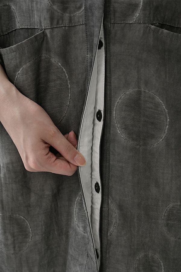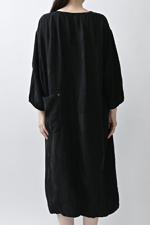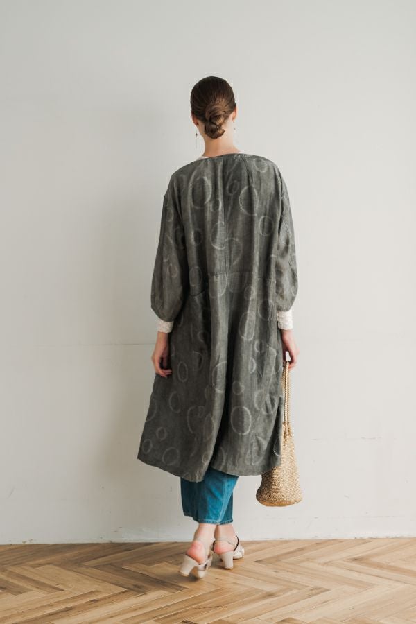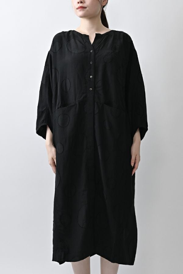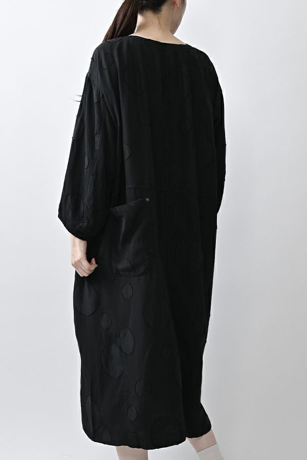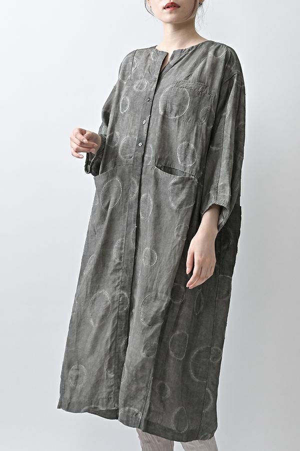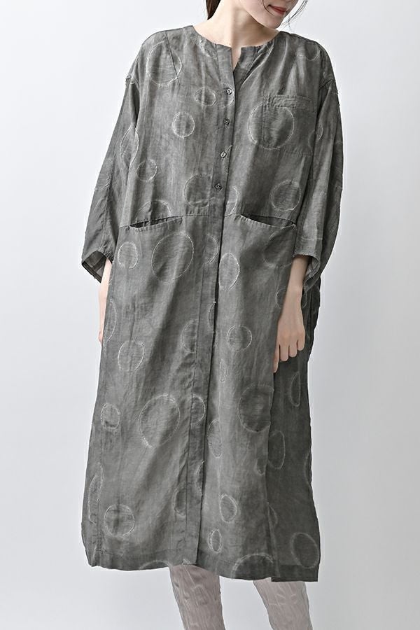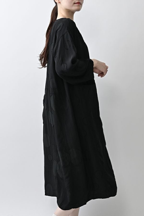 光沢と立体感が映える、大人モードなドットジャガードワンピース。 無地ベースに立体的な大きめドット柄を施したカットジャガードは、落ち感と上品な光沢が特徴で、オケージョンシーンにも映える一着。 ゆるやかなコクーンシルエットと、袖に丸みをもたせたフォルムがモードな印象をプラス。前を閉じればワンピースとして、前を開ければコート風としても着られる比翼開きデザインで、コーディネートの幅が広がります。 ワンピースとして楽しむ際はパンツと合わせて上品に。コート風に羽織る場合は、鮮やかな色のニットやカットソーを合わせ、カジュアルなパンツスタイルと組み合わせれば、大人の洗練されたカジュアルモードが完成します。 ●人気のドライタッチデニムワンピース(25158-2145F-R)と同型 ●手洗い可