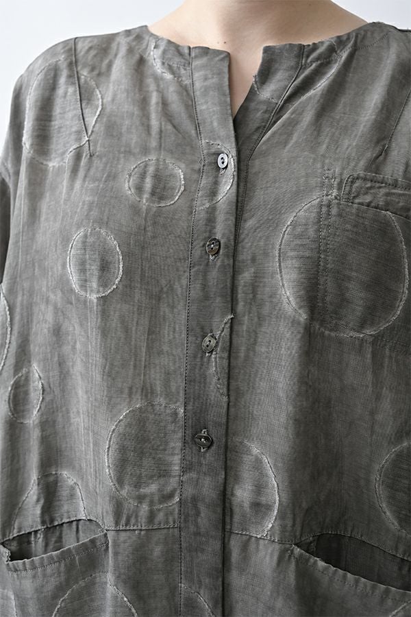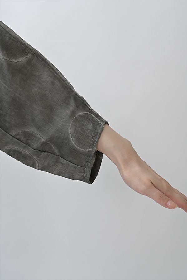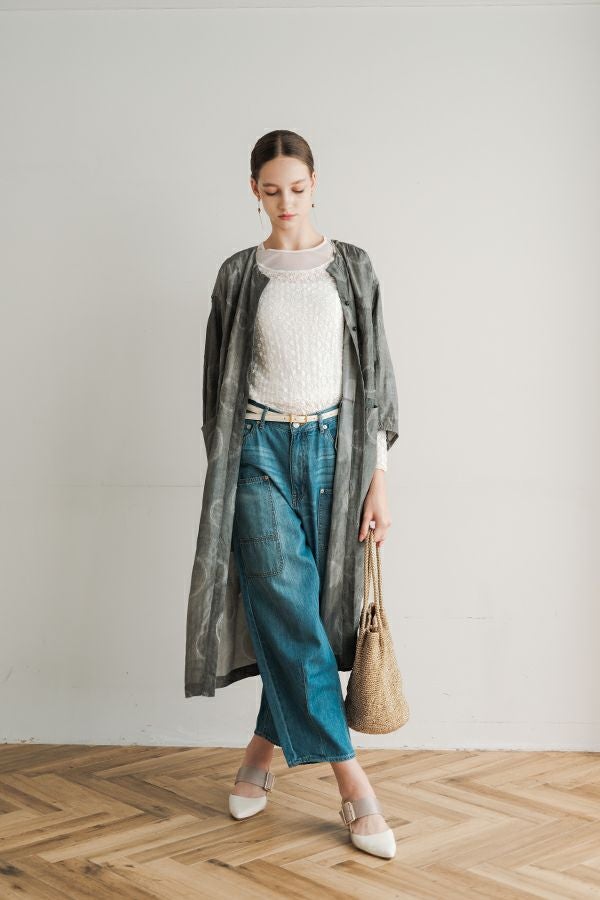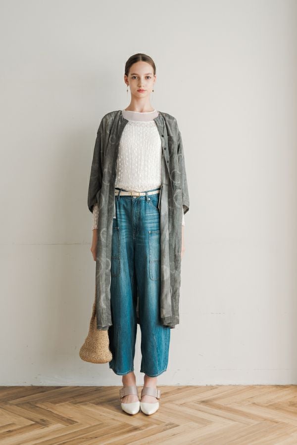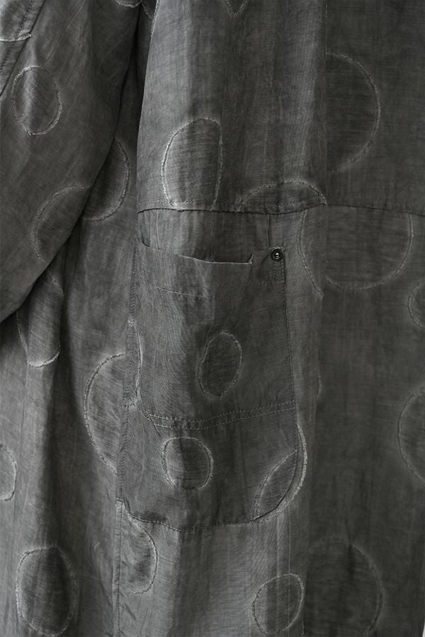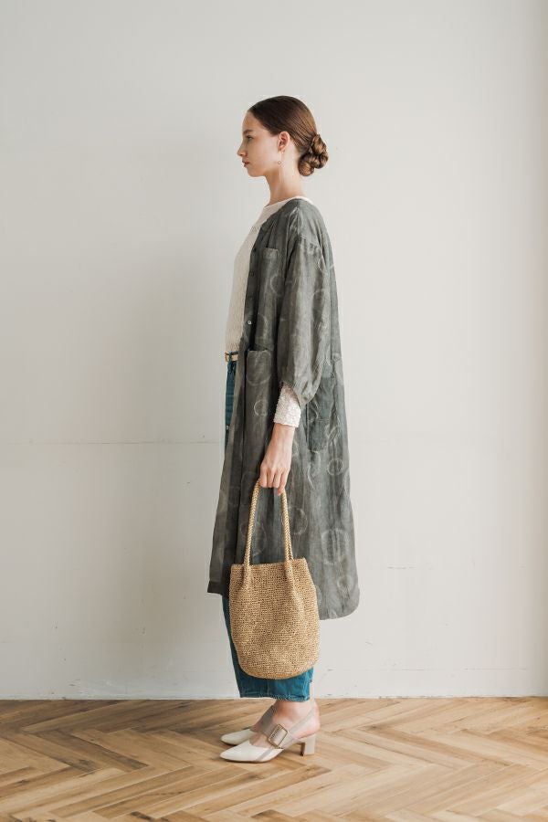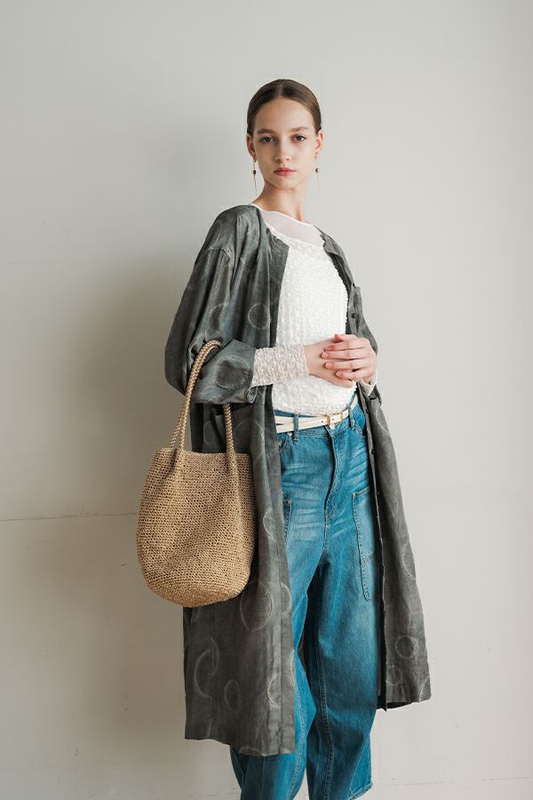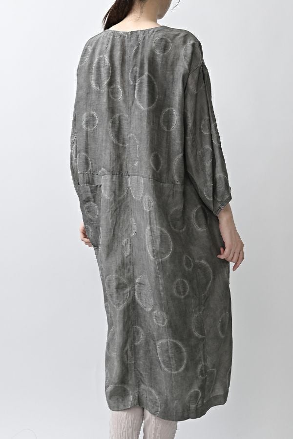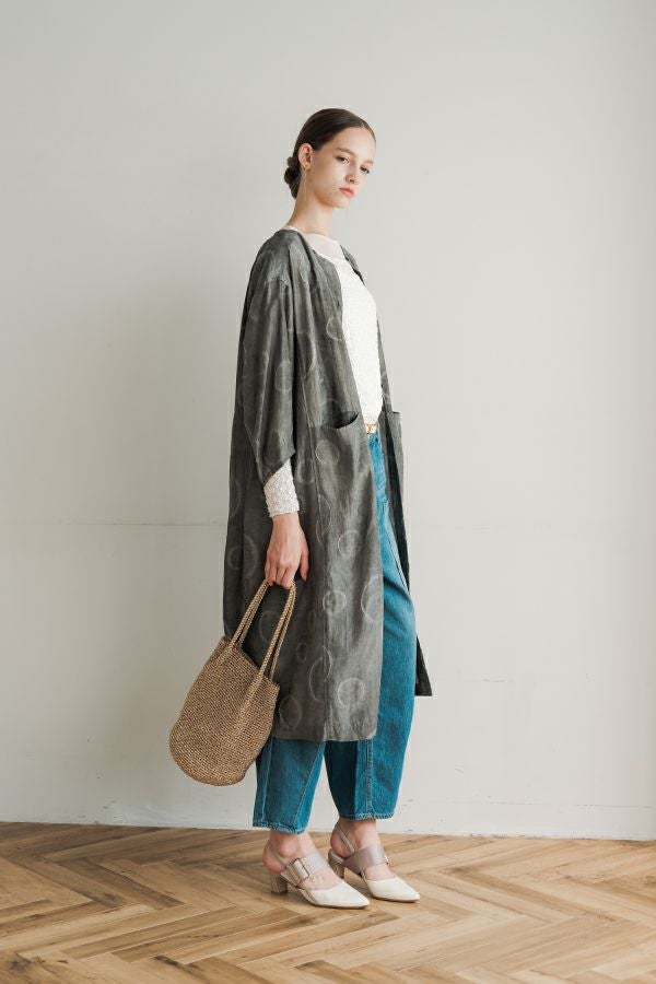 光沢と立体感が映える、大人モードなドットジャガードワンピース。 無地ベースに立体的な大きめドット柄を施したカットジャガードは、落ち感と上品な光沢が特徴で、オケージョンシーンにも映える一着。 ゆるやかなコクーンシルエットと、袖に丸みをもたせたフォルムがモードな印象をプラス。前を閉じればワンピースとして、前を開ければコート風としても着られる比翼開きデザインで、コーディネートの幅が広がります。 ワンピースとして楽しむ際はパンツと合わせて上品に。コート風に羽織る場合は、鮮やかな色のニットやカットソーを合わせ、カジュアルなパンツスタイルと組み合わせれば、大人の洗練されたカジュアルモードが完成します。 ●人気のドライタッチデニムワンピース(25158-2145F-R)と同型 ●手洗い可