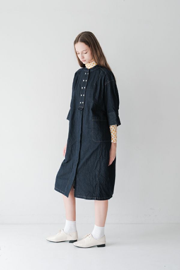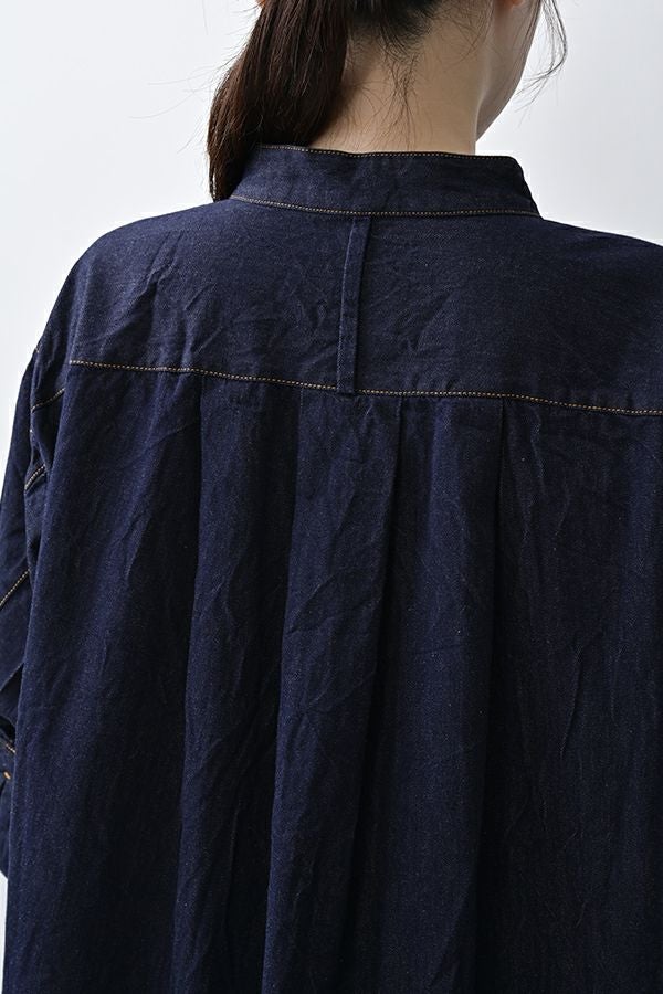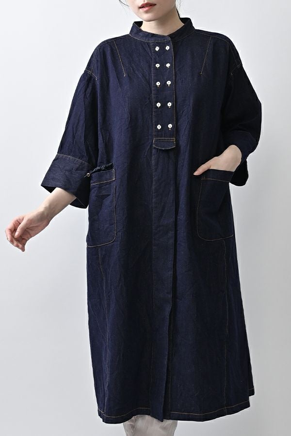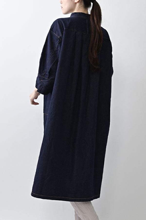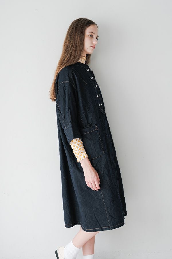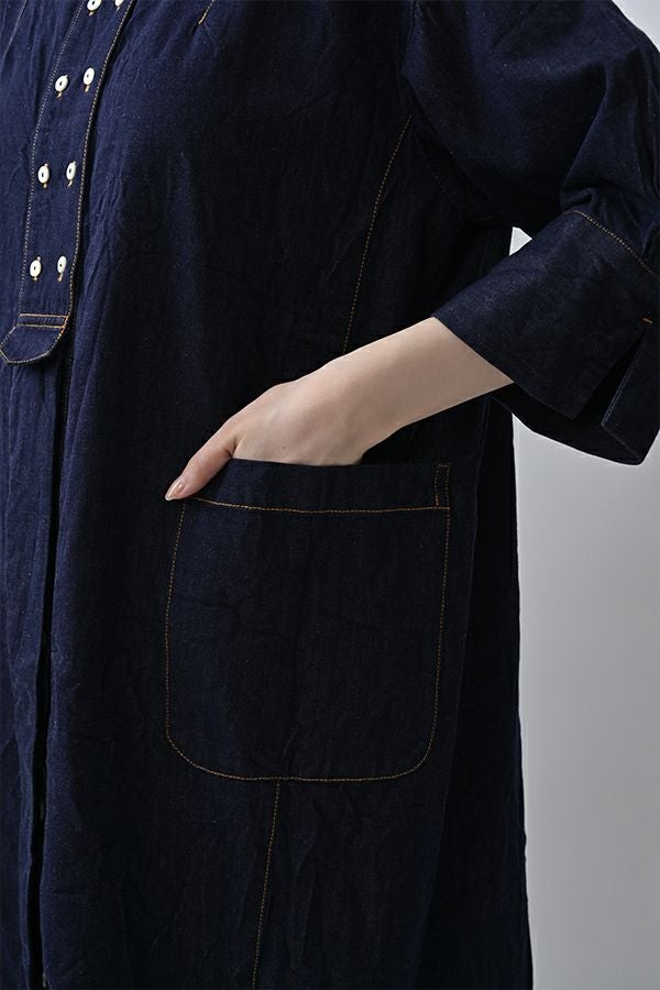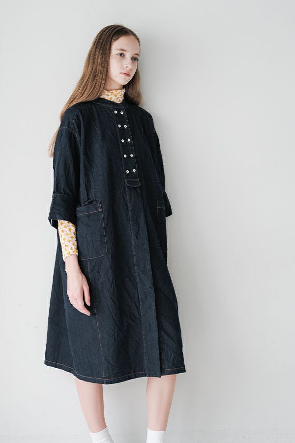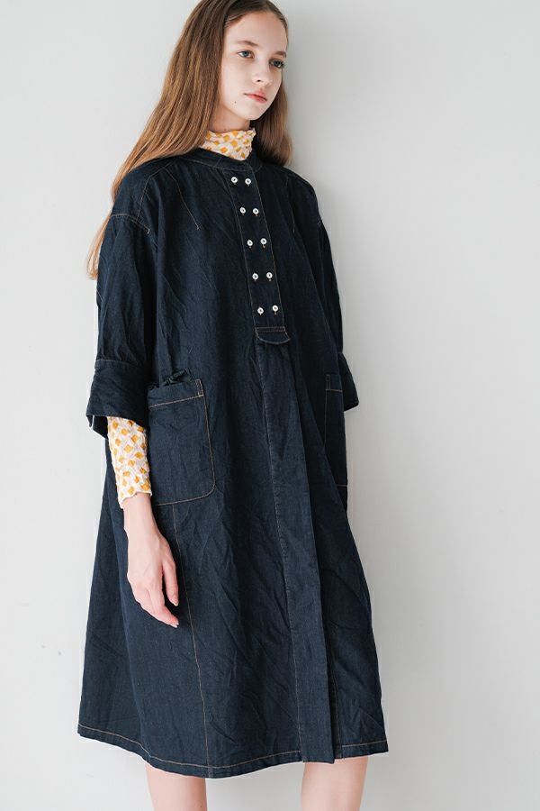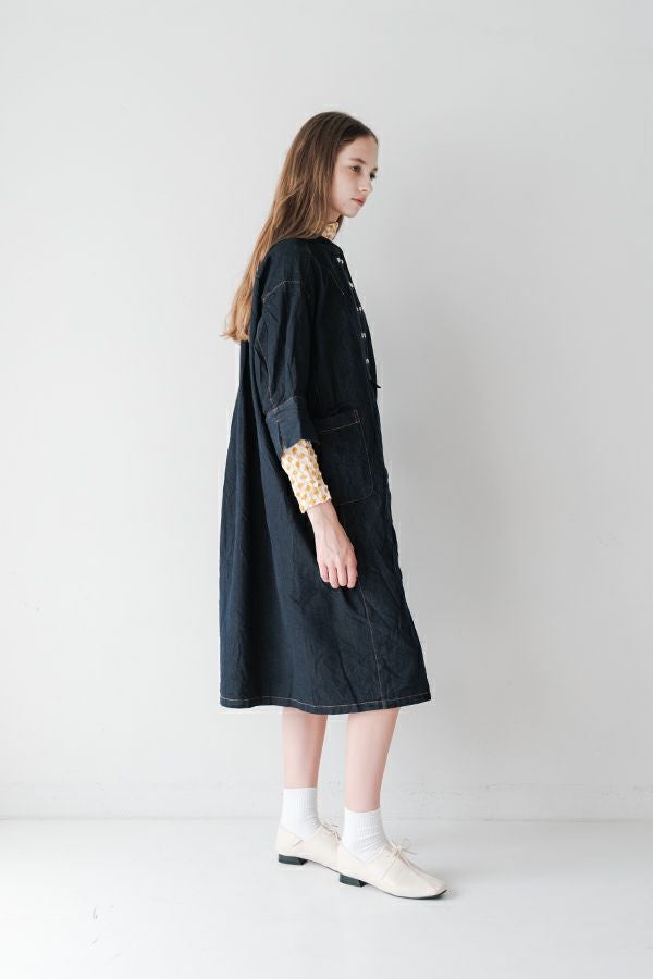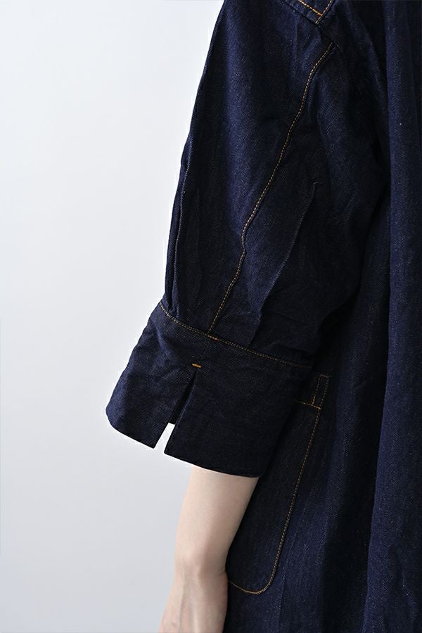 ヴィンテージの風合いを纏う、ドライタッチデニムシャツワンピース。 身デニムには珍しい、細かなワッシャー加工を丁寧に施し、ヴィンテージのこなれた雰囲気を再現。 akaneらしいオーバーシルエットながらも、前身頃のバイヤス切り替えが縦のラインを強調し、すっきりとした印象に。丸みを帯びた立体的なフォルムが、こなれ感と女性らしさを両立します。 袖口をラフに折り返して抜け感を出したり、前を開けてコート風に羽織るなど、スタイリングの幅も自在。 オリジナルのガーデンプリント切替スカート(26158-8772G-R)との組み合わせで、華やかさとモード感を併せ持つスタイルに仕上がります。 ●従来のインディゴ染めでなく色落ちしにくい反応染料で染めケアしやすいデニムです。家庭洗濯の場合、風合いが損なわれるので強くアイロンしないで下さい。