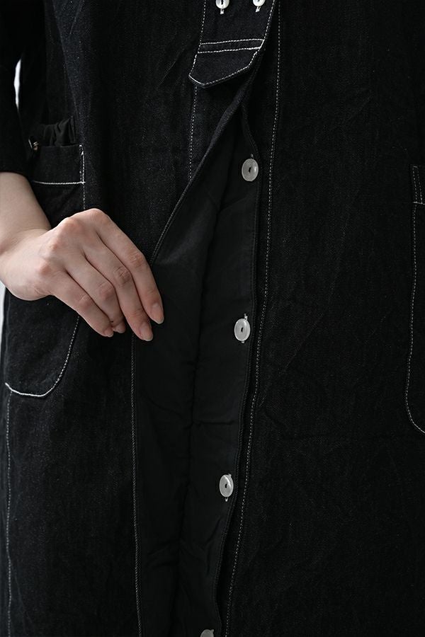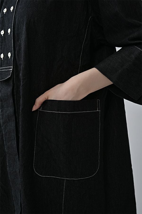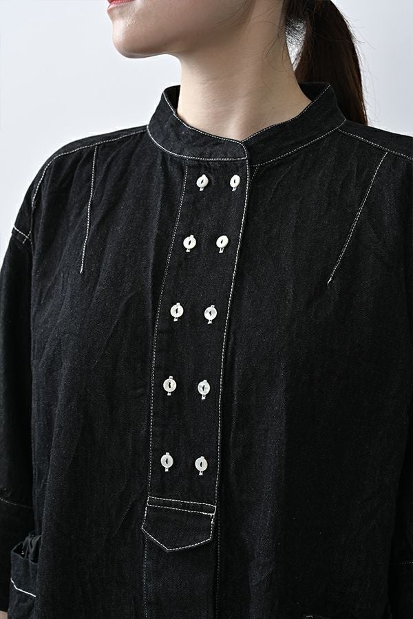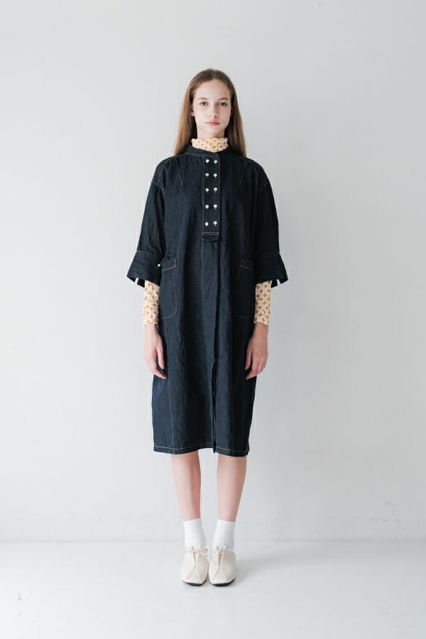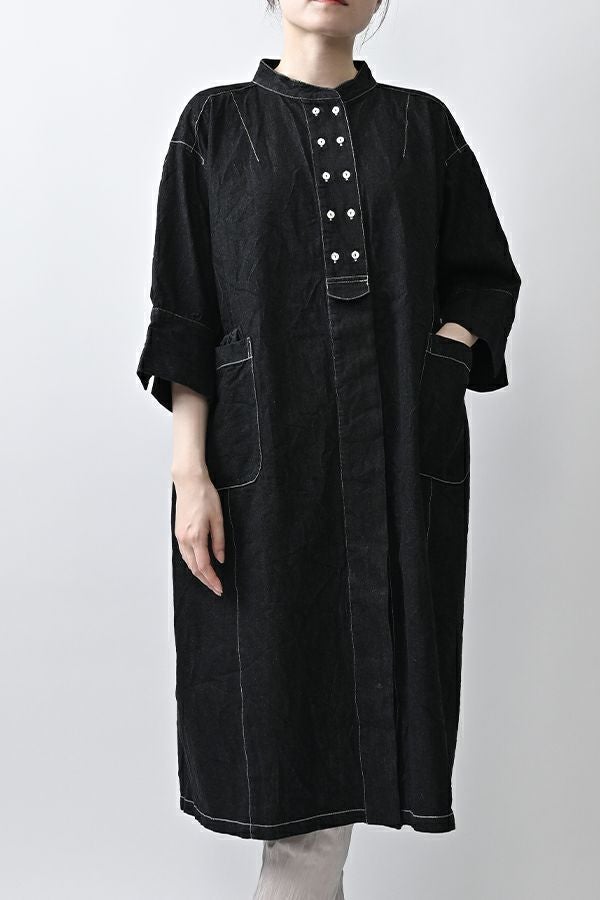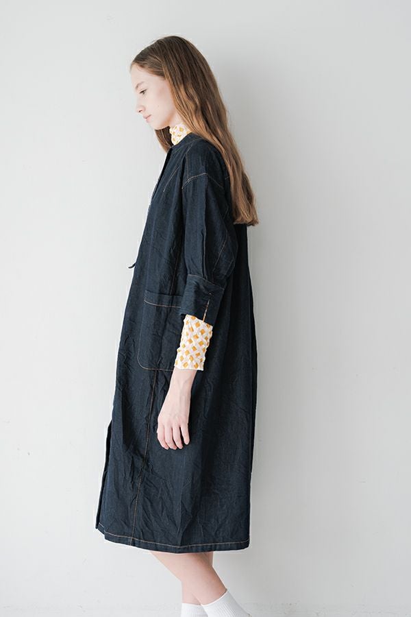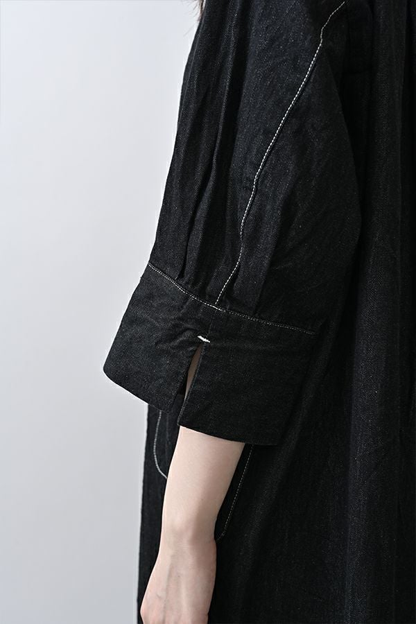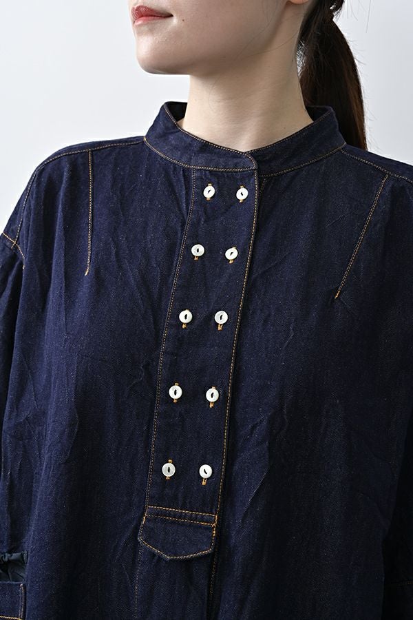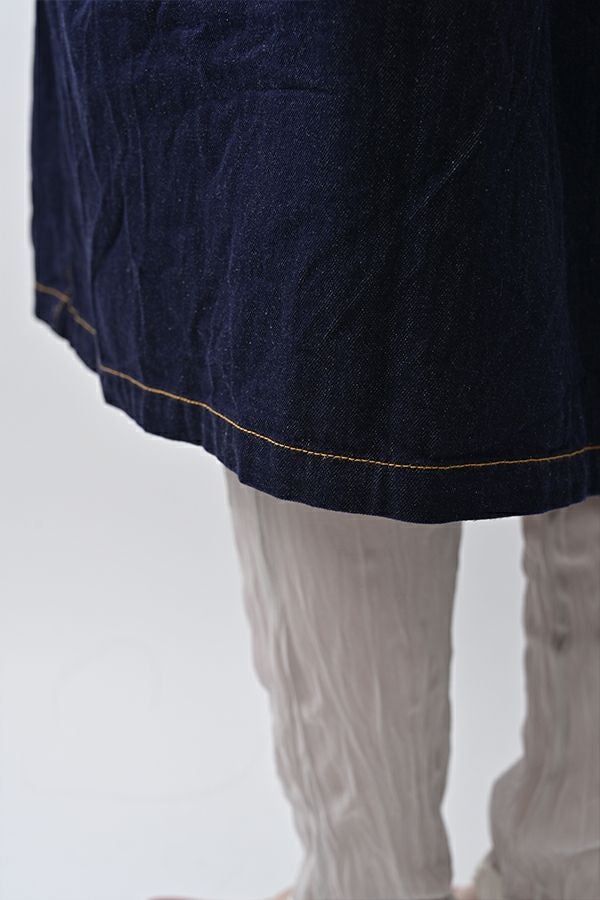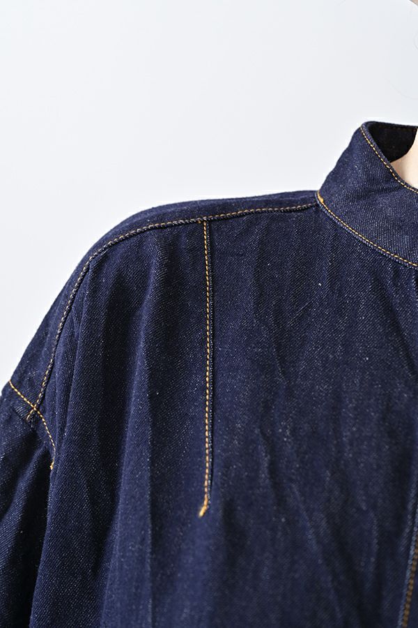 ヴィンテージの風合いを纏う、ドライタッチデニムシャツワンピース。 身デニムには珍しい、細かなワッシャー加工を丁寧に施し、ヴィンテージのこなれた雰囲気を再現。 akaneらしいオーバーシルエットながらも、前身頃のバイヤス切り替えが縦のラインを強調し、すっきりとした印象に。丸みを帯びた立体的なフォルムが、こなれ感と女性らしさを両立します。 袖口をラフに折り返して抜け感を出したり、前を開けてコート風に羽織るなど、スタイリングの幅も自在。 オリジナルのガーデンプリント切替スカート(26158-8772G-R)との組み合わせで、華やかさとモード感を併せ持つスタイルに仕上がります。 ●従来のインディゴ染めでなく色落ちしにくい反応染料で染めケアしやすいデニムです。家庭洗濯の場合、風合いが損なわれるので強くアイロンしないで下さい。