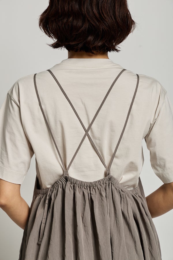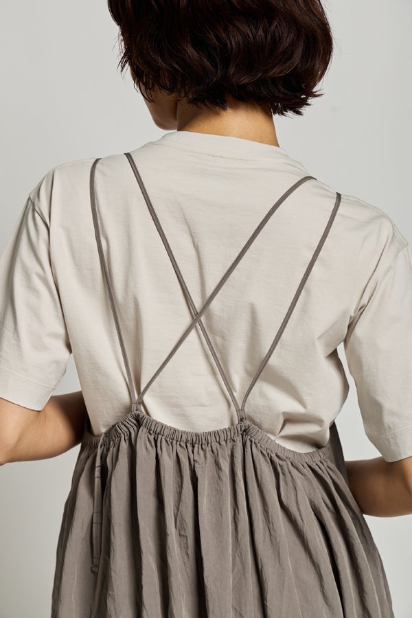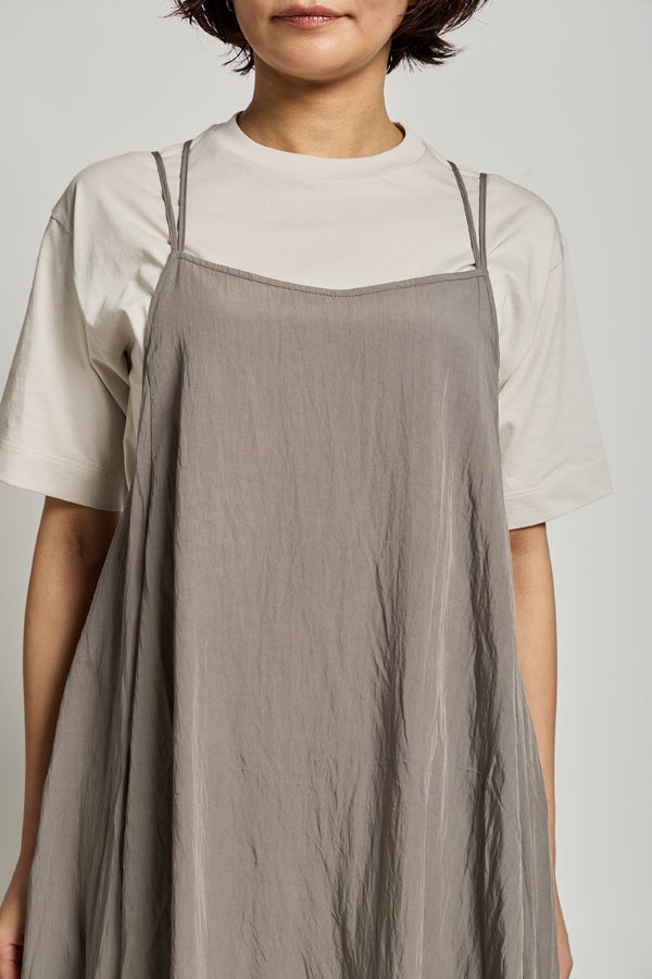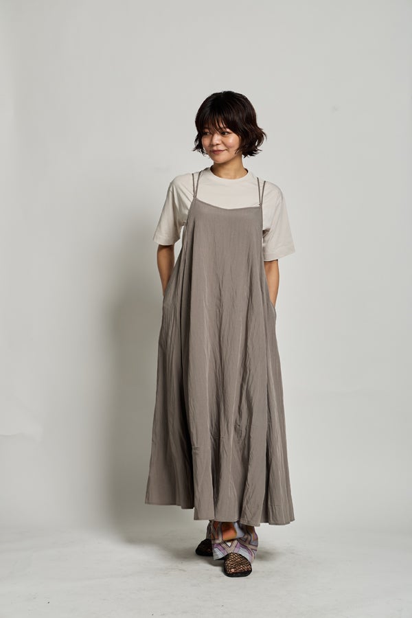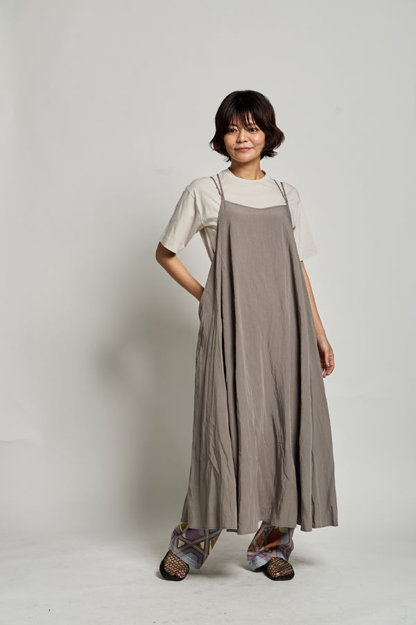 ※※ 追加が決定!!キャミソールワンピース(商品番号 25173-2351E )※※ バックシャンもお洒落に魅せる、大人っぽさを高めるキャミワンピース。 マットな光沢感と自然なシボ感で表情のある素材が印象的。春から秋まで着れ、3シーズン対応可能です。 蹴回し(裾回り寸)をたっぷりとった贅沢なフレアシルエットで、体のラインを拾わずストレスフリーな着心地です。華奢なストラップでワンピースの丈が2段階調節出来る仕様になっているのも嬉しいポイント。後ろ姿も抜かりなく、女性らしい印象を醸し出してくれます。 インナーにTシャツを重ねたり、上にGジャンやスプリングジャケットを羽織ったりと、着回しも様々楽しめます。春はロンTEE、夏は半袖プルオーバー、秋はハイネックプルオーバーと、季節によって旬のレイヤードを楽しんで下さい。 ●同型でプリントタイプ(25173-2352E)も有
