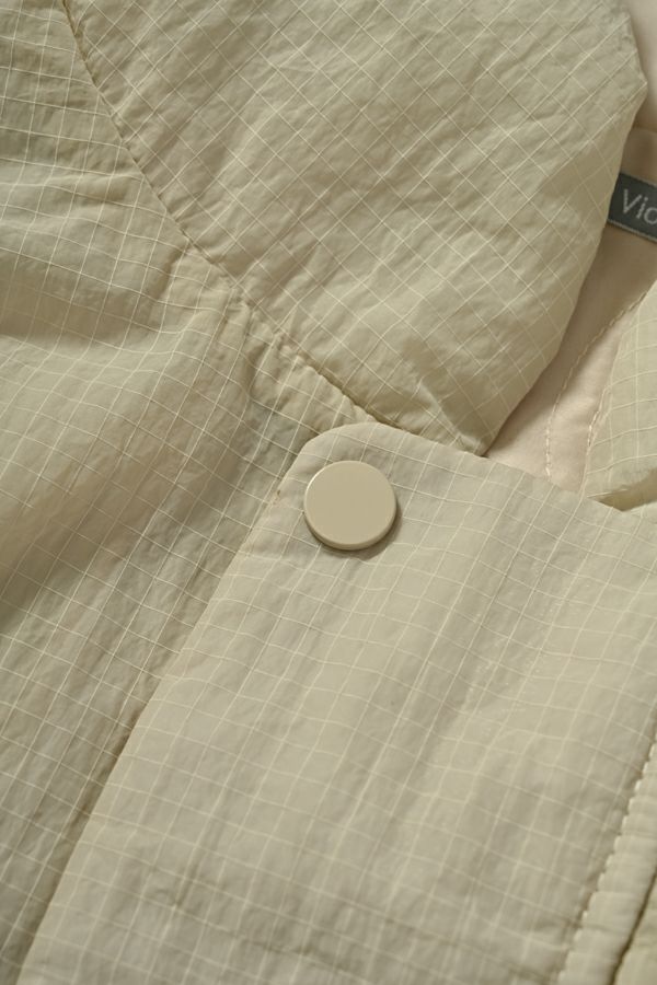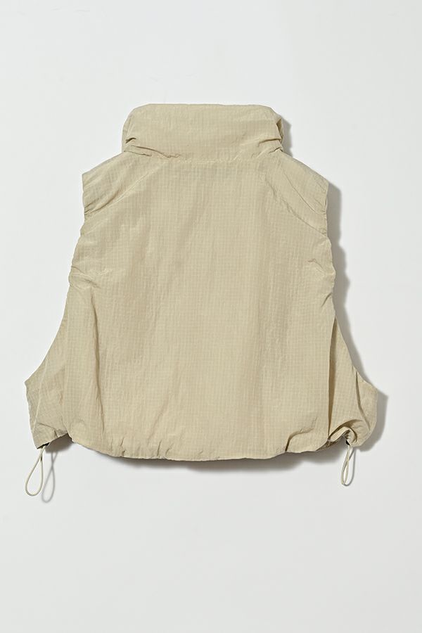 重ねるほどに新しい表情、レイヤード上手なショートベスト。 短め丈とボリューム感のあるシルエットが魅力のアイテム。ロングシャツやスウェット、アウターの上にも重ねられる大きめのアームホールで、着こなしの幅がぐんと広がります。レイヤードスタイルに奥行きを生む、まさに「重ねるための」一着です。 大きめにデザインされたスタンドカラーには程よい膨らみがあり、顔まわりに立体感とあたたかみをプラス。胸元には、シームに沿った目立ちにくいポケットを配置し、上品な佇まいを損なうことなく収納性を確保。裾のドローコードを絞ることで、シルエットに変化をつけて楽しめます。 素材には、軽やかで撥水性のあるナイロンリップストップを採用。 ナイロンならではのほのかな光沢感としなやかさがあり、アウトドアライクになりすぎず、日常のスタイリングにもすんなり馴染みます。薄手ながらも中綿入りで保温性にも優れ、寒暖差のある季節の強い味方に。トレンド感を取り入れつつも、上品で使いやすい。そんな大人のレイヤードスタイルにフィットする、着回し力の高い一着です。