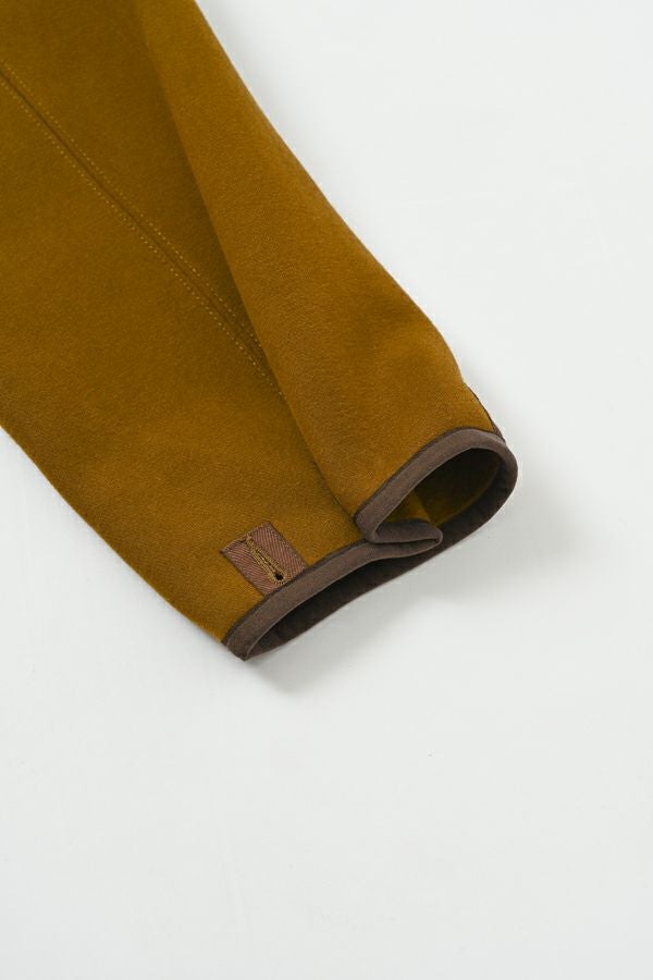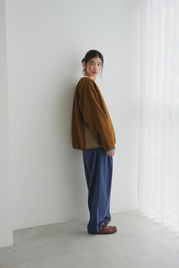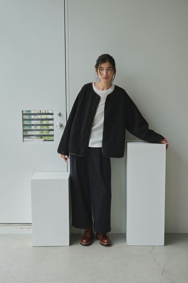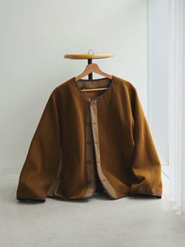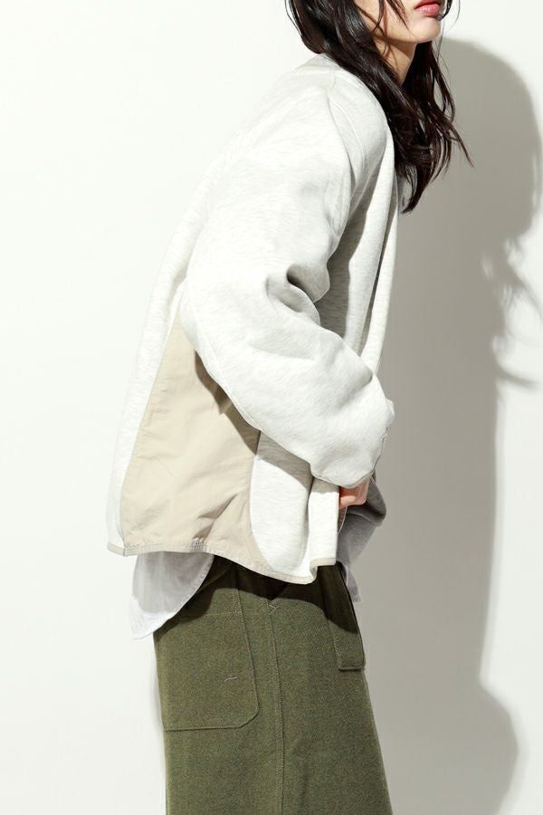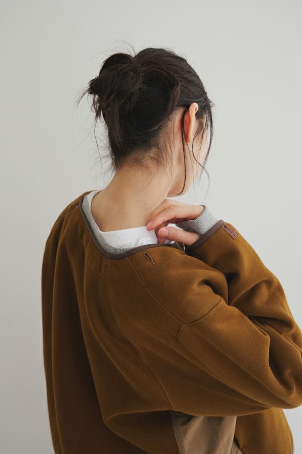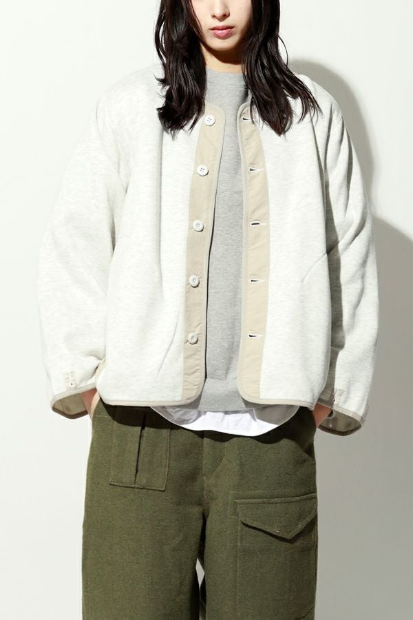 冬の装いに、ハンサムな温もりを。機能美が映えるライナーカーディガン。 ライナージャケットの無骨な魅力を、上質な裏毛素材でクリーンに昇華。しっかりとした地厚の裏毛にピーチ起毛を施すことで、ほんのりとした光沢感とスウェードのような質感を生み出し、冬の装いに温もりと高級感を添えてくれます。 オーバーサイズながら、袖まわりはすっきりと。インナーとしても着られる絶妙なサイジングで、幅広い着こなしに対応します。アームホールは広めなので、厚手のニットの上からもレイヤード可能。脇の布帛切り替えや、前後で異なる仕様に切り替えた袖の構造など、見た目と可動性を両立した拘りのシルエットです。 ミリタリー由来のディテールもさりげないアクセントに。ライナーの名残を感じさせるボタンホール仕様の袖口は、留める位置でシルエットの変化も楽しめます。 デイリーに馴染みながら、どこか都会的。そんなハンサムな一枚です。