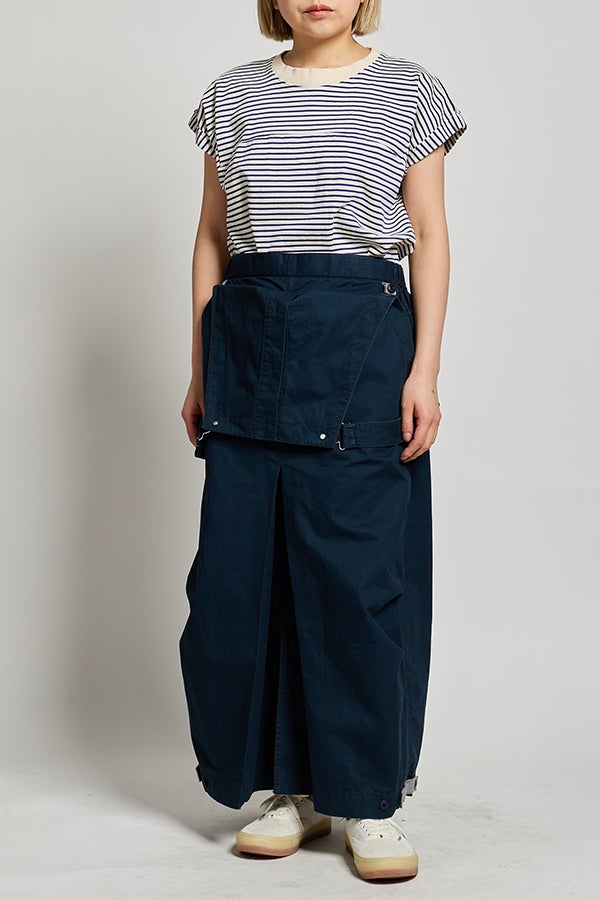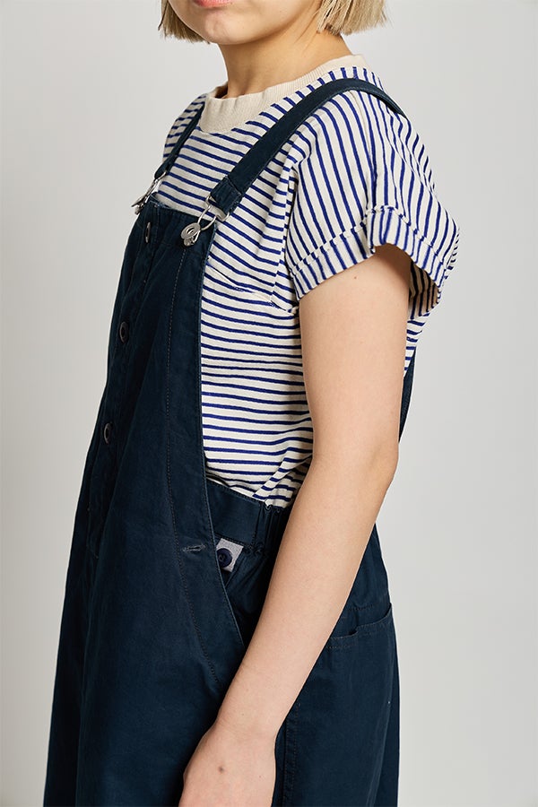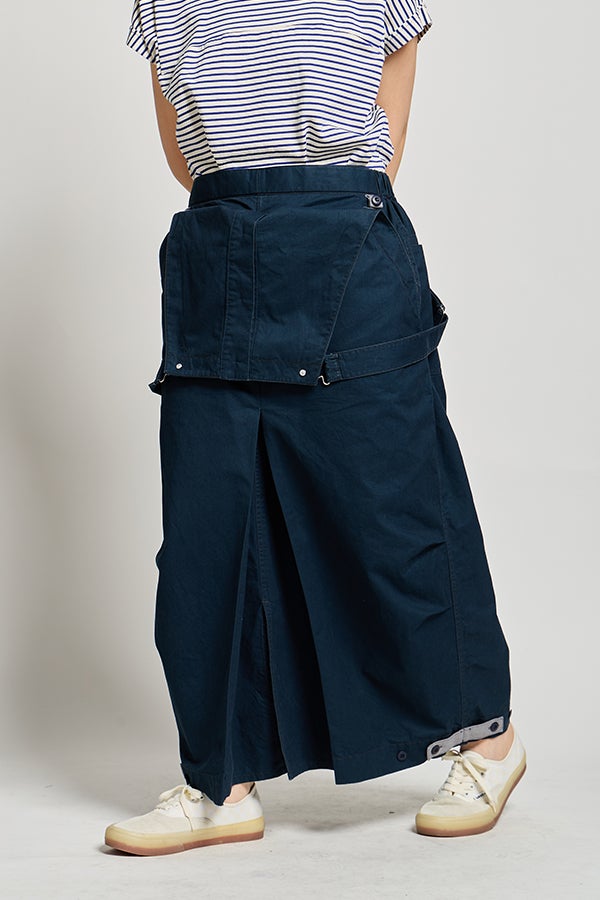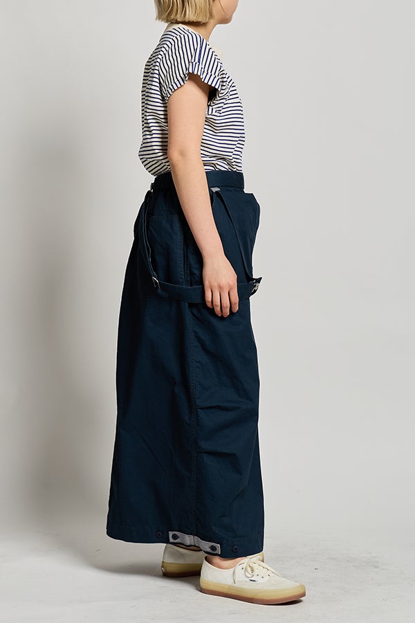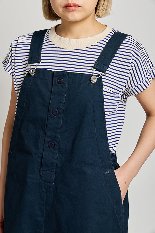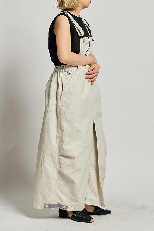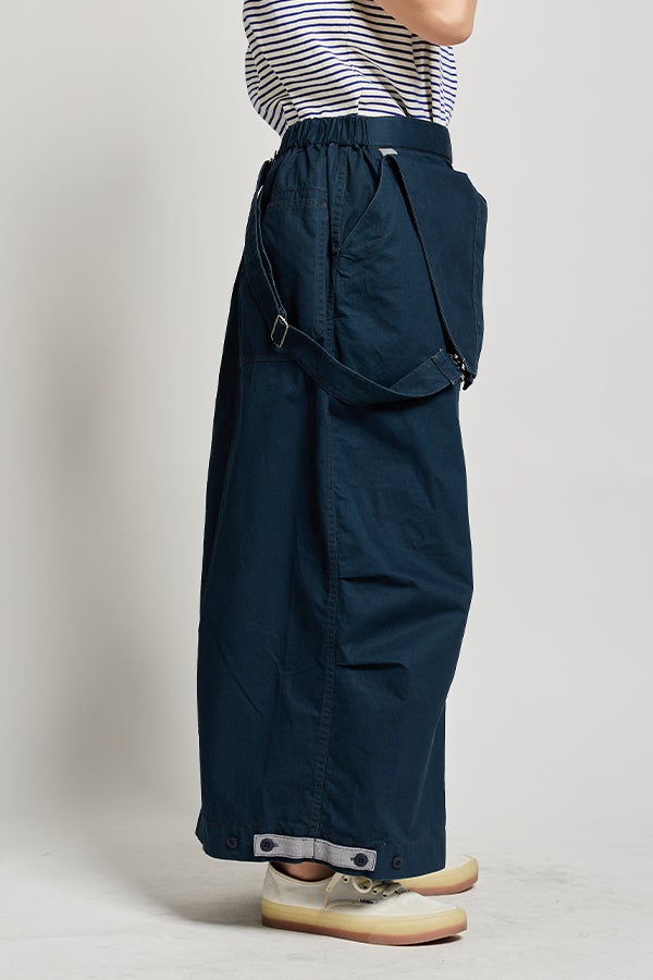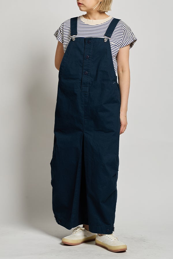ボトムのような佇まいで着る、ジャンバースカート。 裾に向かって緩やかに細くなる変形シルエット。フロントに施したタックが立体感を生み、ジャンバースカートでありながらボトムを穿いているような印象に。胸当てを下ろした着こなしも想定し、スタイリングに余白を持たせた設計に仕上げています。 素材には、着込んだような色ムラの表情が楽しめるウェザー生地を使用。さらにバイオ加工を施すことで、着込んだような柔らかさと自然な風合いをプラス。ほどよいラフさがありながら、日常に馴染む落ち着いた質感が魅力です。 デザインソースはUS NAVYのデッキパンツ。本来は無骨なオーバーオールのディテールを、ジャンバースカート型へと再構築し、女性らしいバランスへと昇華。ワークの空気を残しながら、軽やかに取り入れられる一着です。
