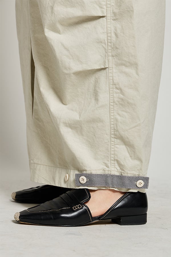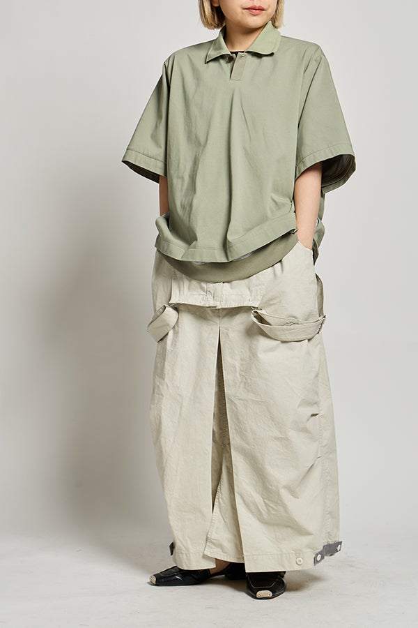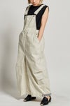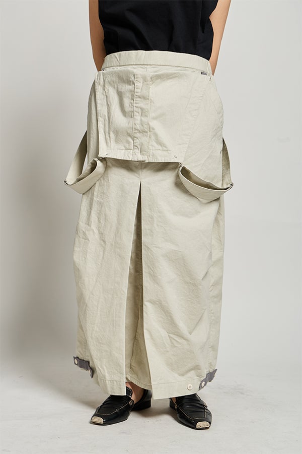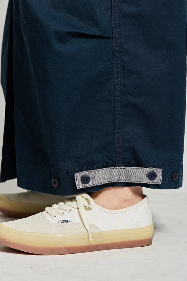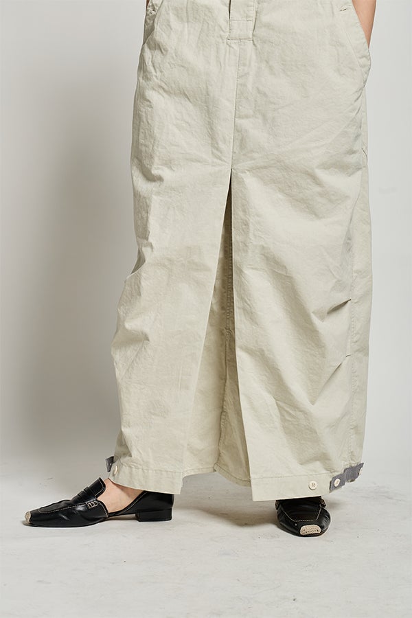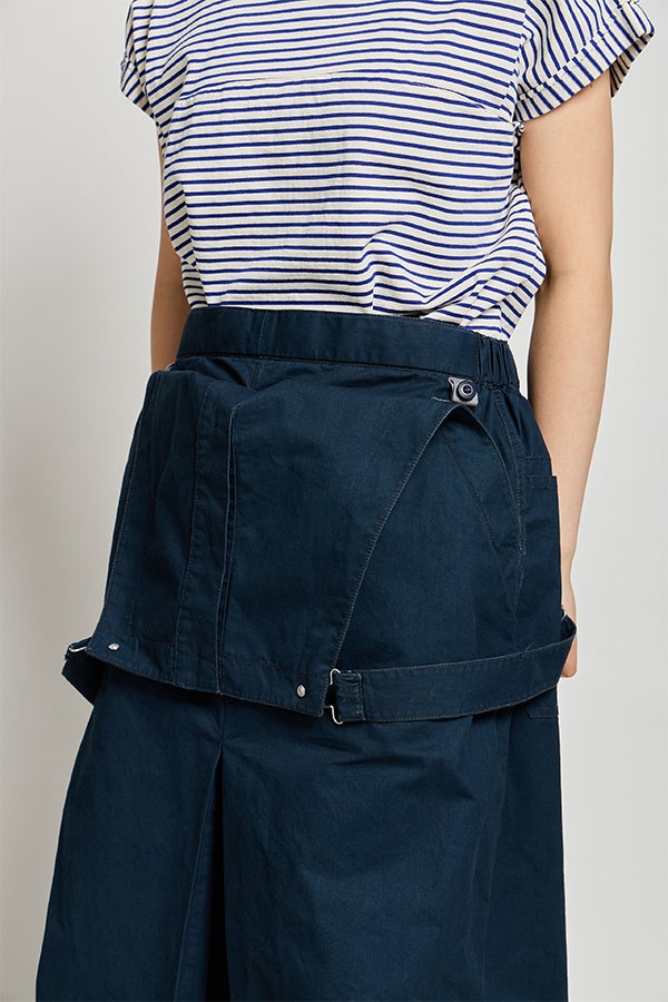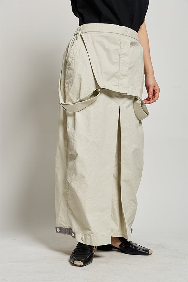 ボトムのような佇まいで着る、ジャンバースカート。 裾に向かって緩やかに細くなる変形シルエット。フロントに施したタックが立体感を生み、ジャンバースカートでありながらボトムを穿いているような印象に。胸当てを下ろした着こなしも想定し、スタイリングに余白を持たせた設計に仕上げています。 素材には、着込んだような色ムラの表情が楽しめるウェザー生地を使用。さらにバイオ加工を施すことで、着込んだような柔らかさと自然な風合いをプラス。ほどよいラフさがありながら、日常に馴染む落ち着いた質感が魅力です。 デザインソースはUS NAVYのデッキパンツ。本来は無骨なオーバーオールのディテールを、ジャンバースカート型へと再構築し、女性らしいバランスへと昇華。ワークの空気を残しながら、軽やかに取り入れられる一着です。