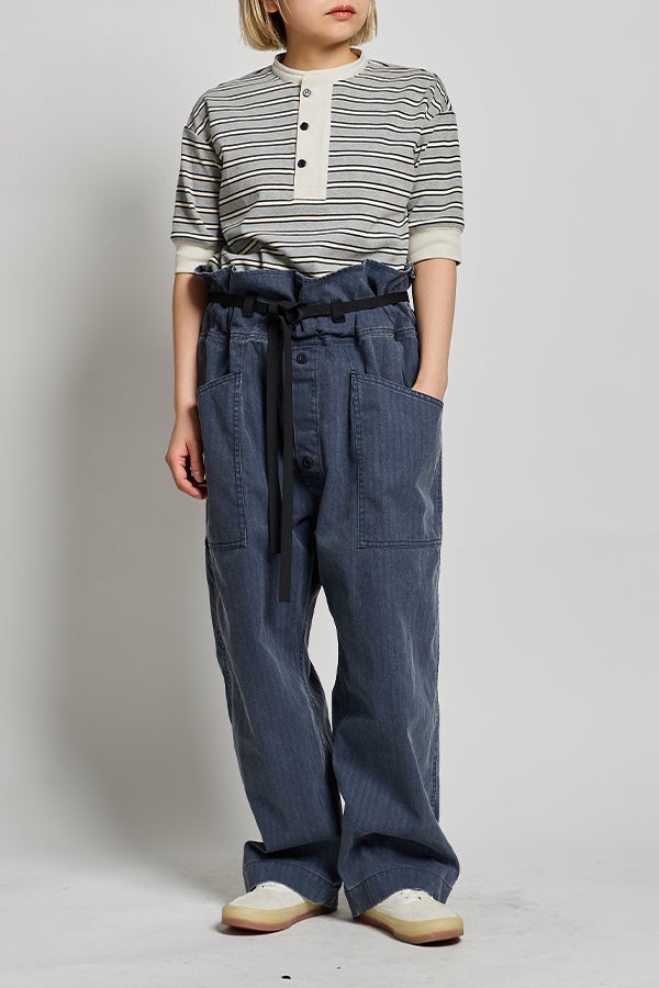 ゆったりとしたテーパードシルエットに、どこかリメイクの記憶を残した一本。少しハイウエスト気味に穿くことで、腰周りにニュアンスが生まれ、ラフさの中に輪郭のあるバランスを描き出します。
