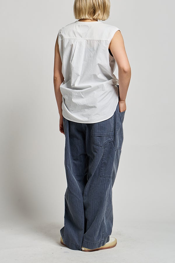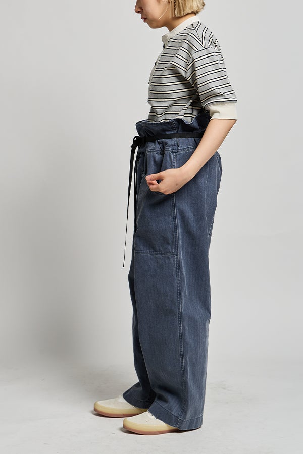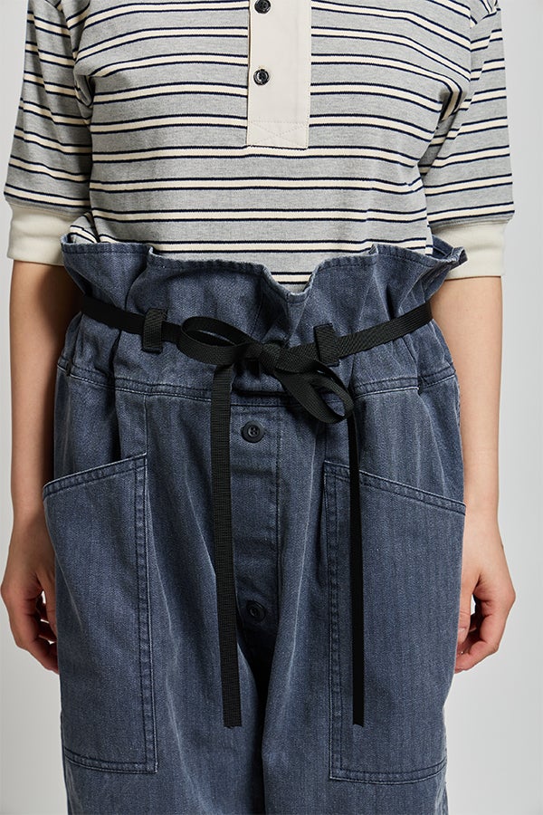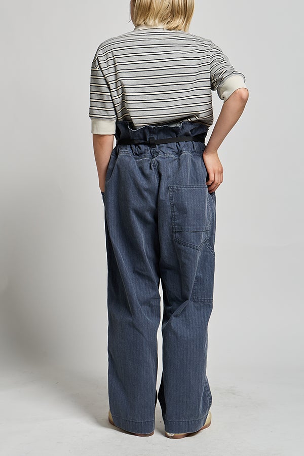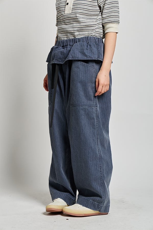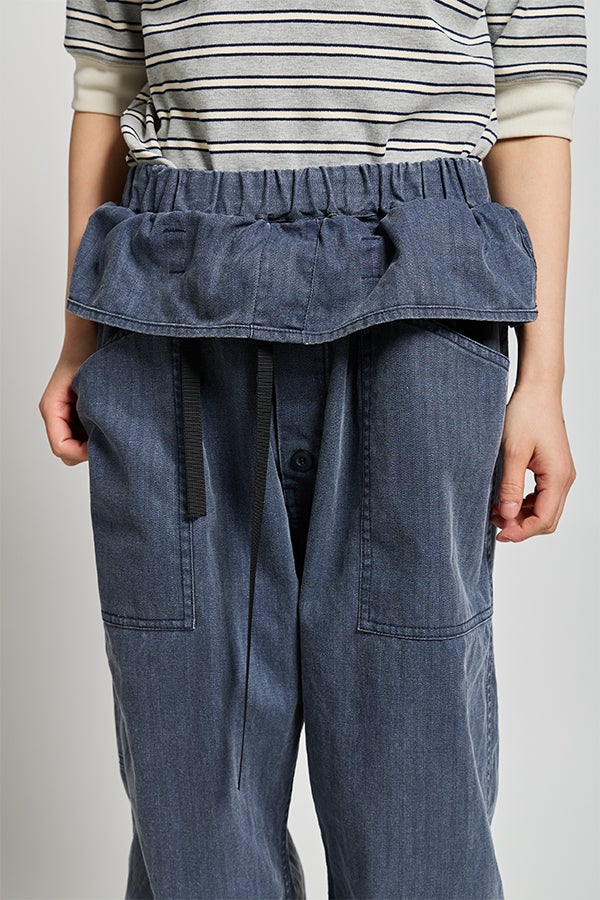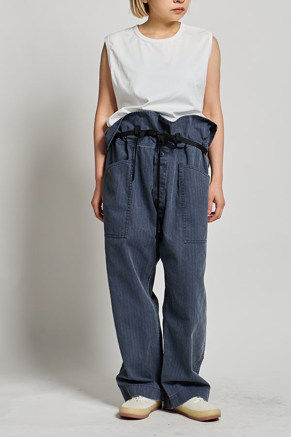 デザインは80年代のメカニックオーバーオールをベースに、オールインワンを解体したかのようなリメイク風の構成。上半身の名残をあえて残し、ハイウエスト風にも、当て布を下ろした着こなしにも対応する自由度の高い仕様。内側には帯を設け、ウエストを絞っても安心して着用できる設計に。