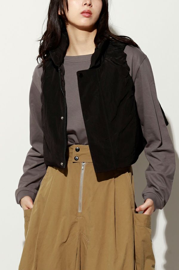 重ねるほどに新しい表情、レイヤード上手なショートベスト。 短め丈とボリューム感のあるシルエットが魅力のアイテム。ロングシャツやスウェット、アウターの上にも重ねられる大きめのアームホールで、着こなしの幅がぐんと広がります。レイヤードスタイルに奥行きを生む、まさに「重ねるための」一着です。 大きめにデザインされたスタンドカラーには程よい膨らみがあり、顔まわりに立体感とあたたかみをプラス。胸元には、シームに沿った目立ちにくいポケットを配置し、上品な佇まいを損なうことなく収納性を確保。裾のドローコードを絞ることで、シルエットに変化をつけて楽しめます。 素材には、軽やかで撥水性のあるナイロンリップストップを採用。 ナイロンならではのほのかな光沢感としなやかさがあり、アウトドアライクになりすぎず、日常のスタイリングにもすんなり馴染みます。薄手ながらも中綿入りで保温性にも優れ、寒暖差のある季節の強い味方に。トレンド感を取り入れつつも、上品で使いやすい。そんな大人のレイヤードスタイルにフィットする、着回し力の高い一着です。