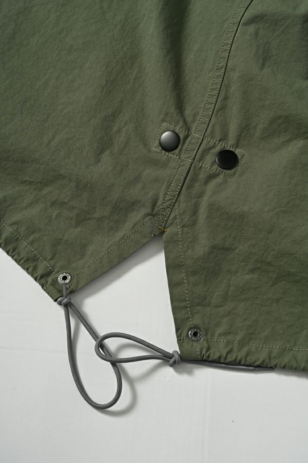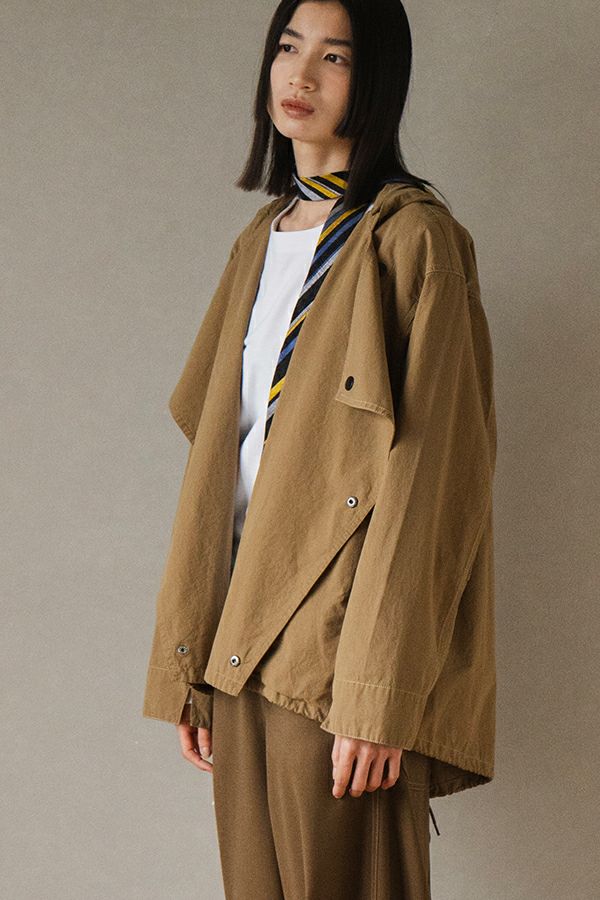 ミリタリーを今の気分で、ドレープが揺れるショートモッズパーカー。 適度なハリ感にあるミリタリー素材を着古感がでるように加工しています。洗いをかけることで、柔らかさが出て、ソフトな肌触りに。 縫製には、かつてのワーク&ミリタリーウェアに宿る、糸を交換する手間を省略するために細く長い糸を使用し強度を増すため2本取りにした“効率と工夫”のストーリーをインスピレーションにしたステッチデザインを採用。巻き縫いミシンや二本取りステッチが、無骨な雰囲気と共に、見えない手間の美しさを感じさせてくれます。