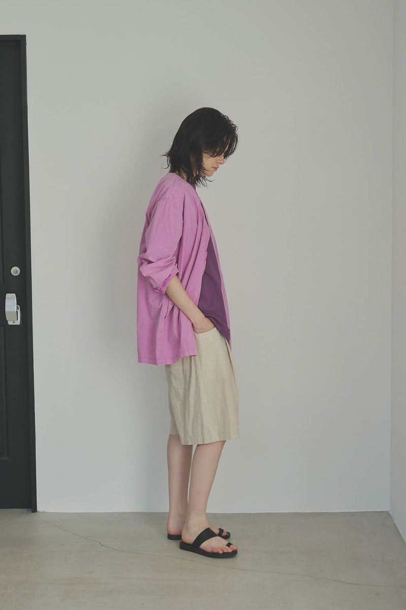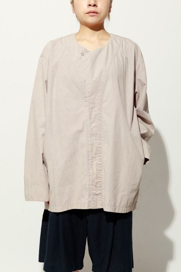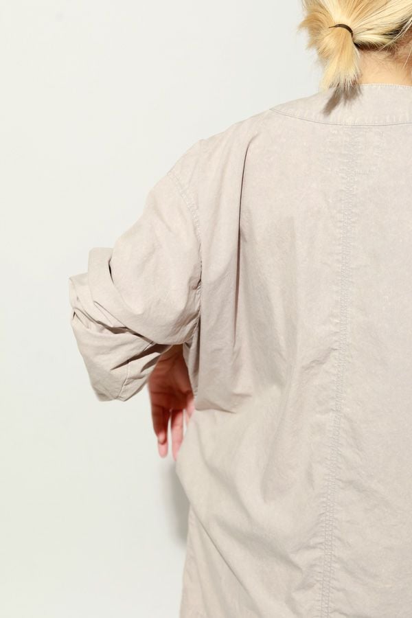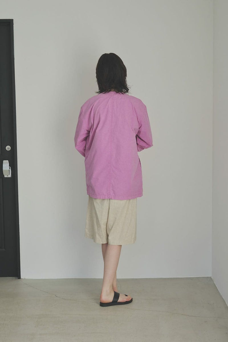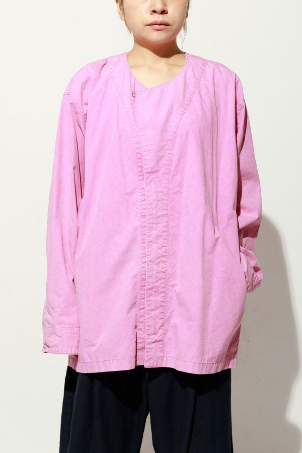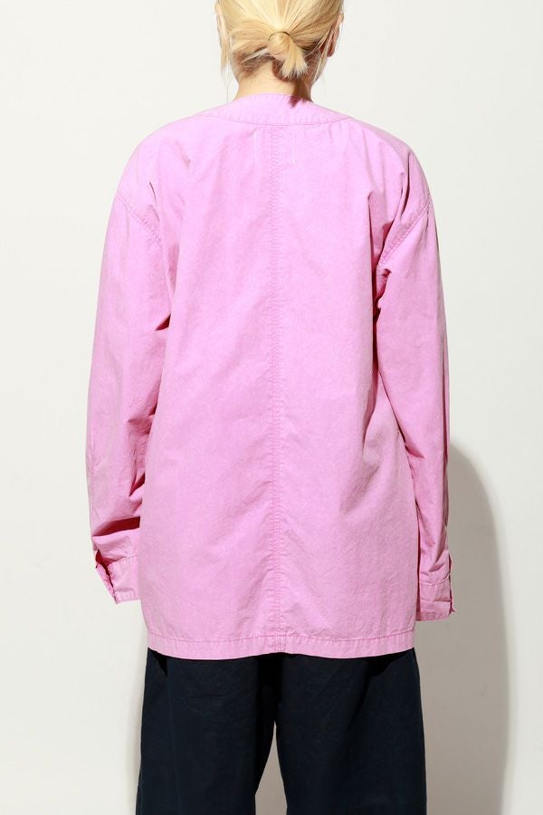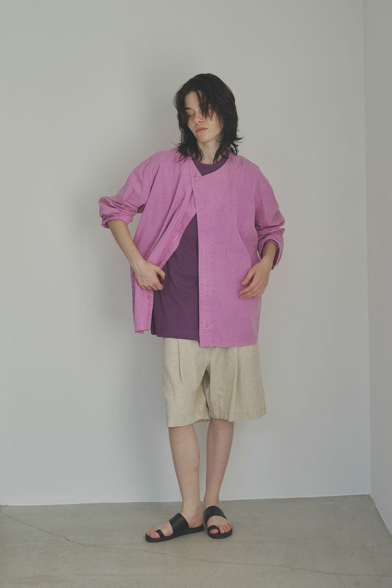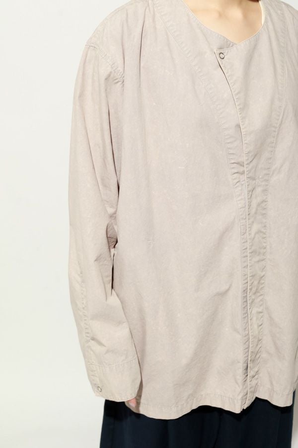 羽織るだけで完成、大人のノーカラーシャツジャケット。 ゆったりとしたシルエットのノーカラーシャツ。シンプルながらもケミカル加工で独特な風合いをプラスし、フロントファスナーを閉めればジャケット感覚で着られる1枚です。袖はダーツとスリットで立体感を生み、腕の動きやすさにも配慮しました。 素材にはハリ感のあるブロードを使用しつつ、ケミカル加工によって柔らかさと独特なカラーを表現。色落ち感のあるピンクやグレーなどが、軽やかで爽やかな印象を演出します。 全体のハリ感を残しながらも、着心地の良い柔らかさを両立させた大人のシャツジャケットです。